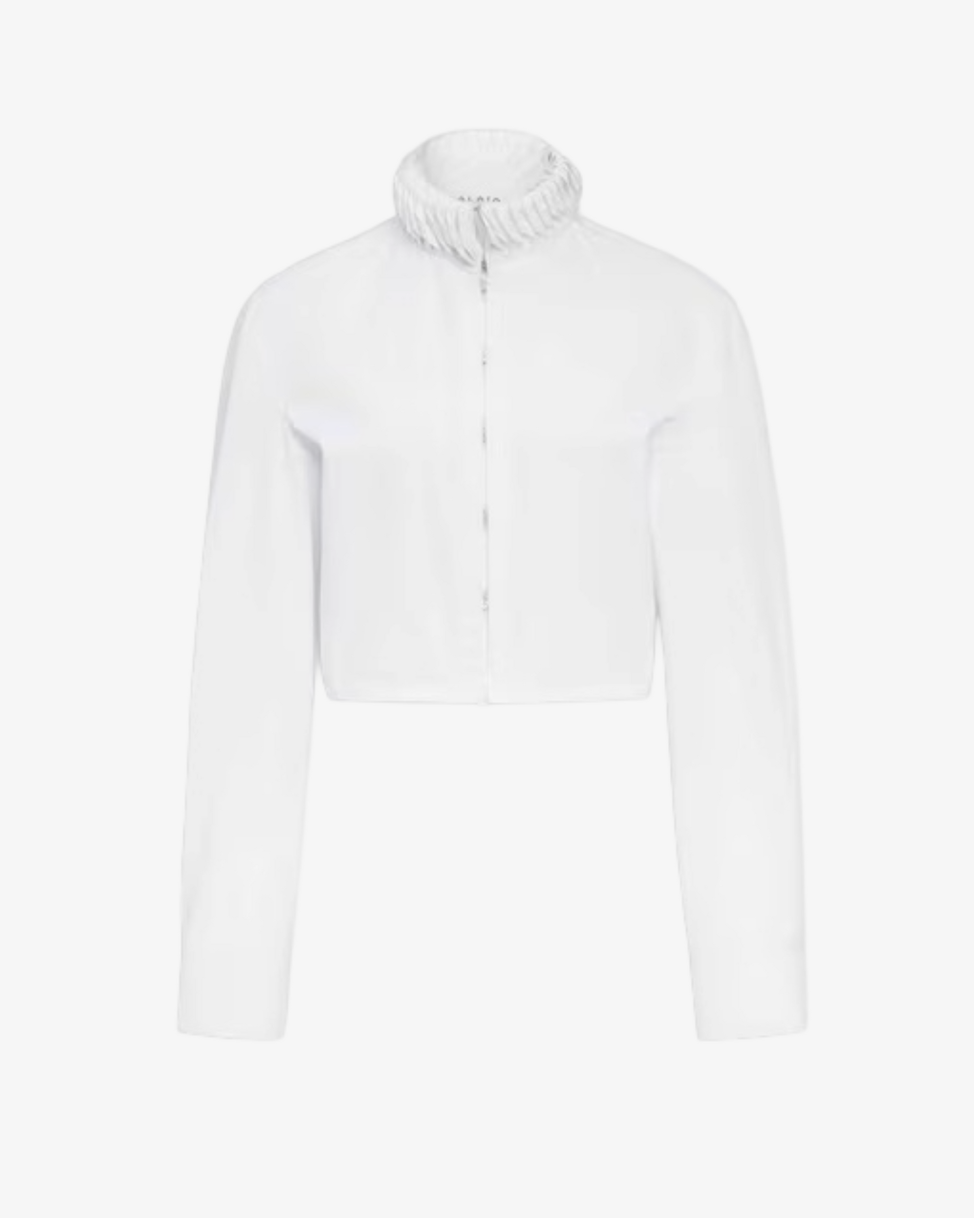 High neck cropped blouse in cotton poplinLong sleeves, shirt collar trimmed with twisted details, hidden button closureFitted cutMade in Italy