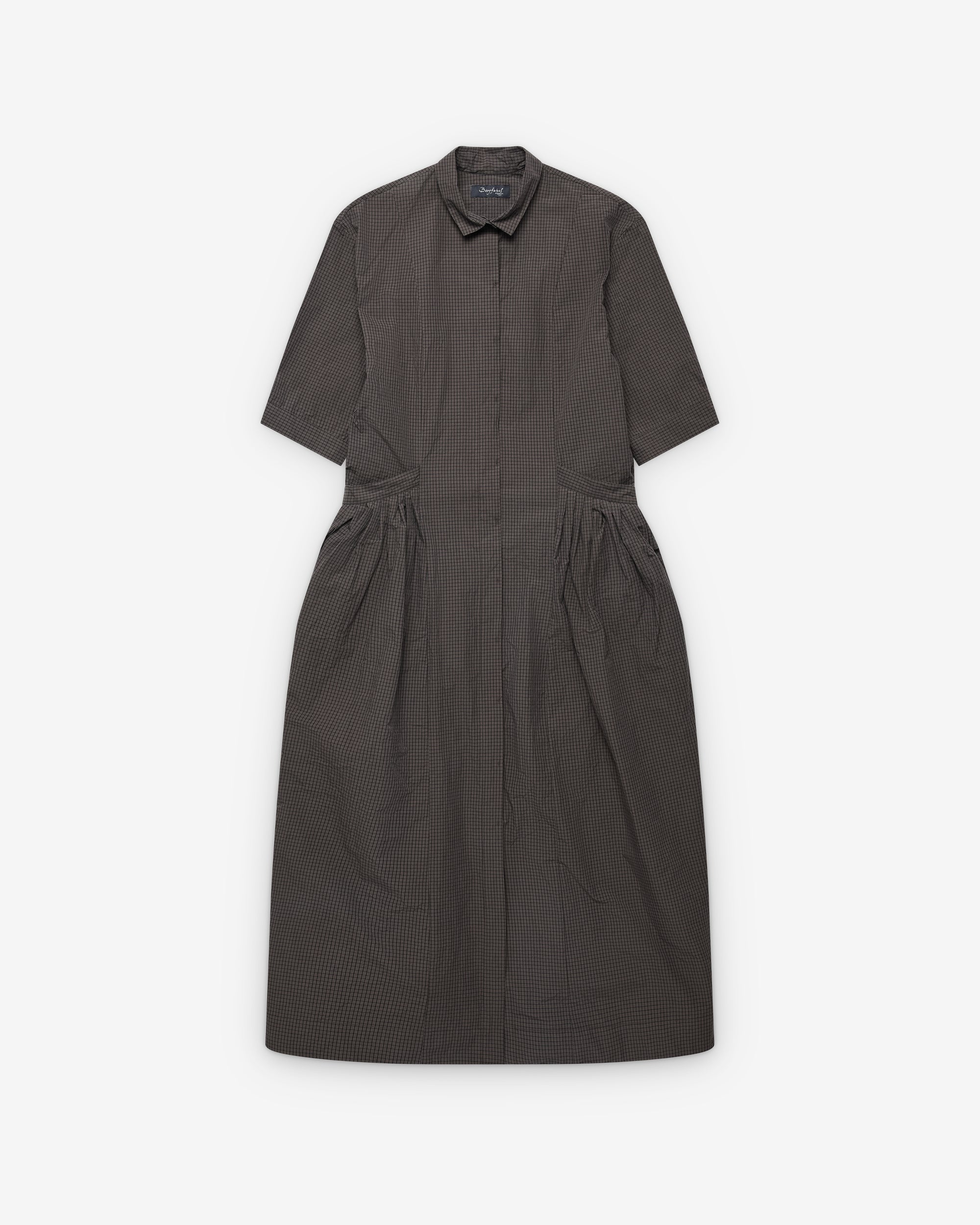 Point collarShort sleevesGathered detail at waistConcealed button placketMid lengthAll over check pattern