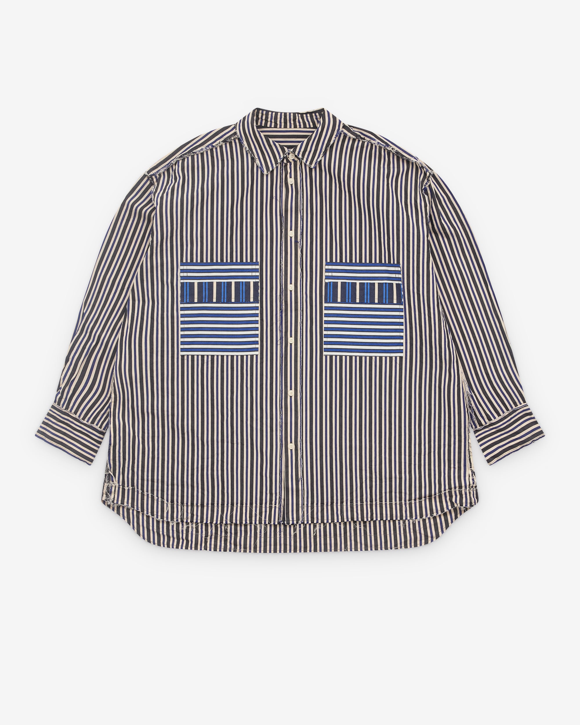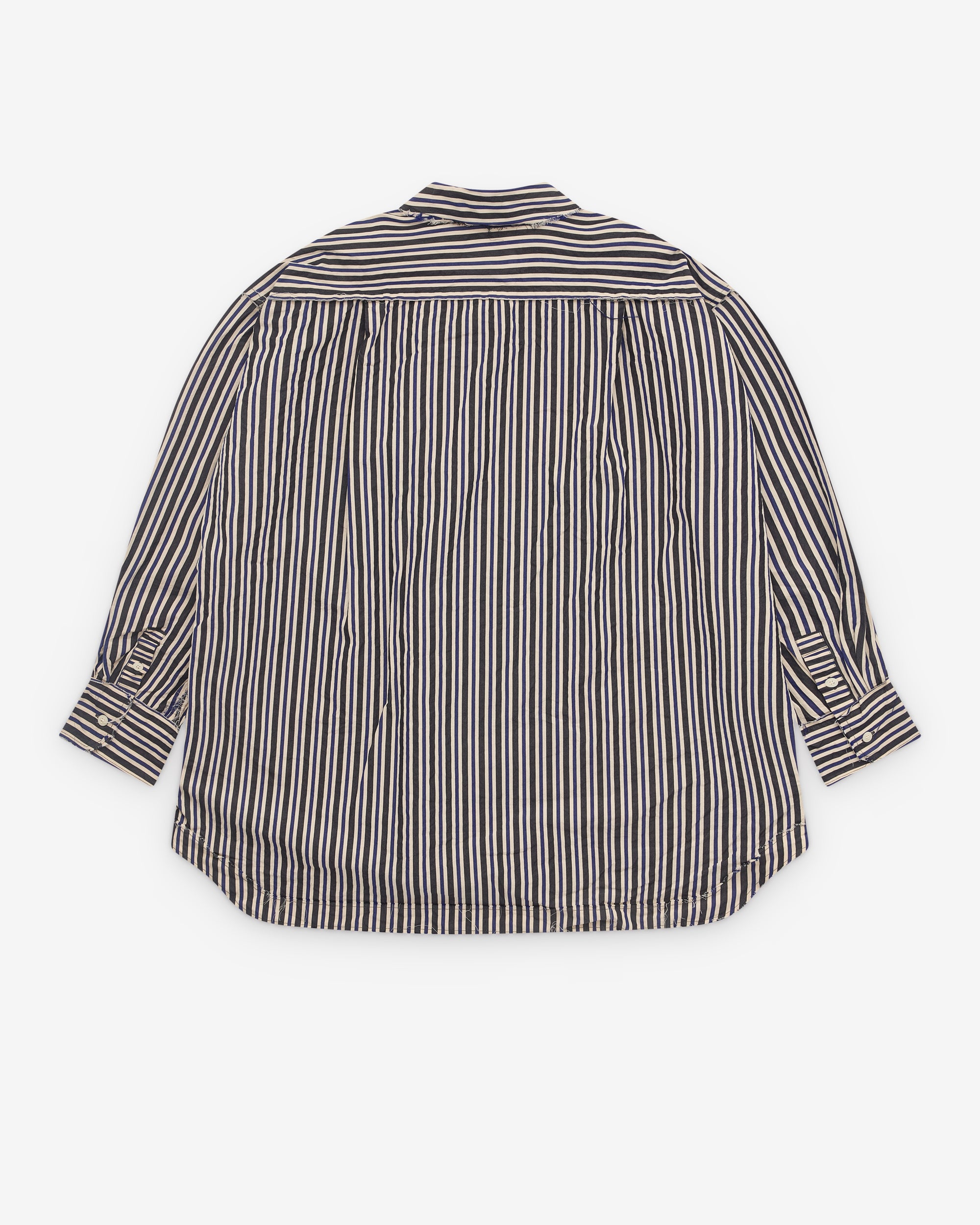 Point collarContrast stripe patch pocketsDropped shoulderButton fastening and cuffsCurved, stepped hemRear, double pleat