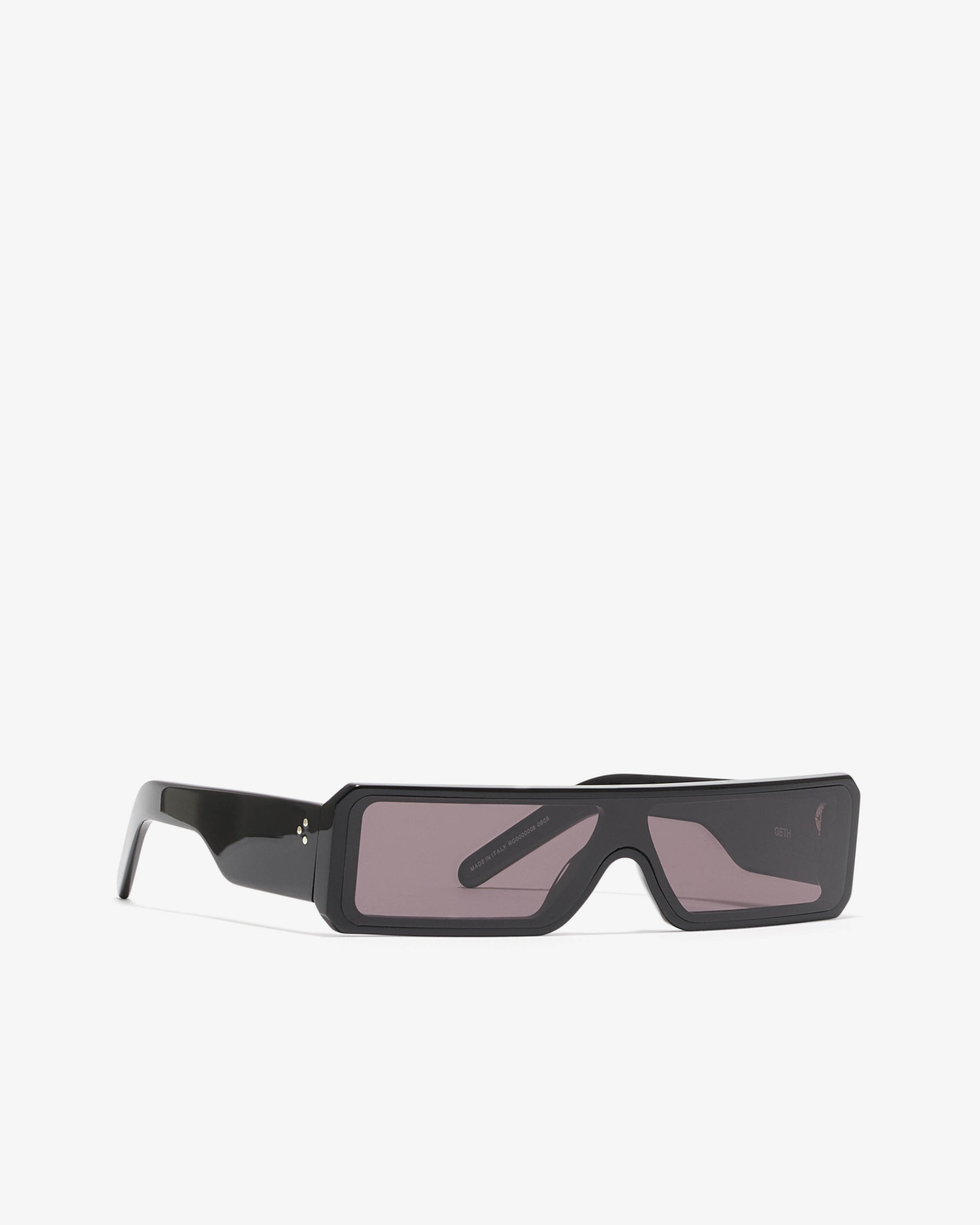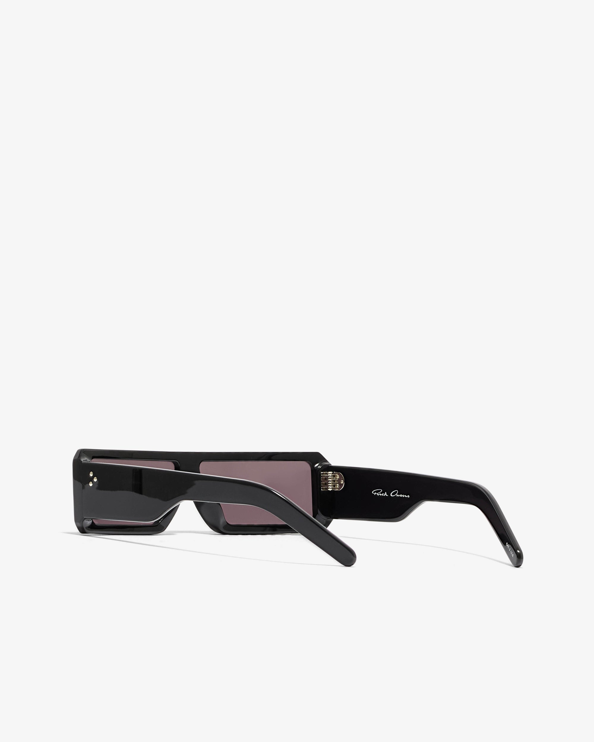 Sleek and slim rectangular black acetate frame Single cut lensWide arms with the signature trio of silver rivets on each templeRick Owens logo on inside right