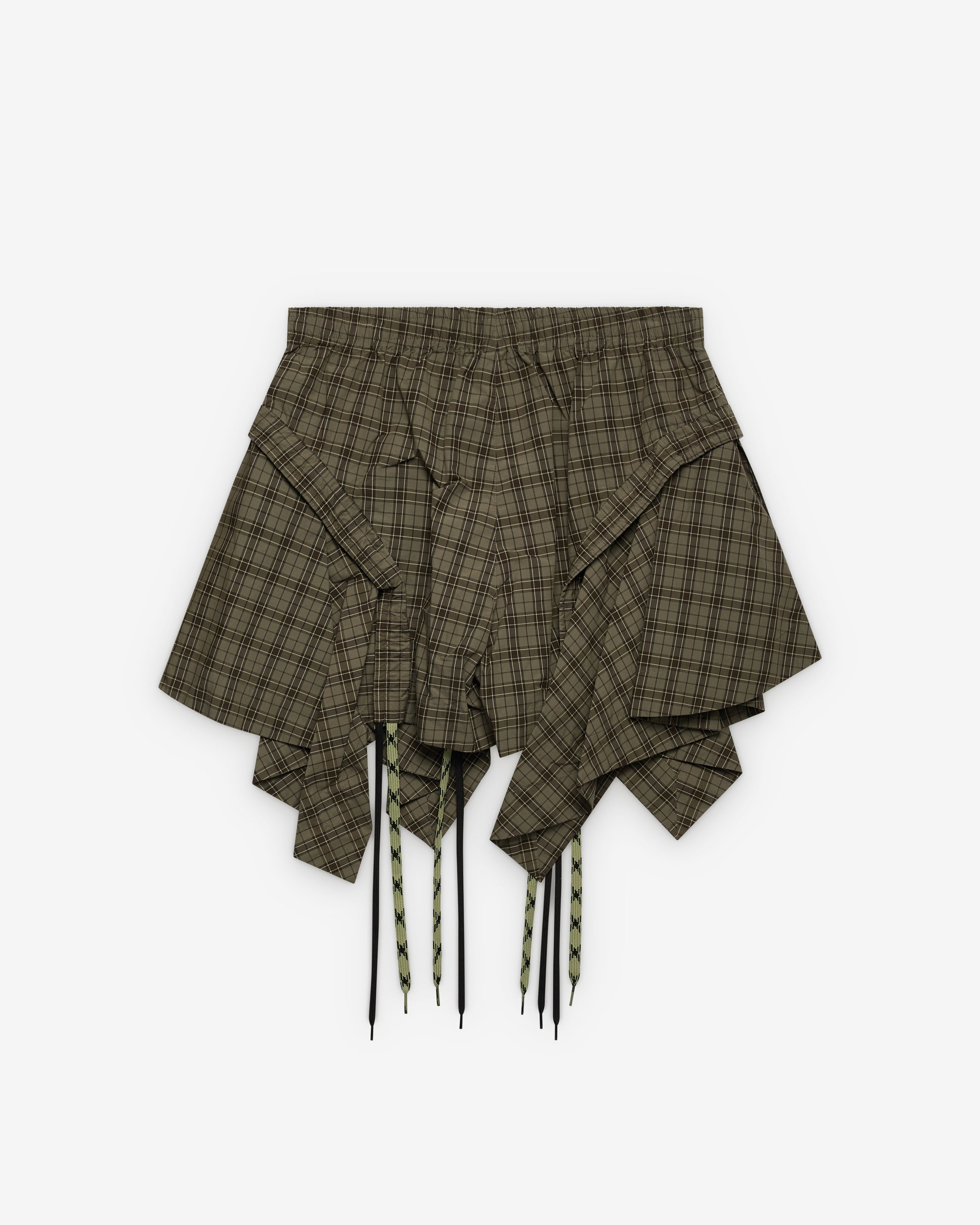 Elasticated waist bandCheck fabricDraped panels at legSide seam pocketsDrawstring details