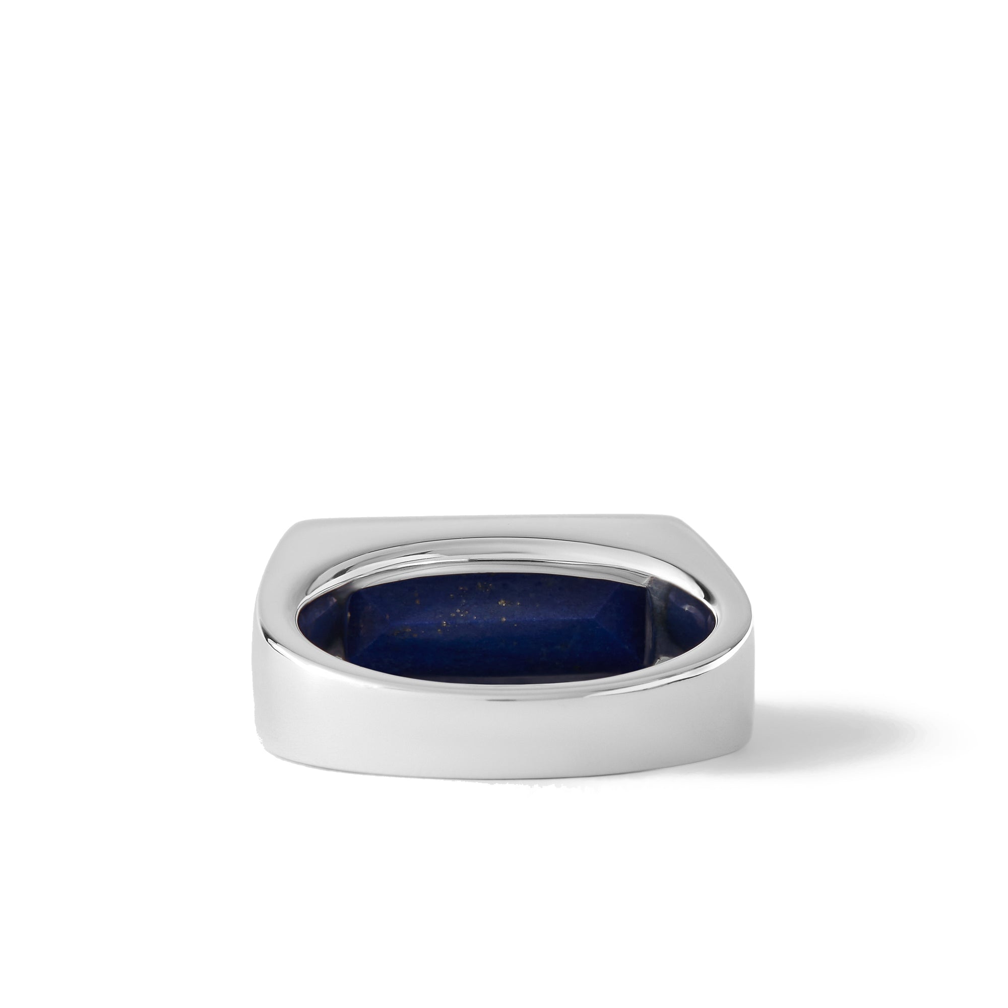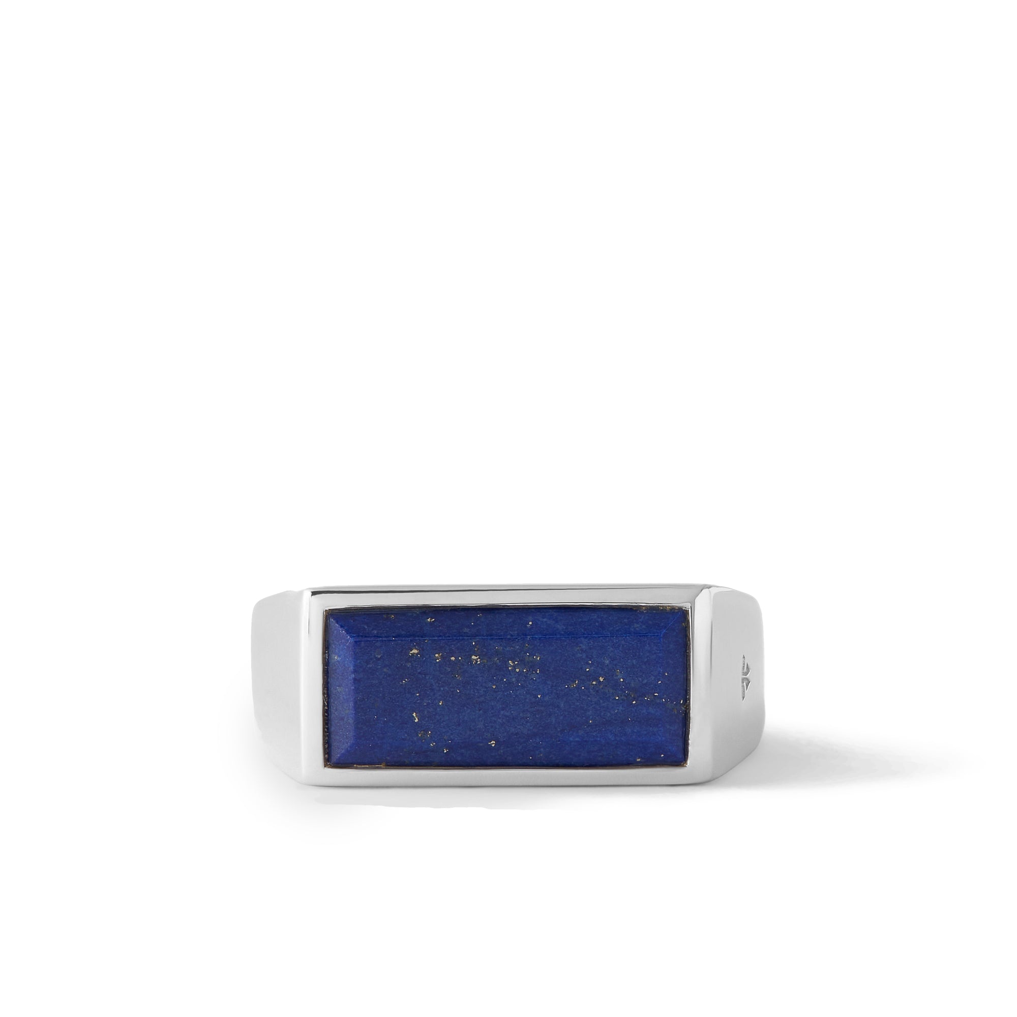 The Peaky Ring Blue Lapis is a slim signet ring made of high quality 925 sterling silver, plated in white rhodium to strengthen the surface and prevent tarnishing.