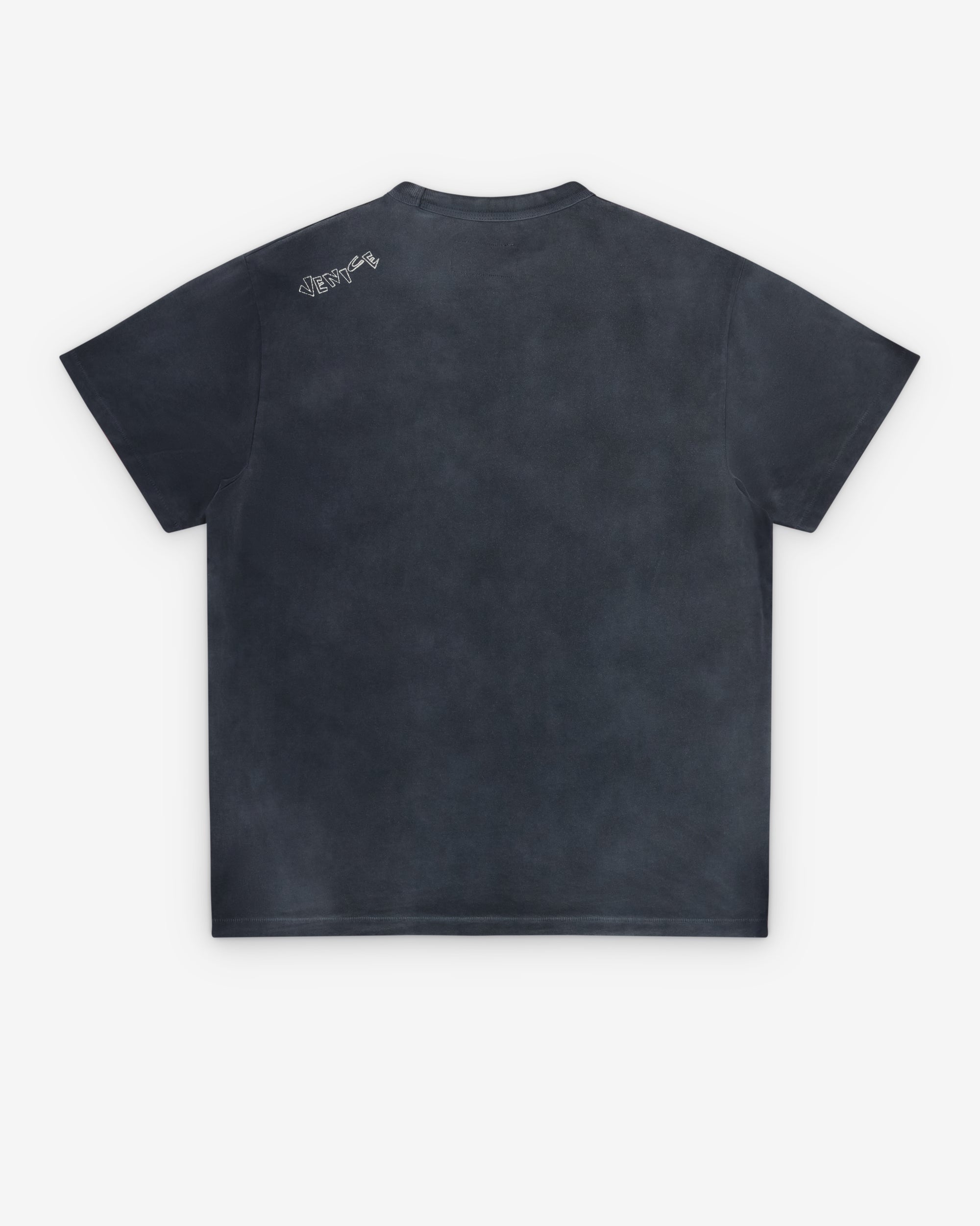 Ribbed rounded necklineShort sleevesGraphic print at chestChest pocketOverdyed fabric