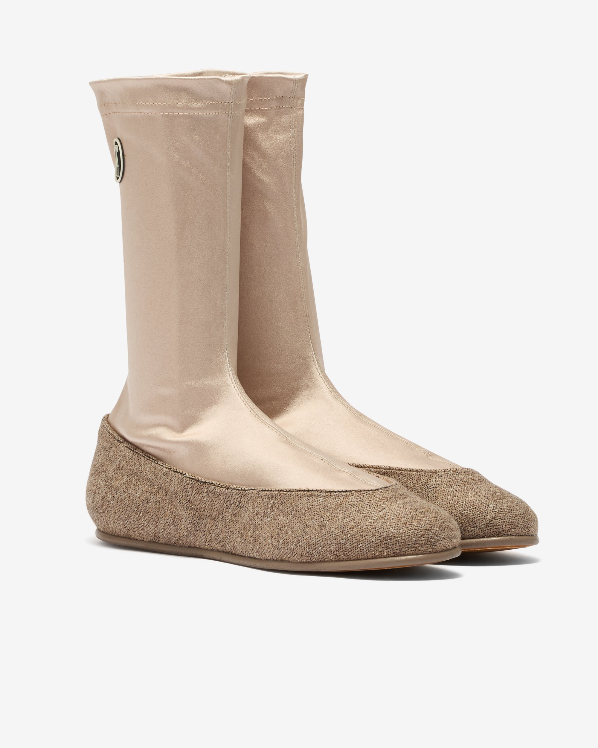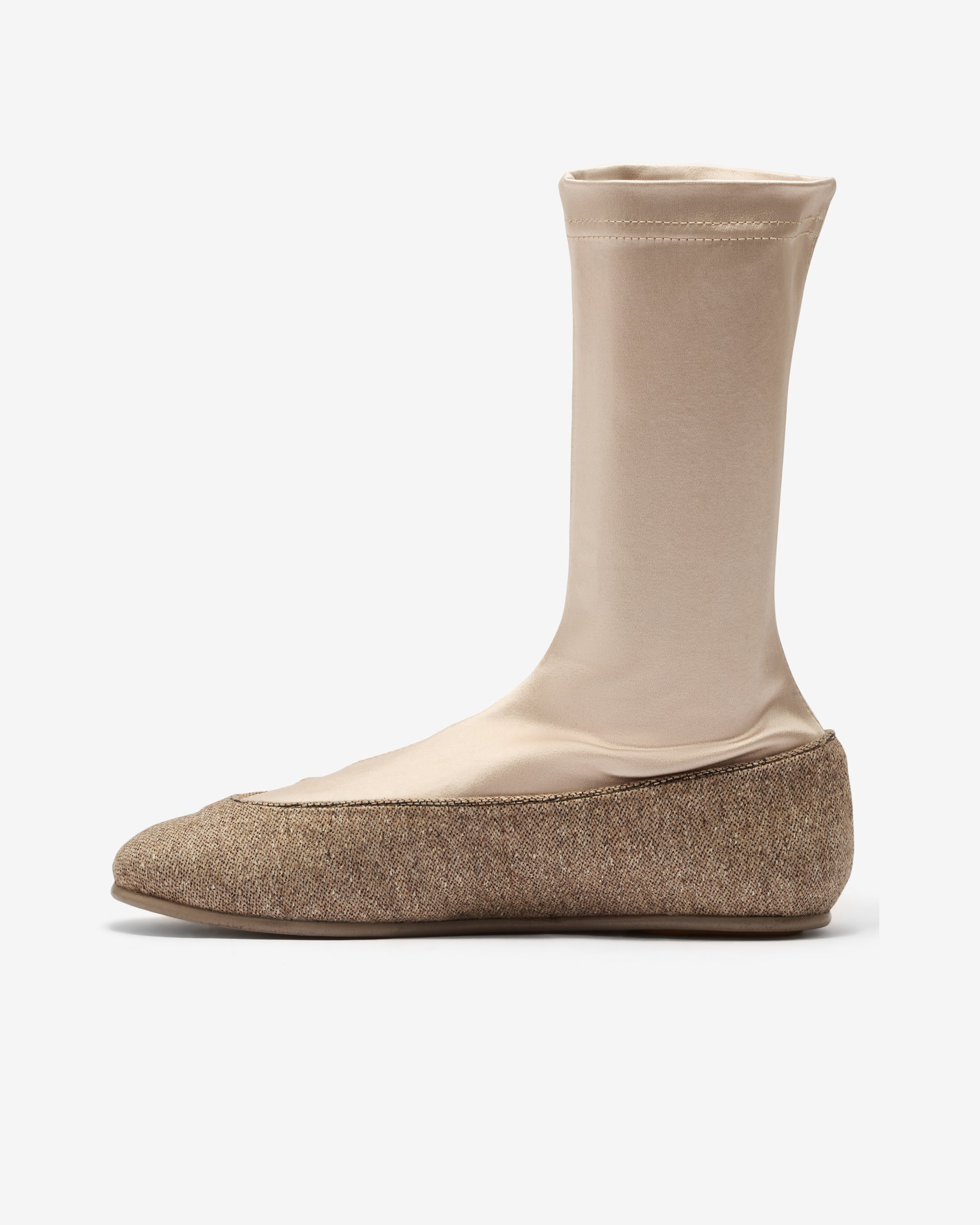 Speckled wool upperSatin panelsLeather / rubber outsoleLogo patch at calf