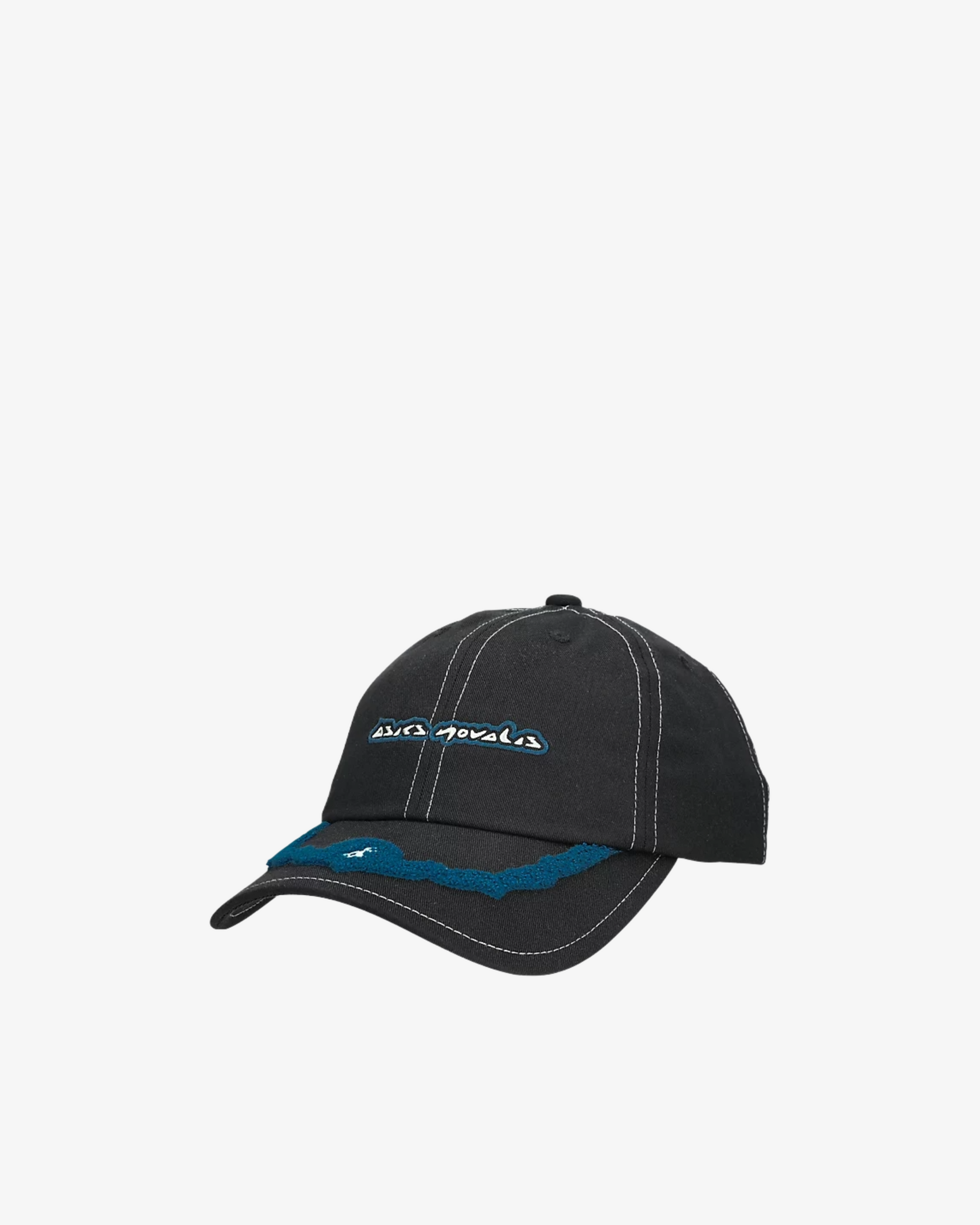 The cap features a chenille peak design that's inspired by archival ASICS lines. Meanwhile, a humanoid caricature appears on the front.