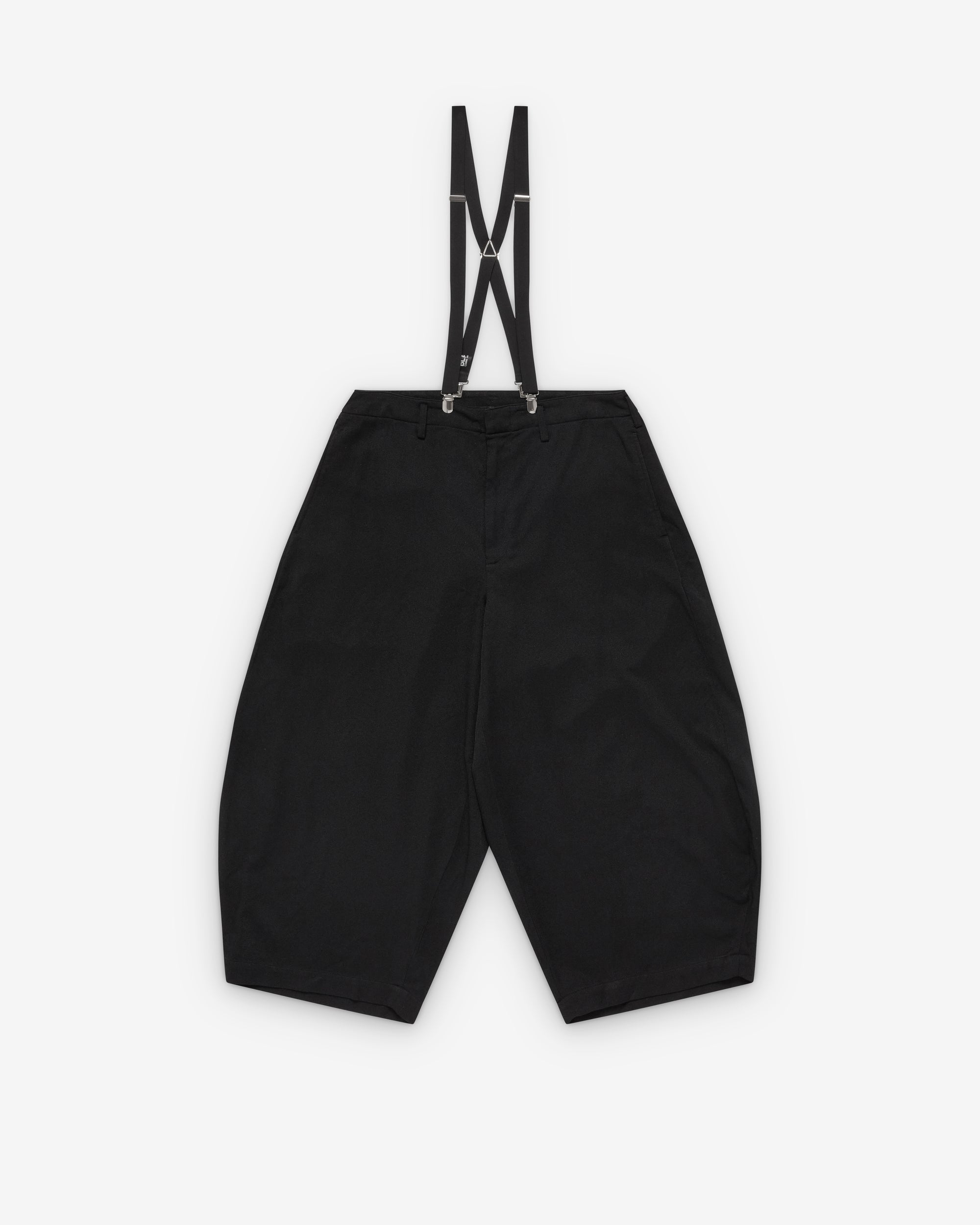 Wide, loose legWashed finishingTwo back pocketsAdjustable, attached suspenders Cropped fit