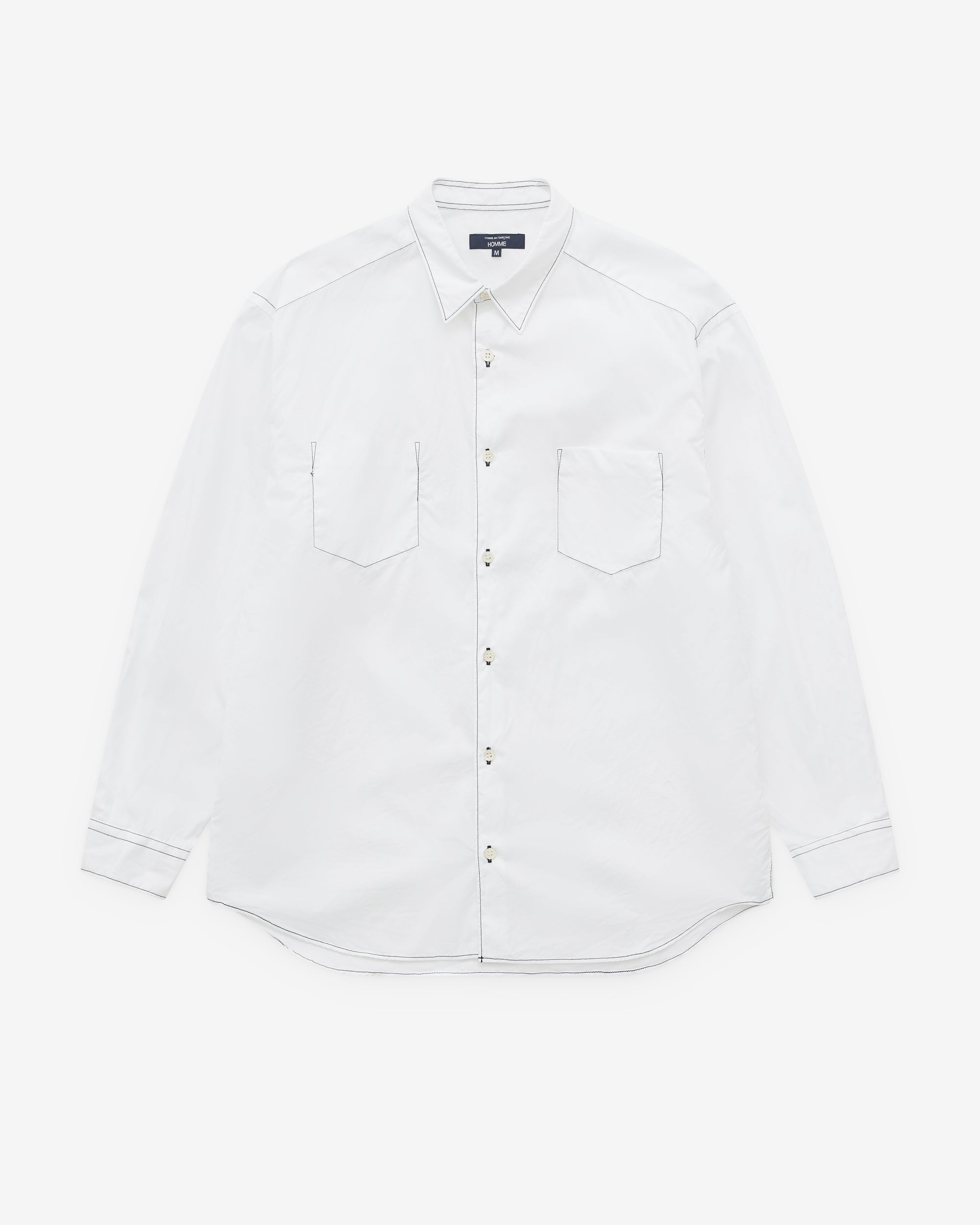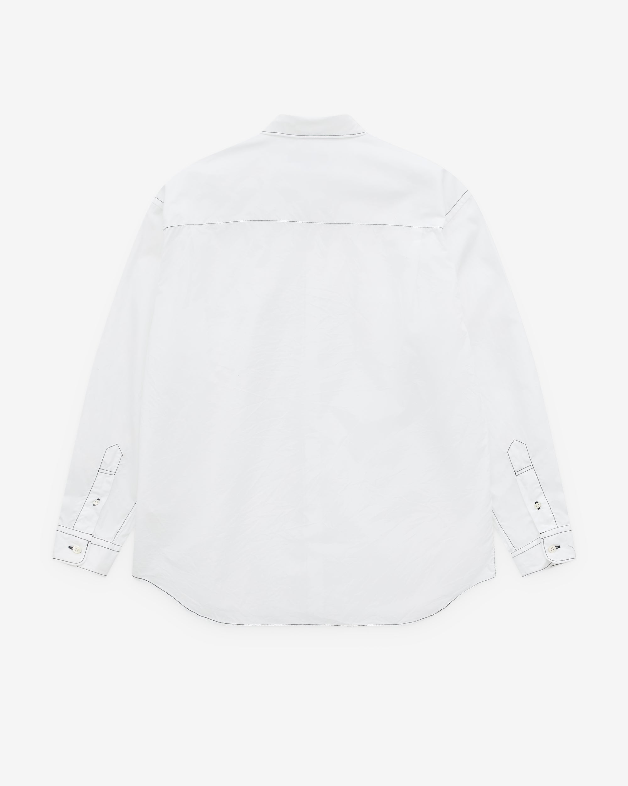 Point collarCurved hemPatch pocketsButton placketButton cuffsContrast topstitching throughout
