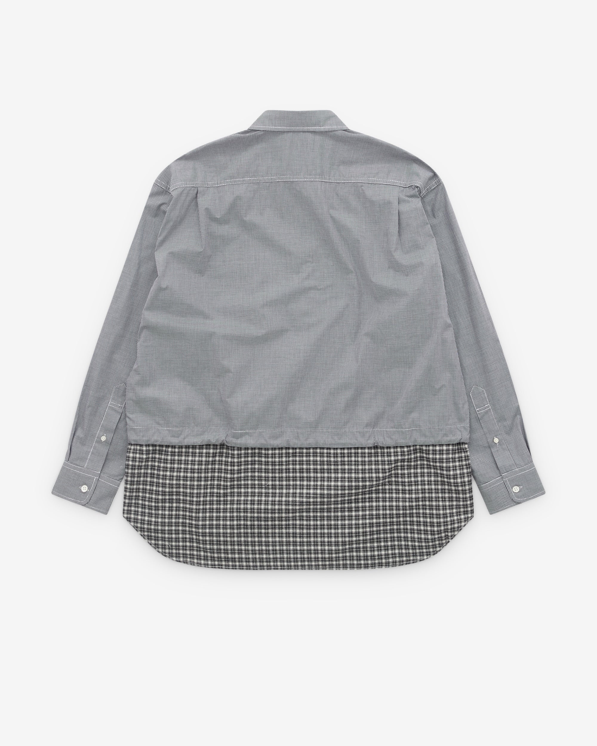 Point collarChest patch pocketDrawcord detailContrast check panel at hemCurved hem Button cuffs100% CottonMade in Japan