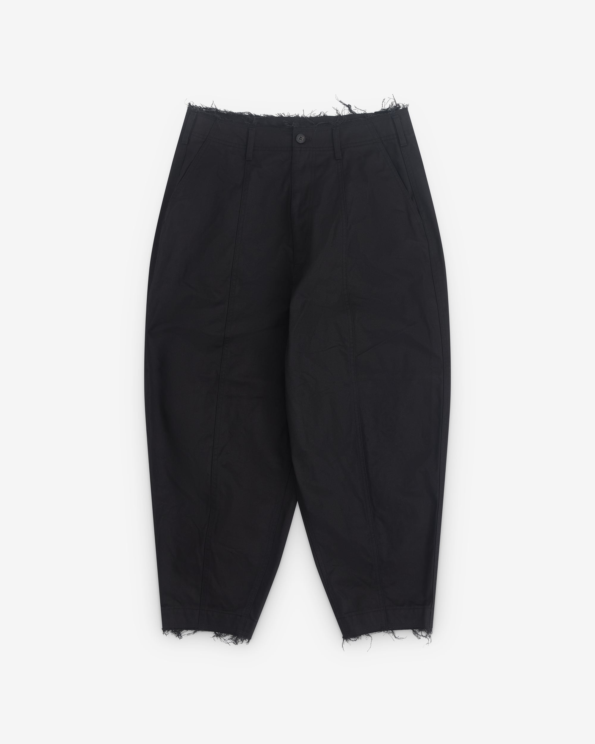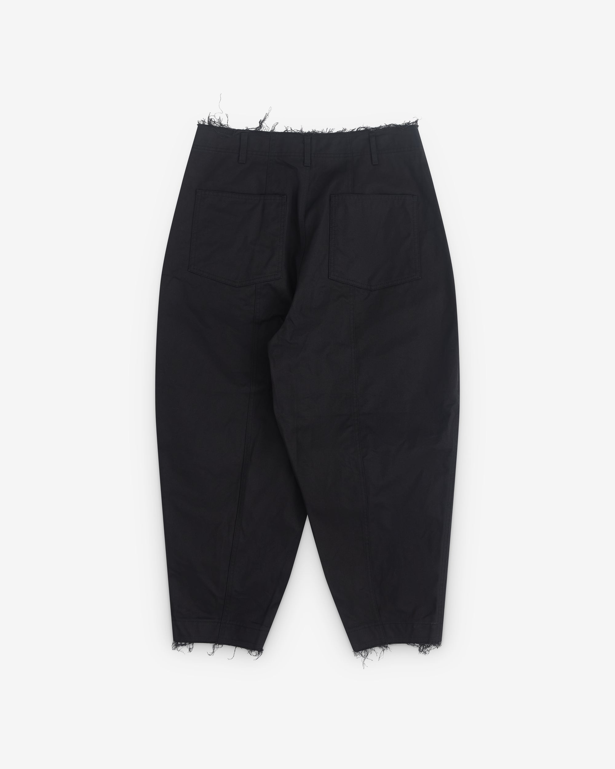 Raw hem at waistband and cuffButton and zip fly fastening Barrel legSide seam pocketsRear patch pocketsBelt loops