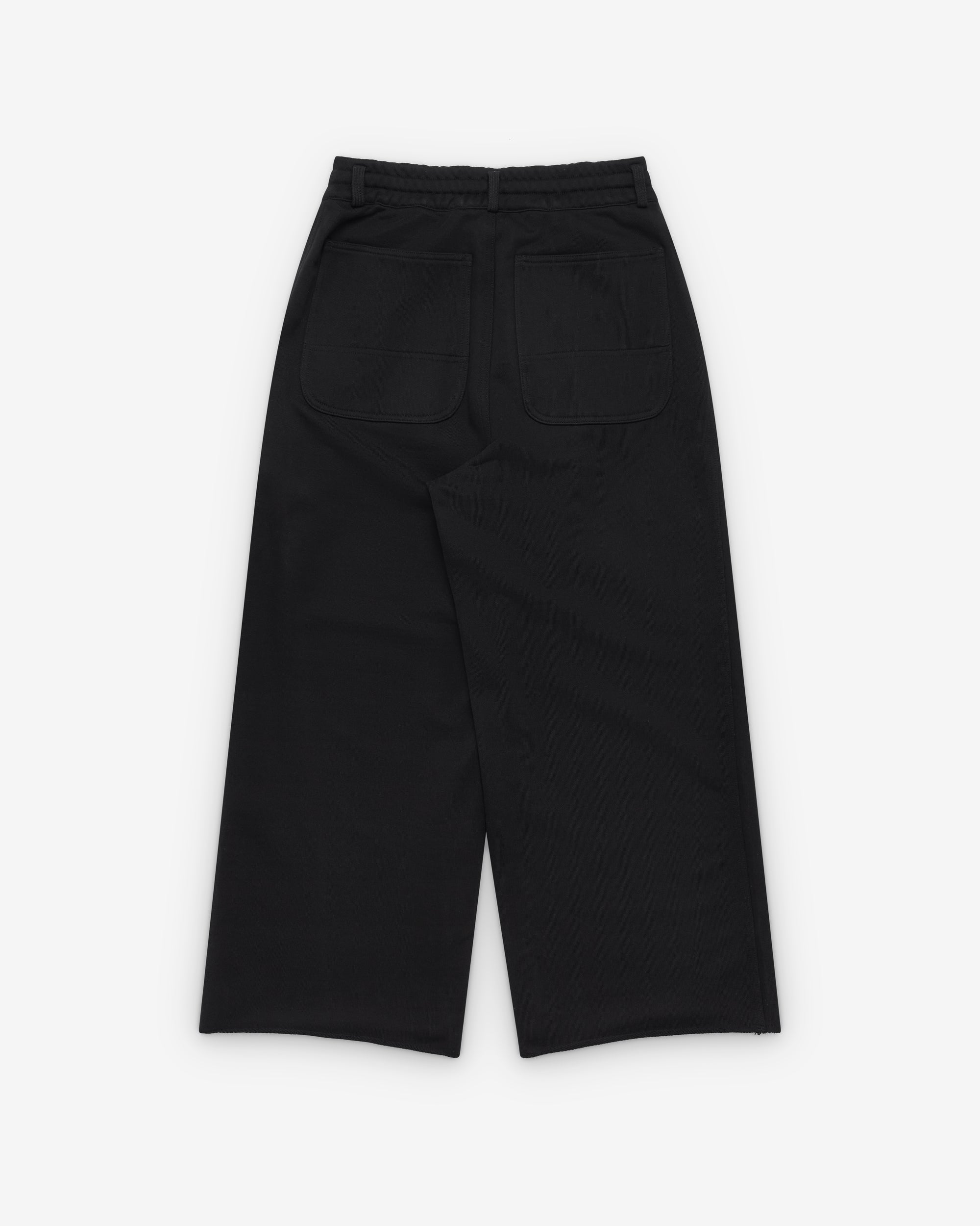 Elasticated, drawstring waist bandSide seam slip pocketsWide leg, loose fitButton waist, zip flyPleated frontTwo rear patch pocketsRaw edge hemHut logo at leg