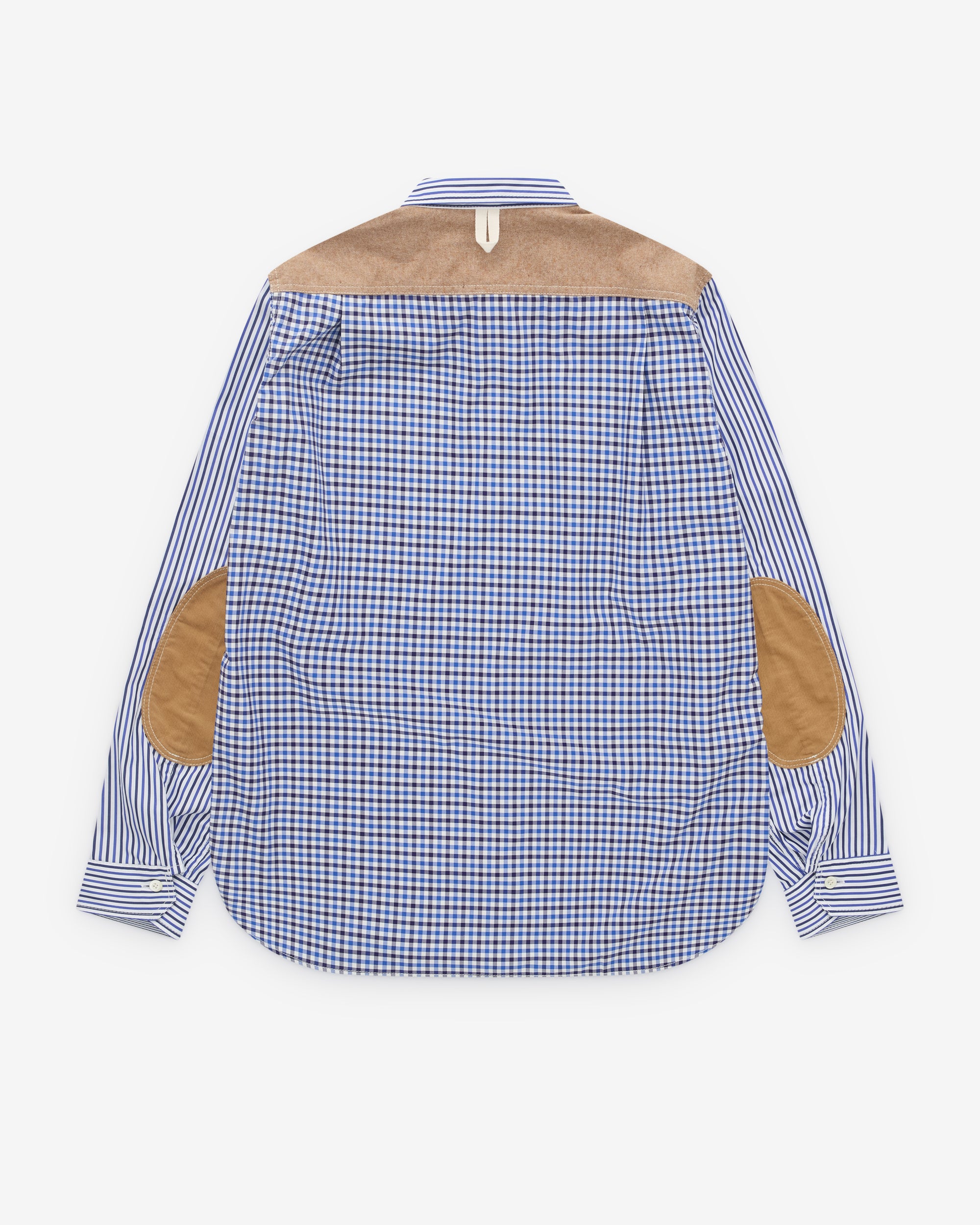 Point collarPatch pockets at chestButton placketContrast yoke and elbow patchesBrushed cotton rear panelCurved hem