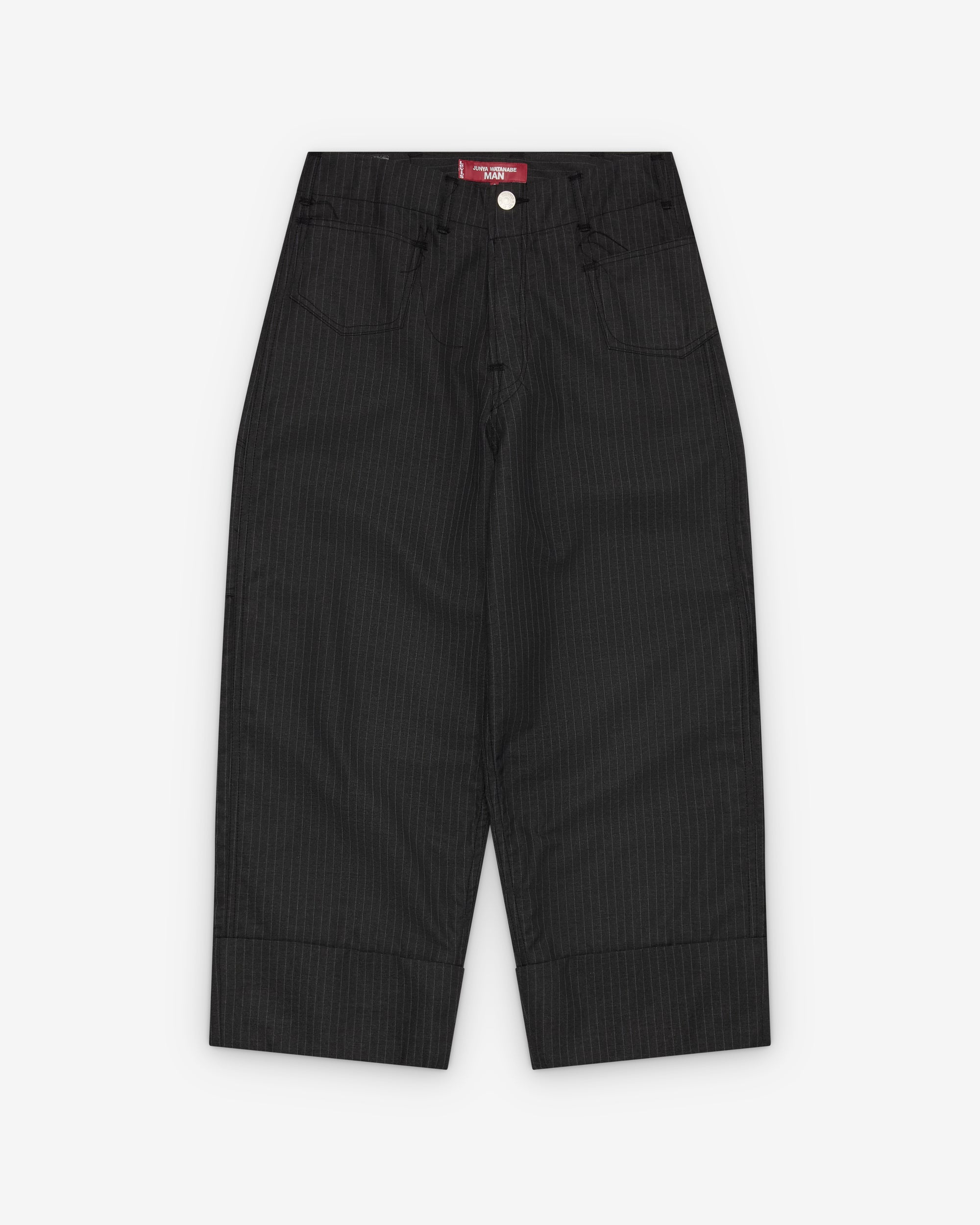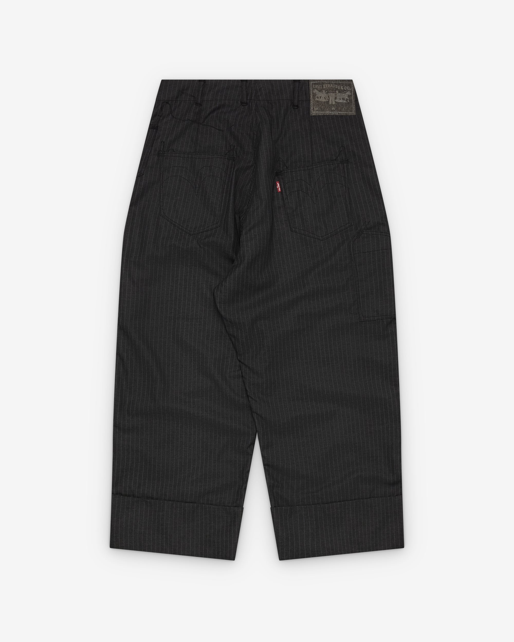 Front button waist closureTwo front pocketsWide legCuffed ankles Pin stripe fabric Levi's tab label at rear pocketLeather patch at waist