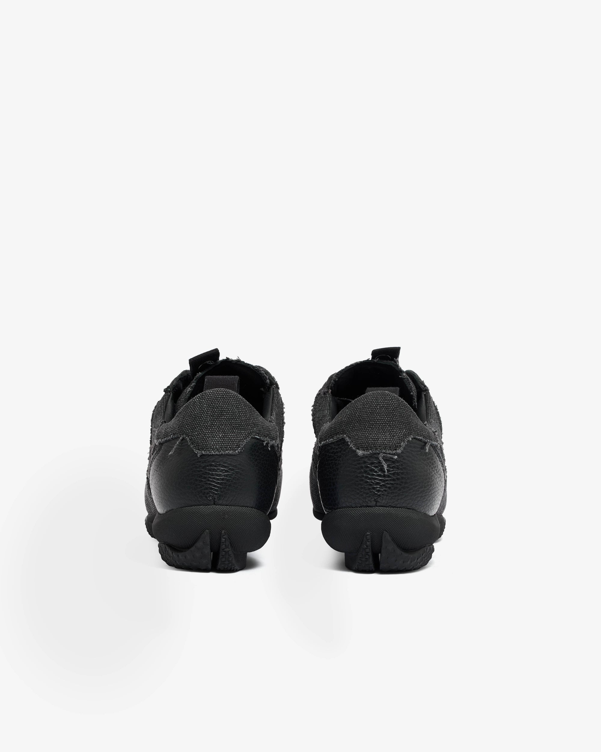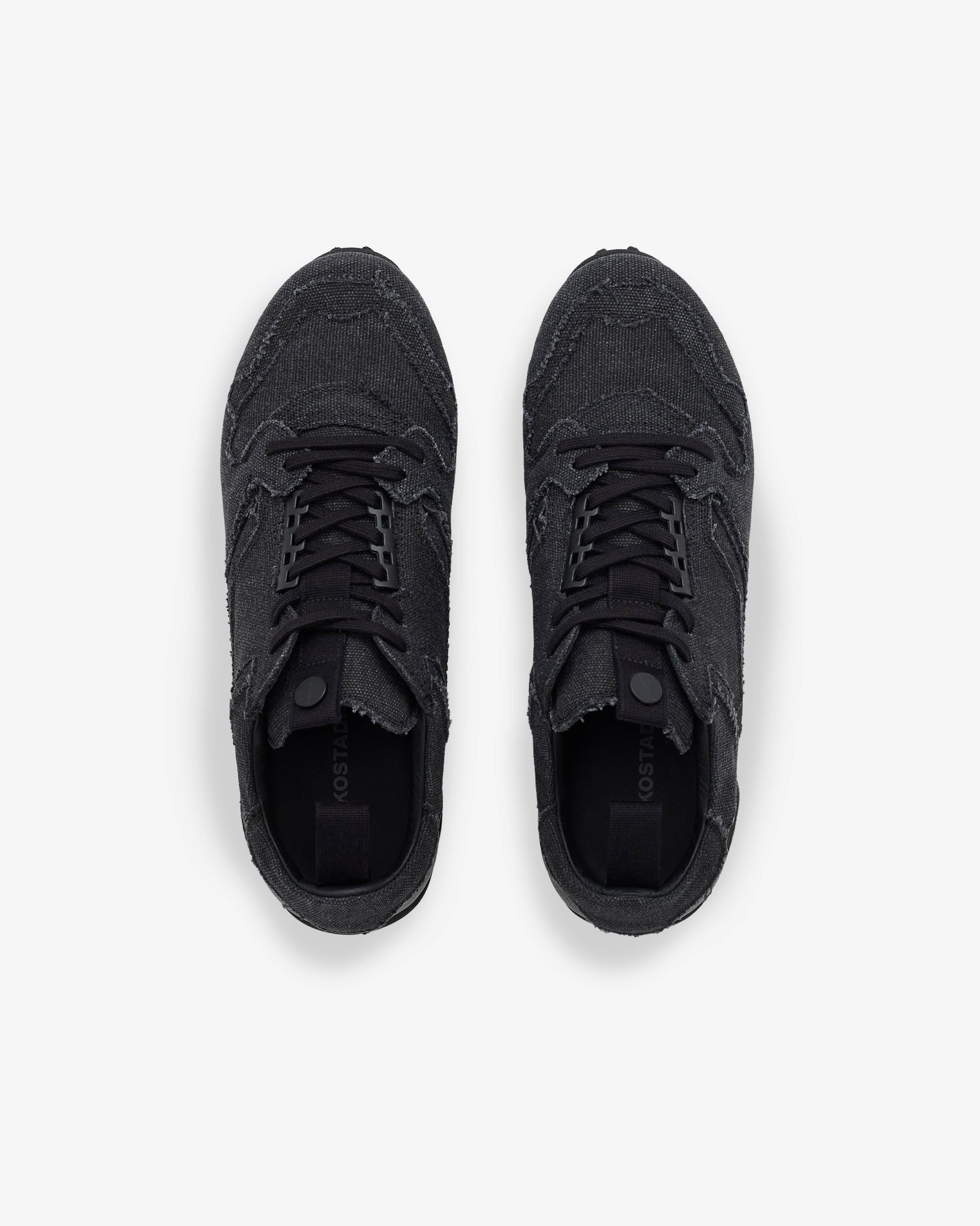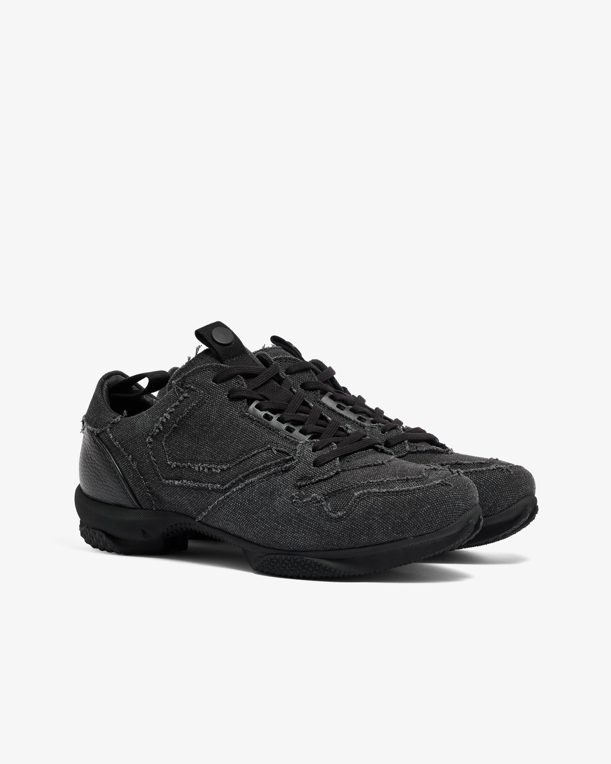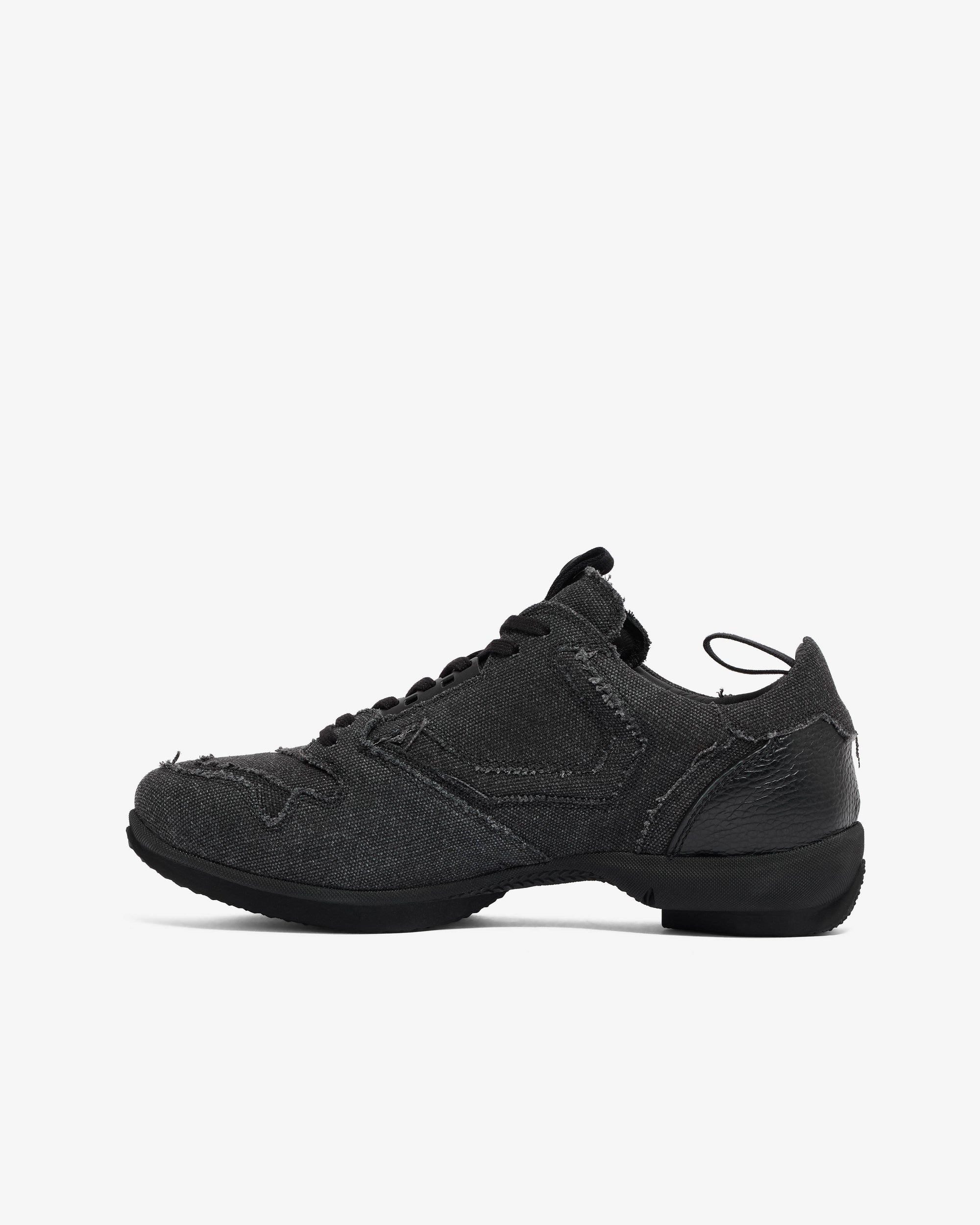 Raw cut canvas upperLace up closurePull tab at heelBranded hardware