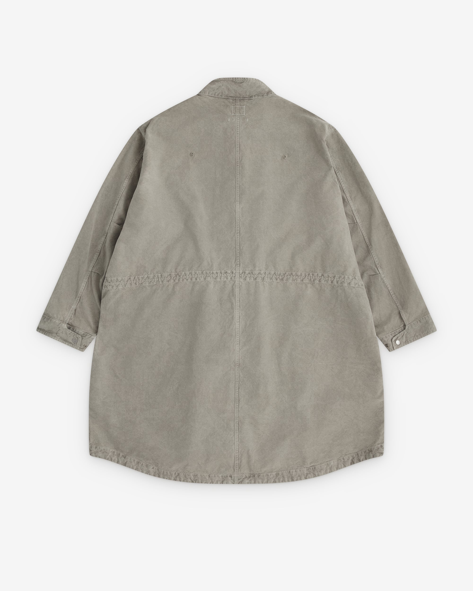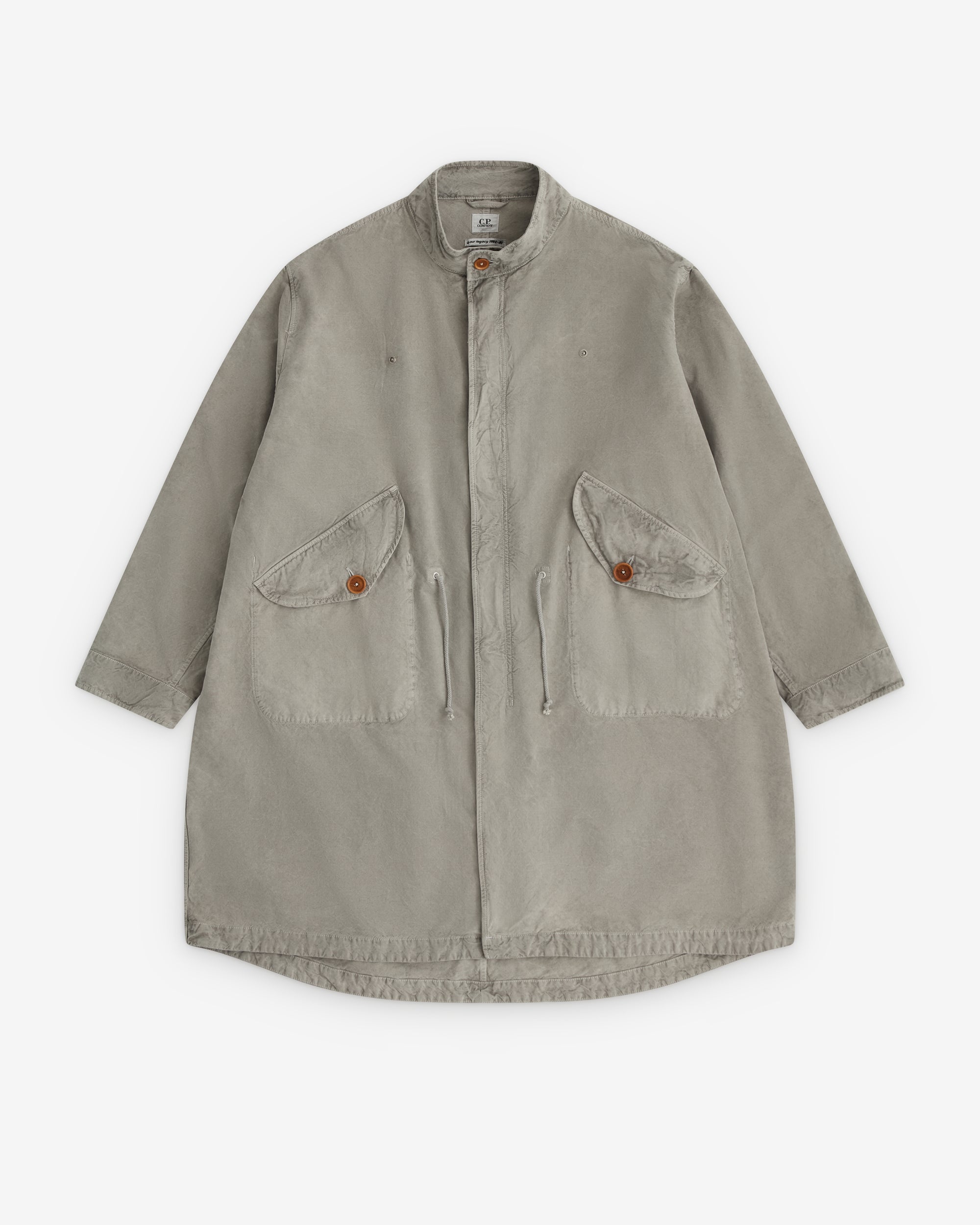 Collarless collar Button and concealed zip closure Front flap close pockets Drawstring tie at waist Boxy fit Thigh length Press stud close cuffs Attachable hood sold separately
