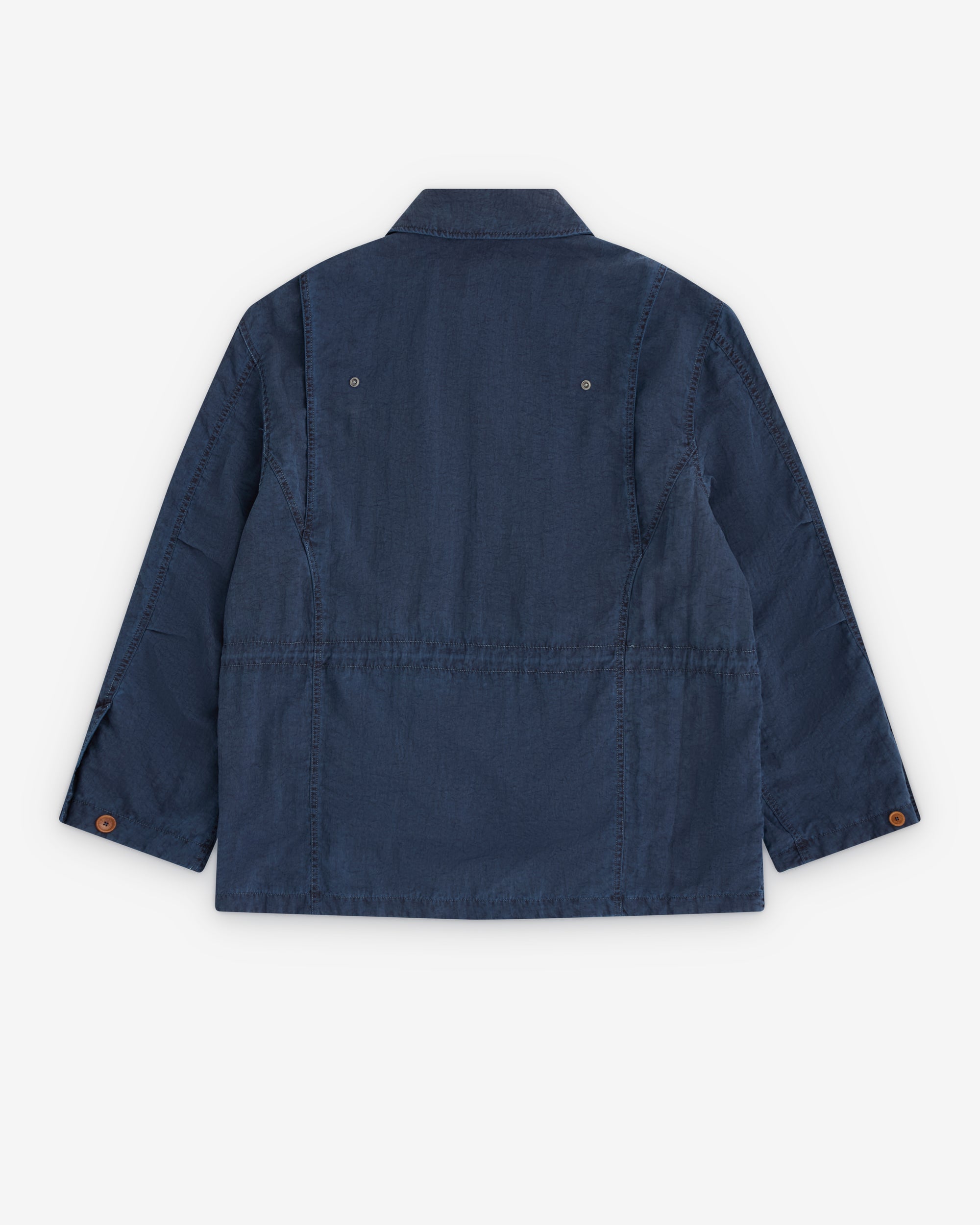 Classic jacket collar Button and concealed zip closure Single zip chest pocket Button close front pockets Drawstring tie at waist Garment dyed fabric Attachable hood sold separately