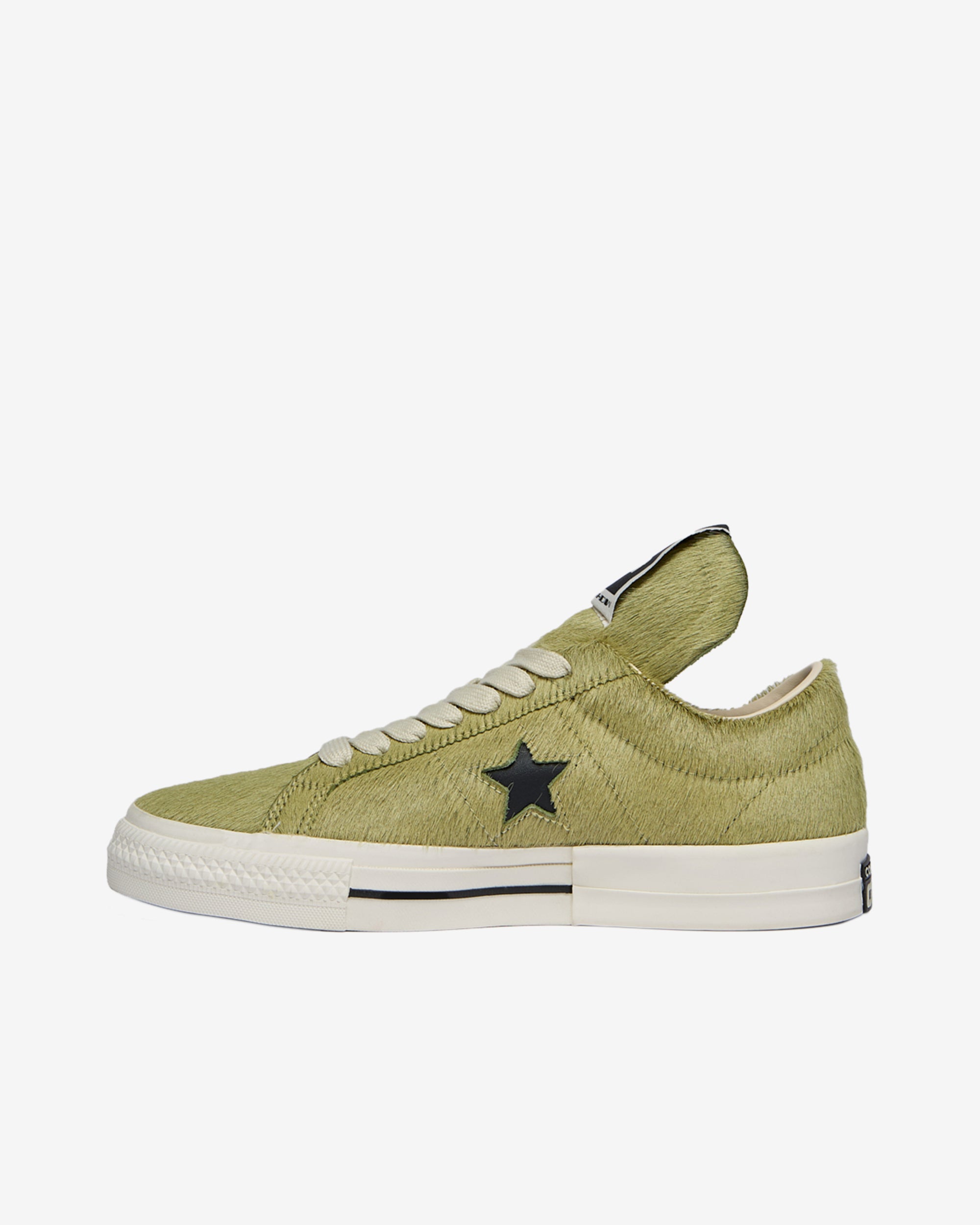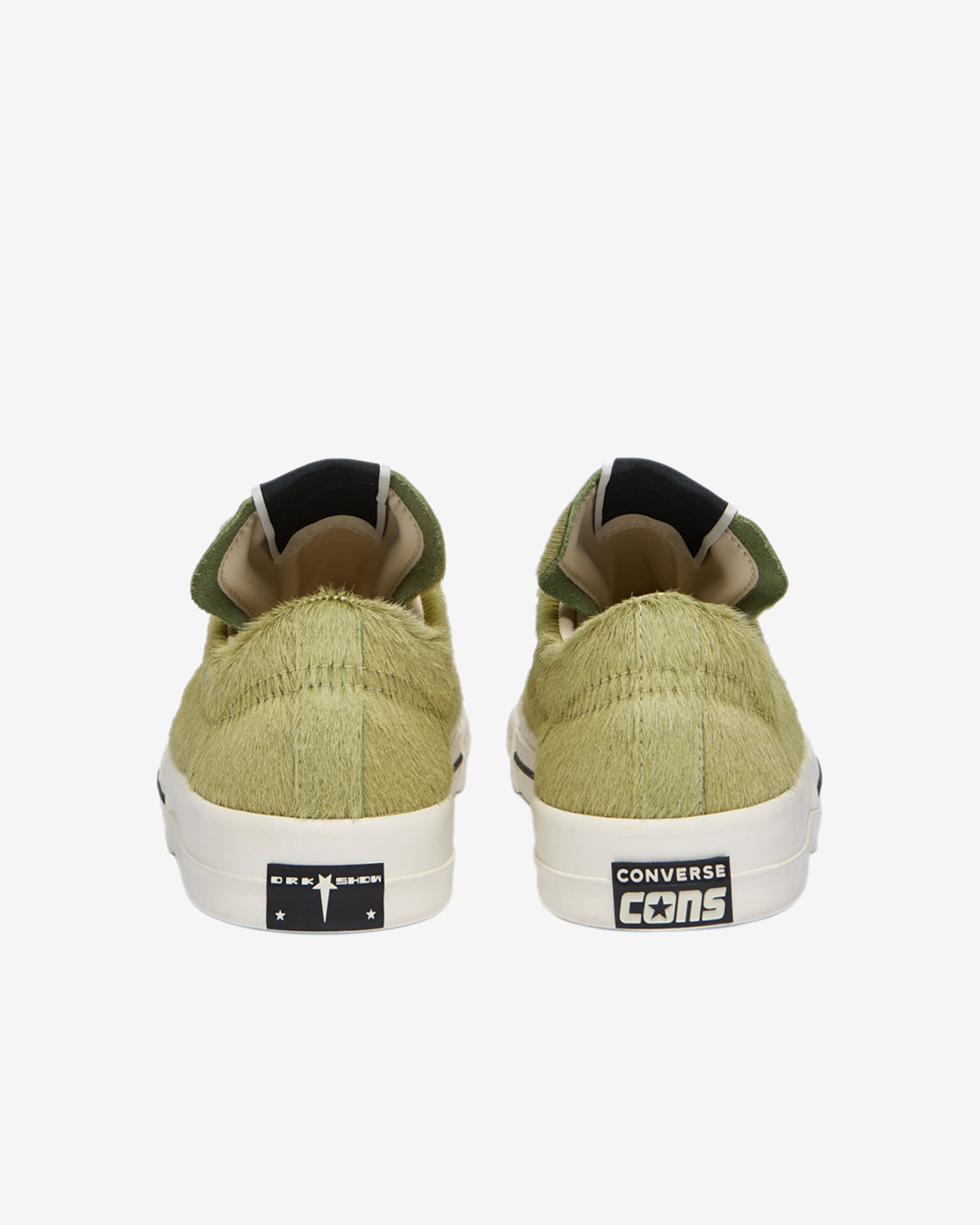 It has a hair on cowhide upper and features a signature DRKSHDW elongated tongue with a branded wrap around woven label bearing the model name and a classic Converse Skateboard One Star Converse sole, sandwiched by a signature Rick Owens sneaks molded rubber heel.