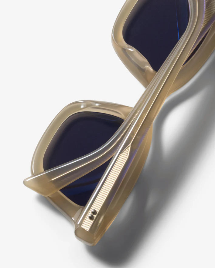 Thick square frames with a wide profile and metallic dome studs at each side. Handmade in dark brown bio-acetate with brown tinted recycled lenses. Features laser-engraved logo detailing at the lens corner.