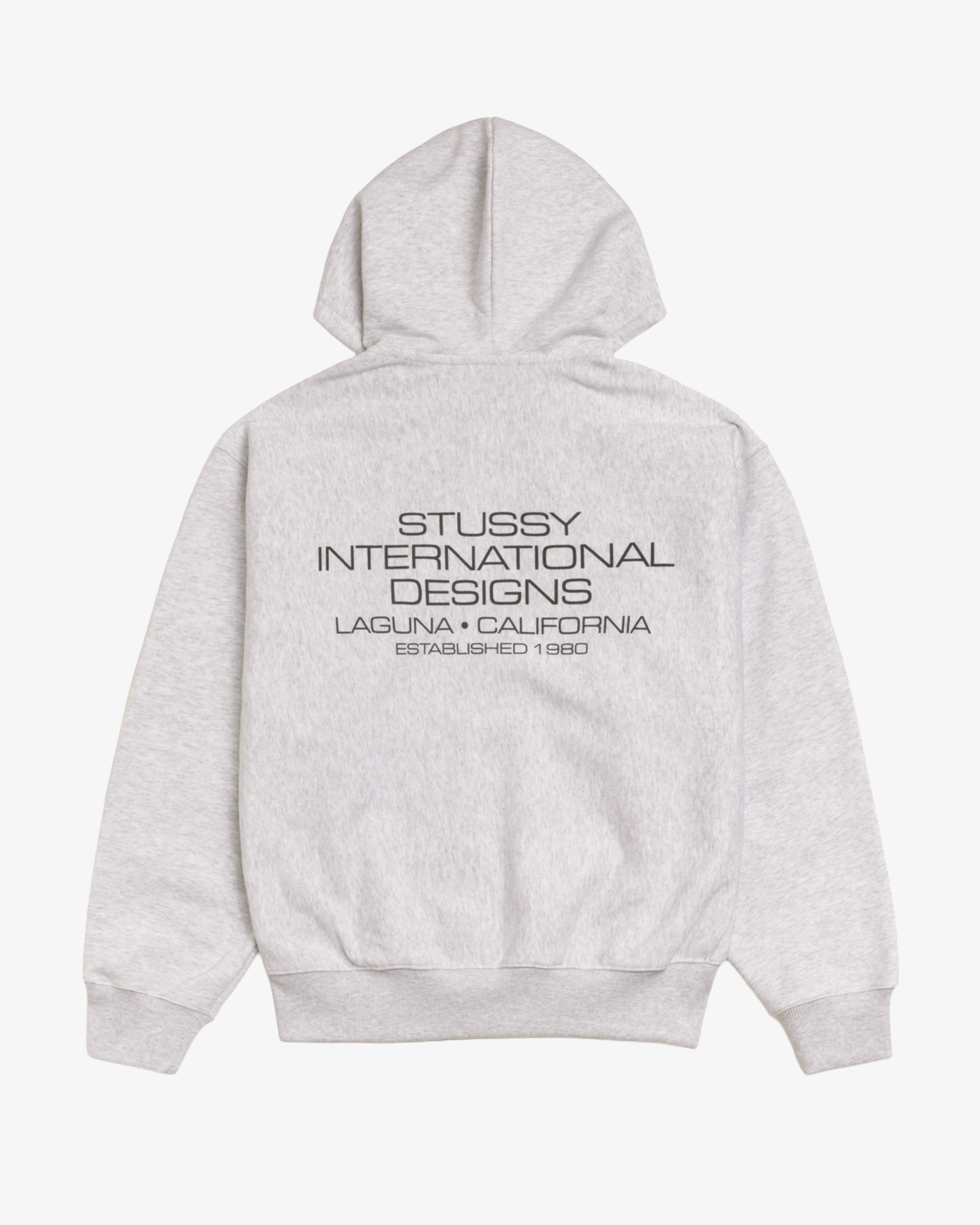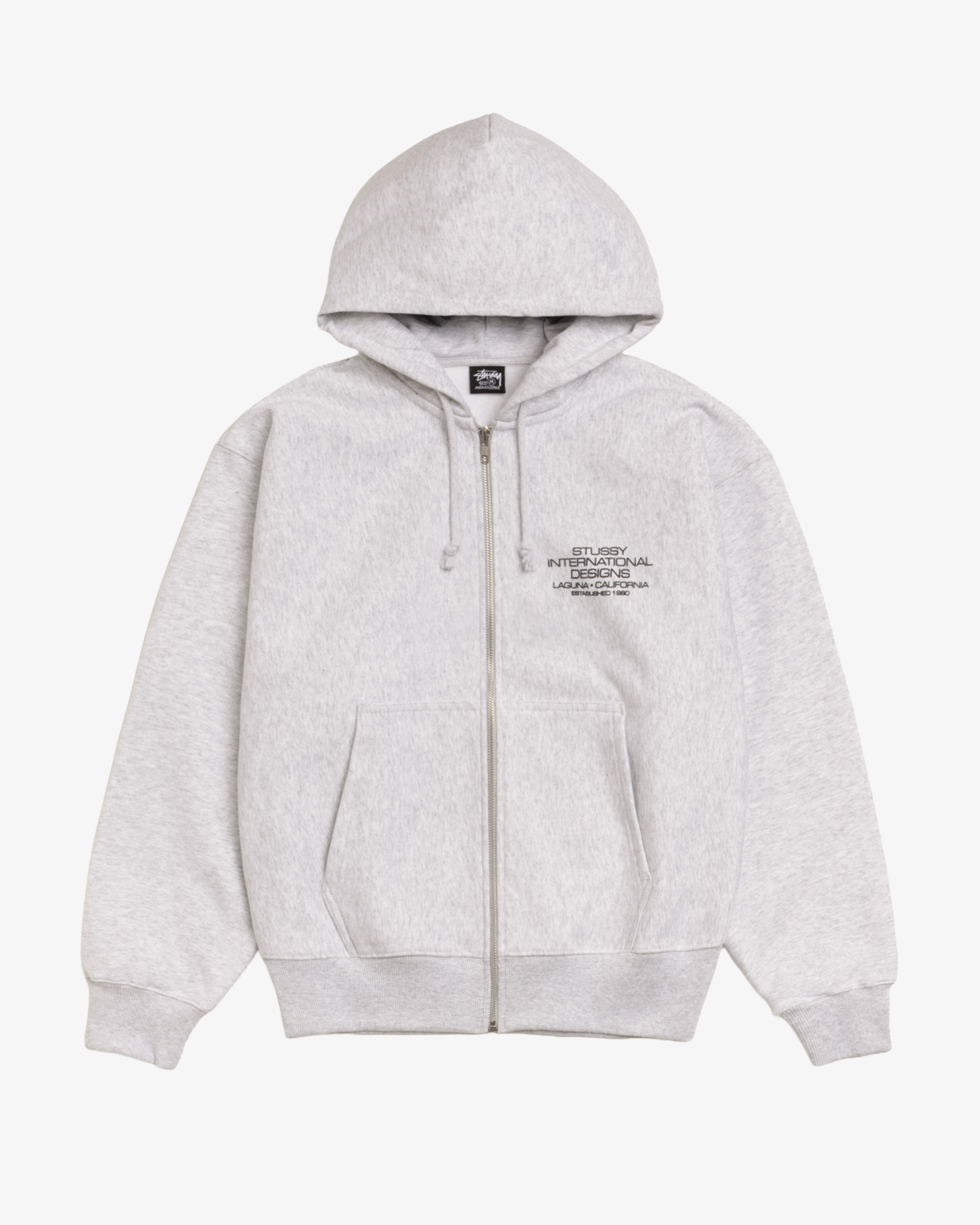 Relaxed fit zip-front hoodie Heavyweight 430gsm cotton blend fleece Round drawcord in hood YKK zip front closure Screenprinted graphics at front and back Ribbed cuffs and hem Patch pockets