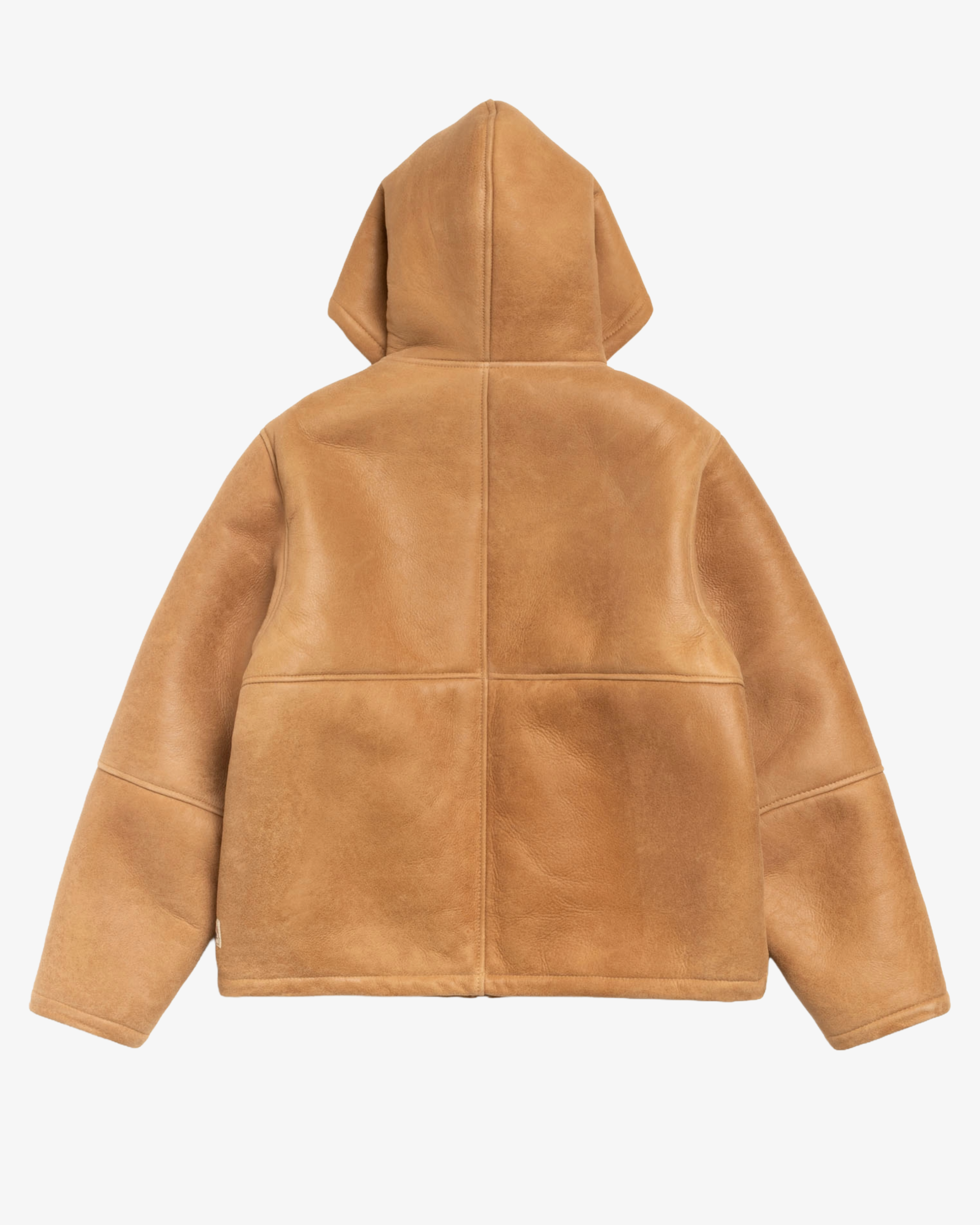Boxy fit hooded jacket in shearling leatherYKK VISLON® zip closure with leather pull tabPatch pocketsStüssy authentic workgear label at side seam