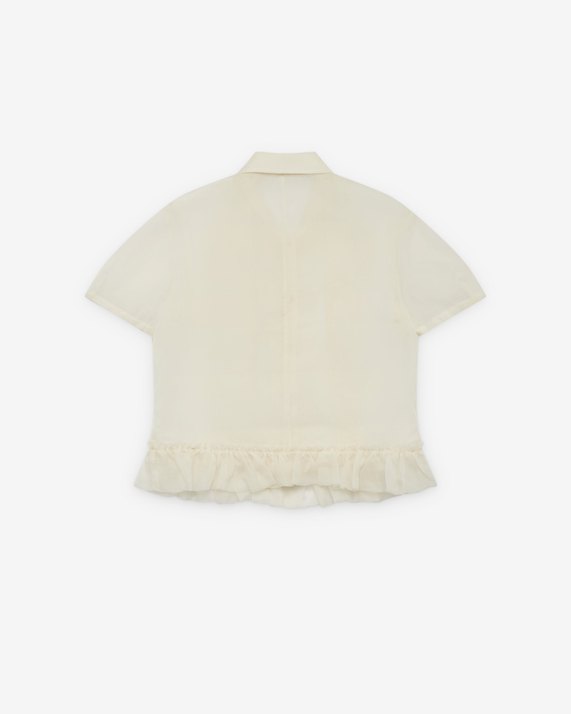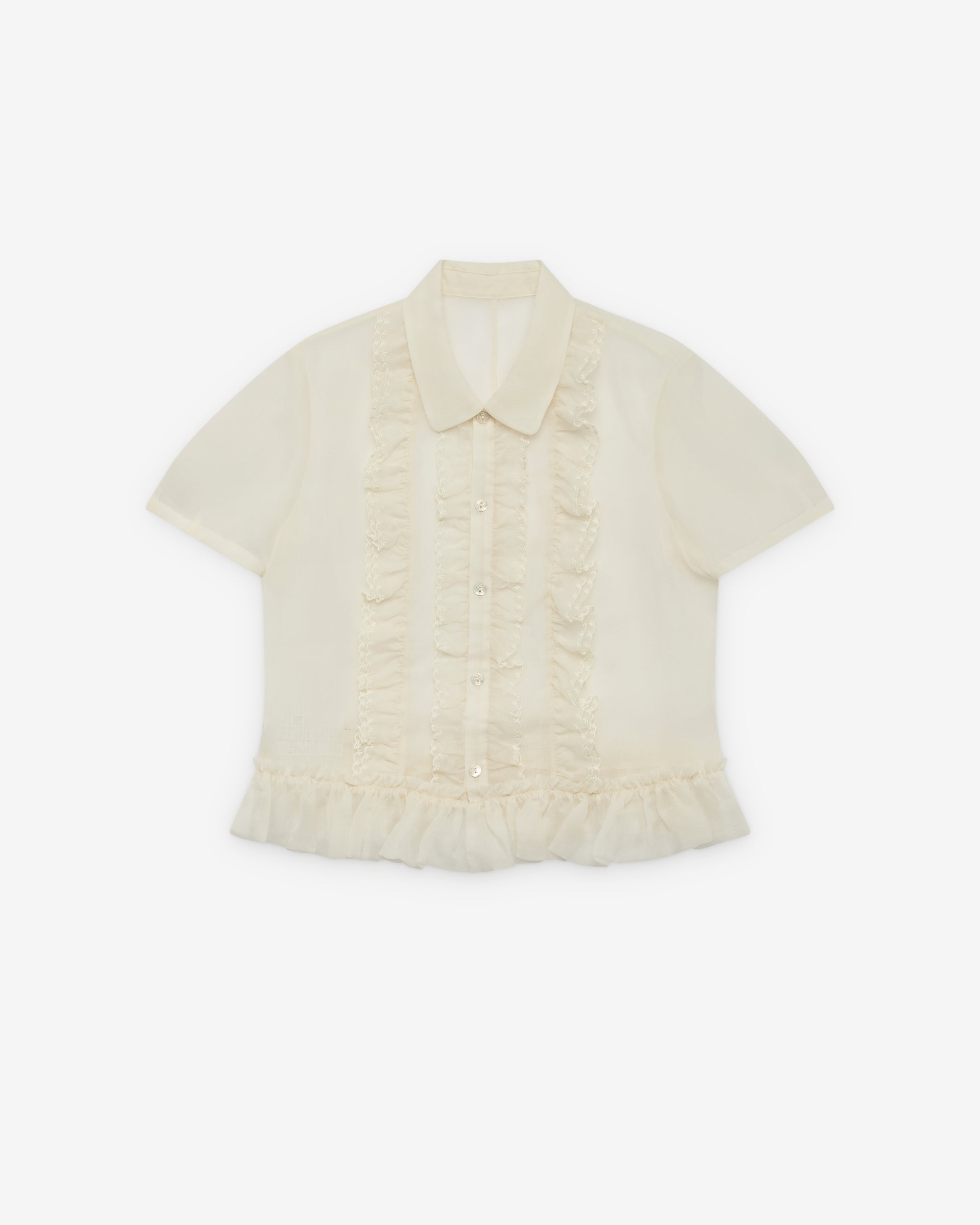 Classic spread collarButton front closureRuffle details at frontRuffle tulle hemShort sleeves