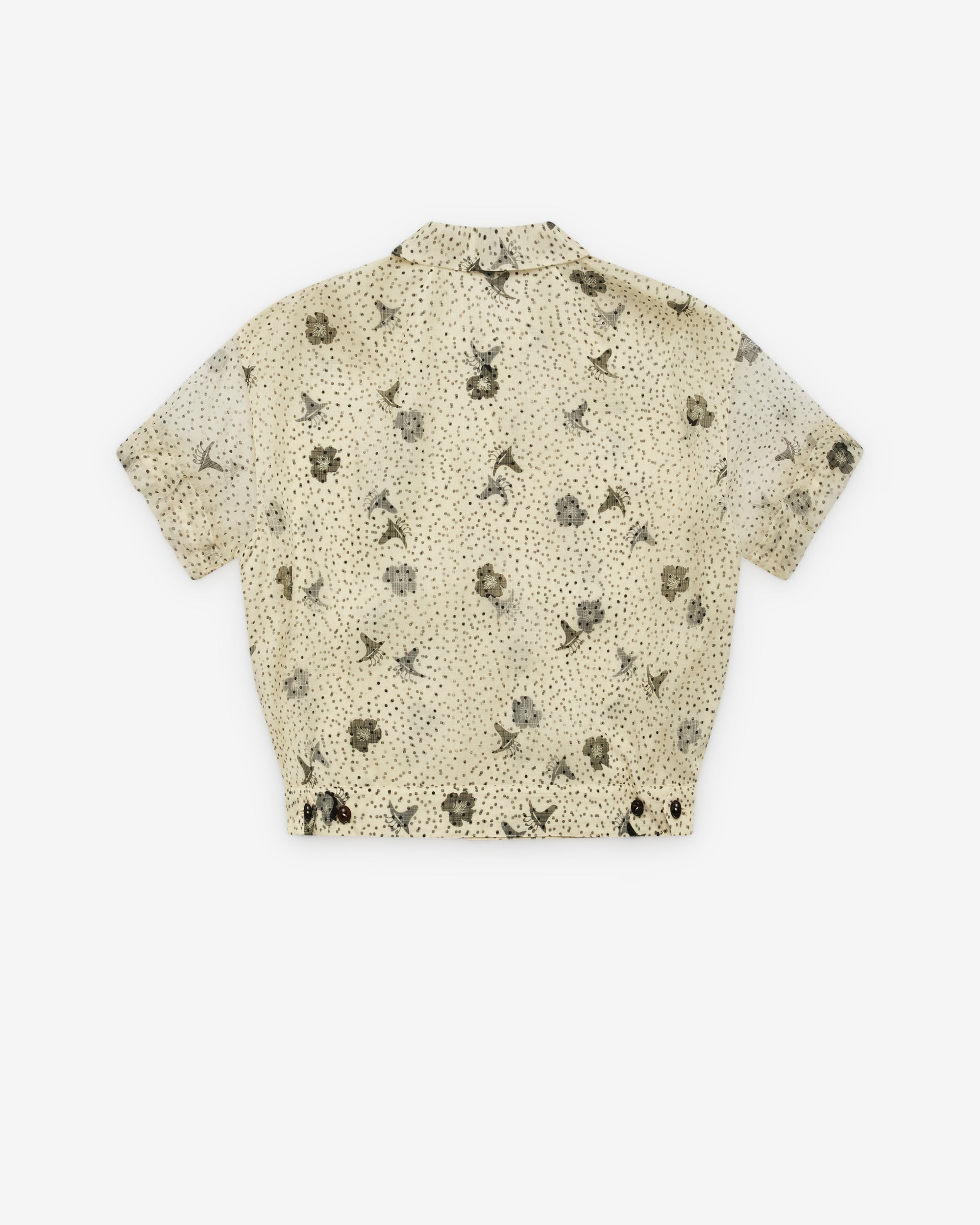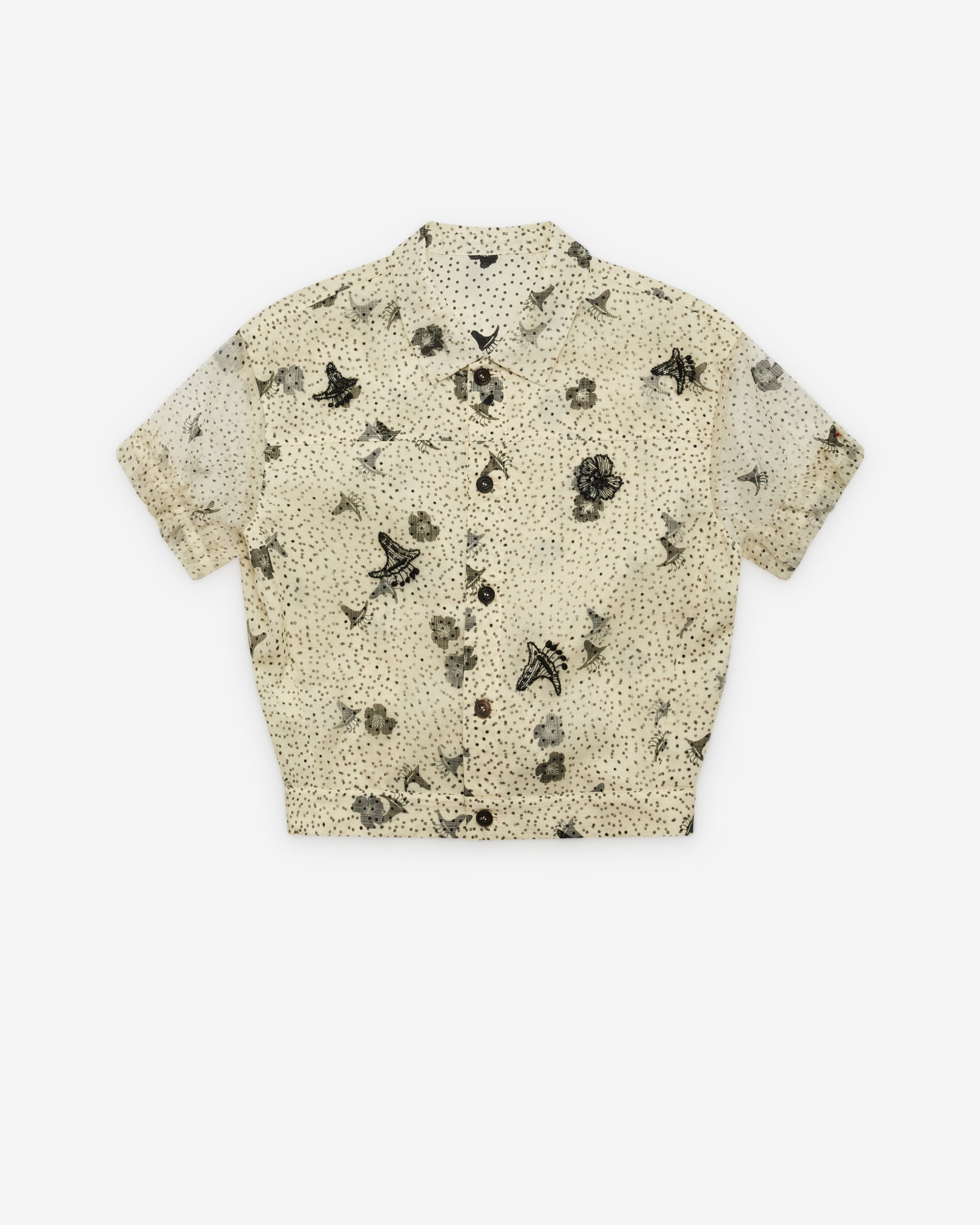 Lightweight silk shirt topRelaxed fitSheer short sleevesFront button closurePolka dots and floral prints Embroidery details
