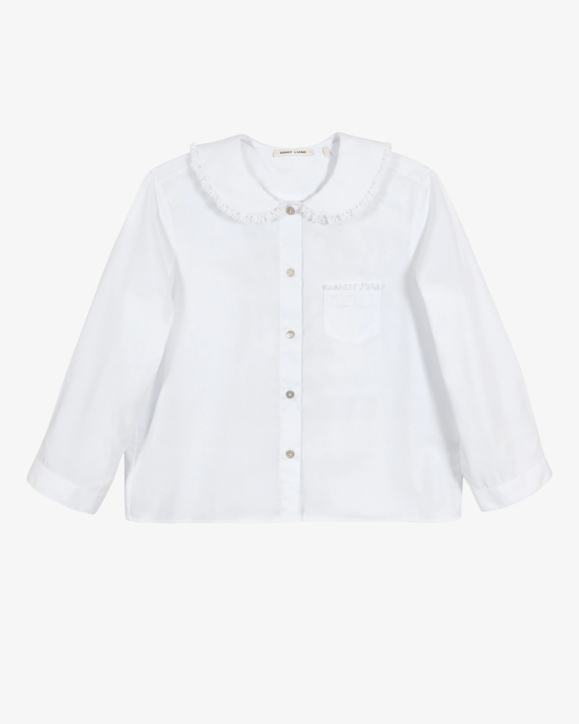 Shrunken fit shirt in White CottonFeatures lace trim throughoutPeter Pan collarMother of Pearl buttonsEmbroidery detail at chest pocket