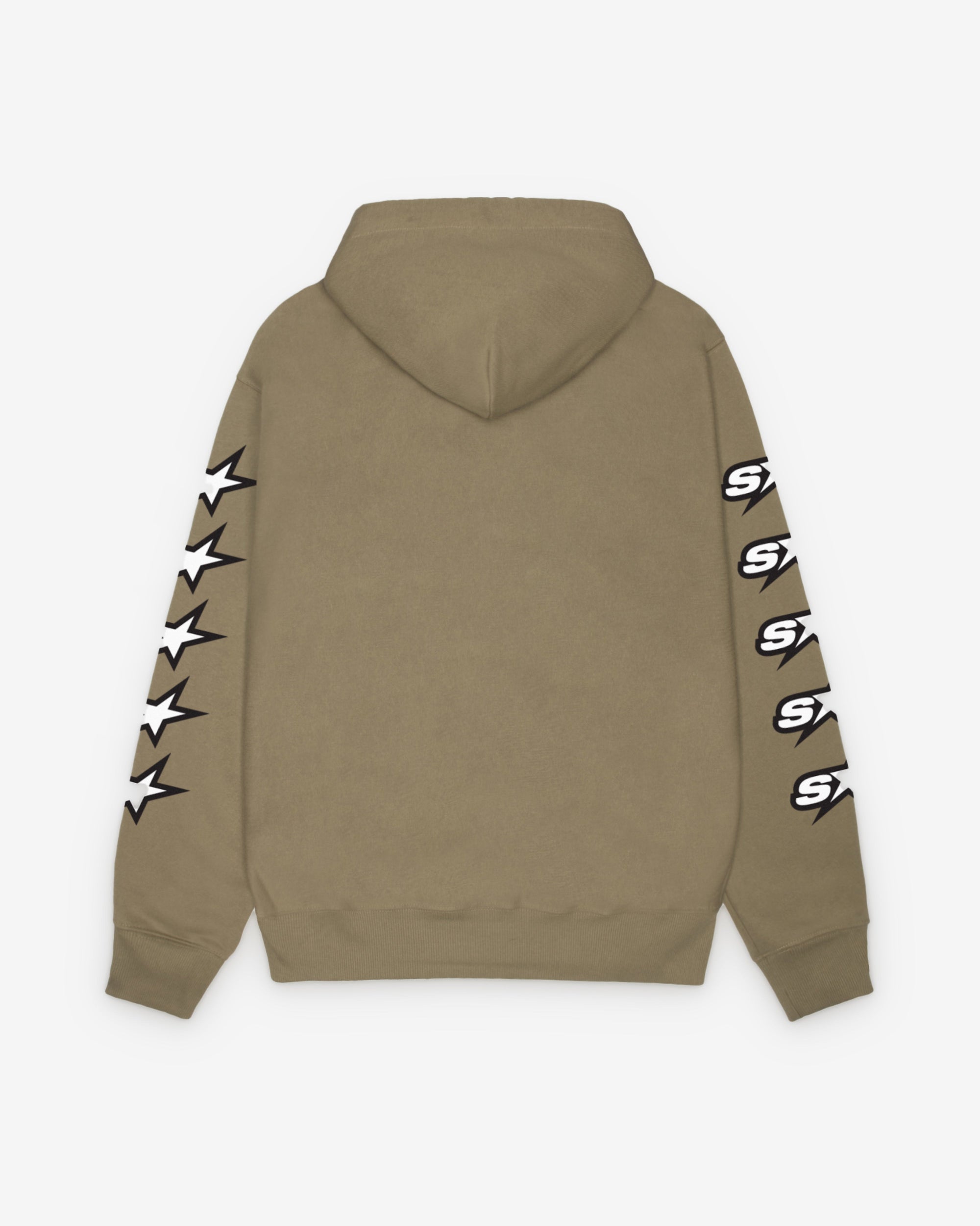 Relaxed fit zip-front fleece hoodieHeavyweight 430gsm cotton blendRound drawcord in hoodYKK zip front closureScreenprinted graphics at sleevesRibbed cuffs and hemPatch pocketsUnisexMaterial: 75% cotton / 25% polyesterImported
