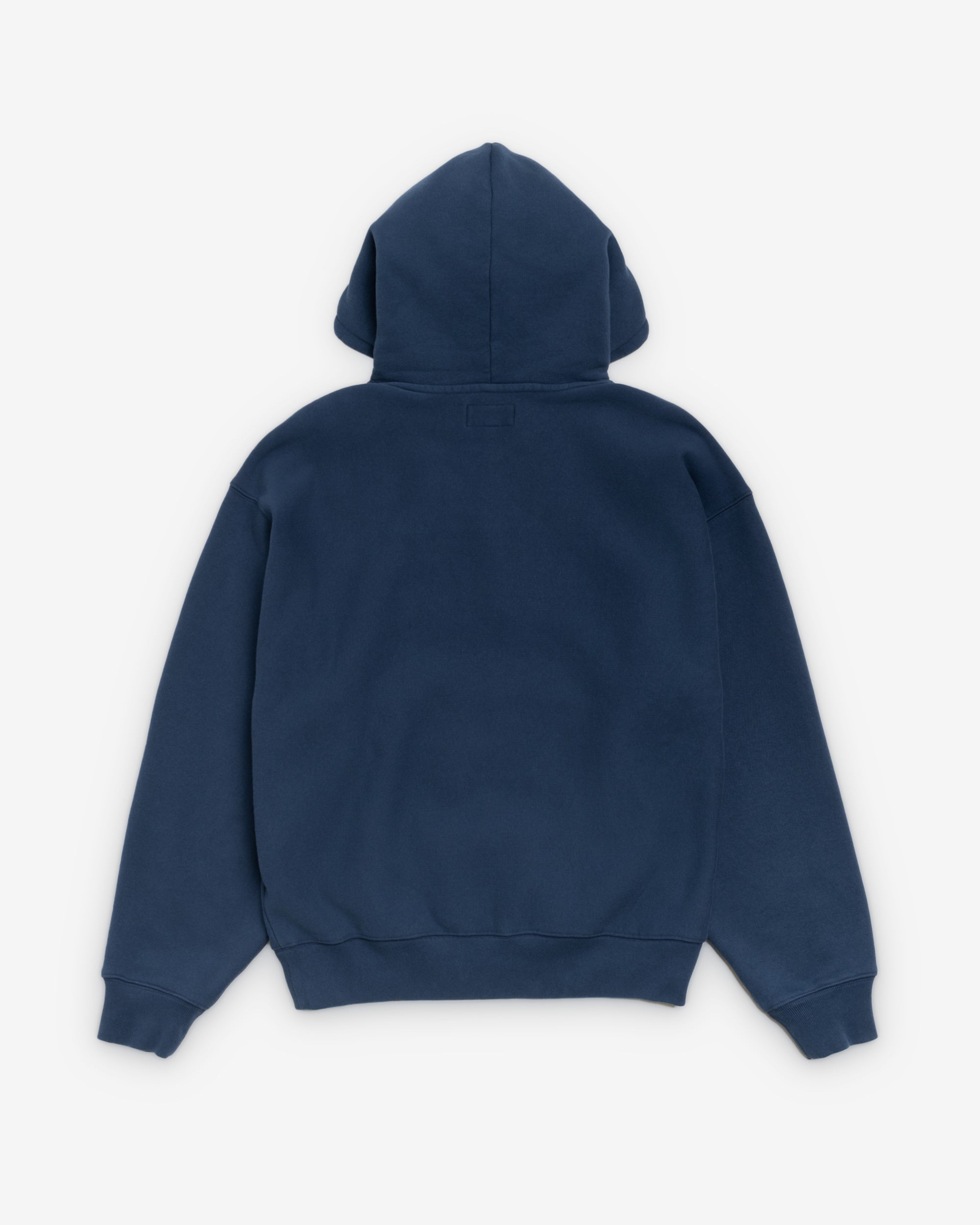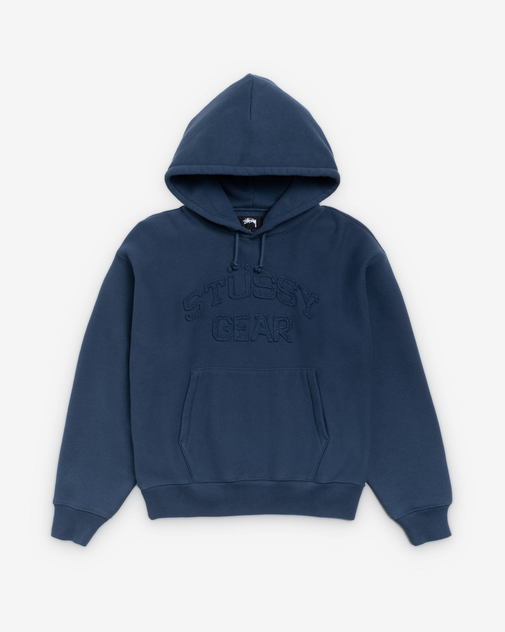 Boxy fit hoodieHeavyweight 535gsm cotton blend fleeceRound woven drawcord in hoodStüssy gear applique at frontRibbed cuffs and hemKangaroo pocketUnisexMaterial: 66% cotton / 34% polyesterImported