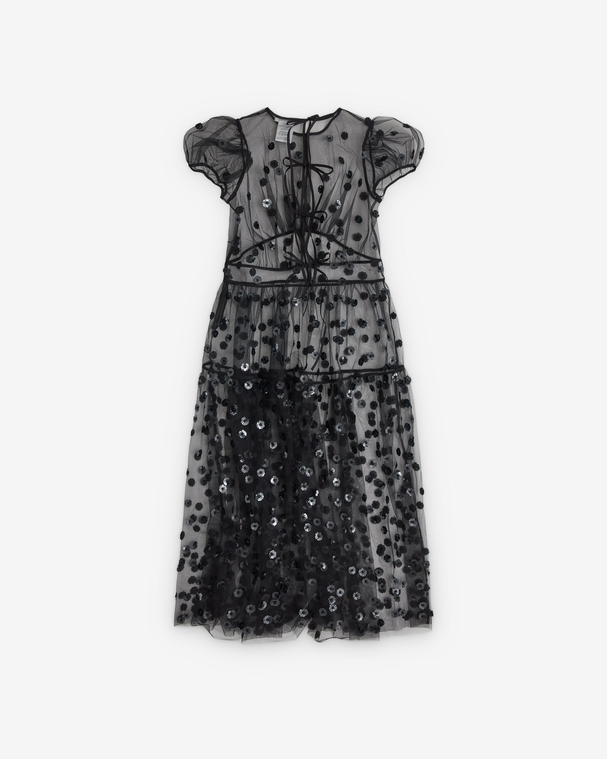 Short puff sleevesSheer sequin fabricTiered structure Subtle sinching at westSequin Blossom Tulle