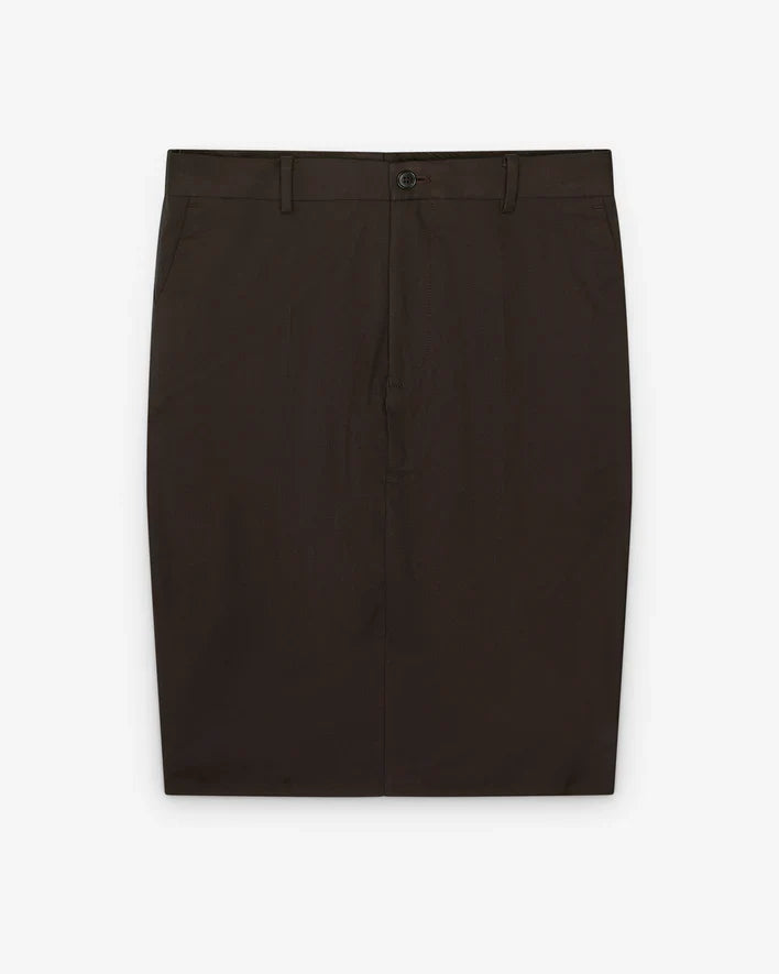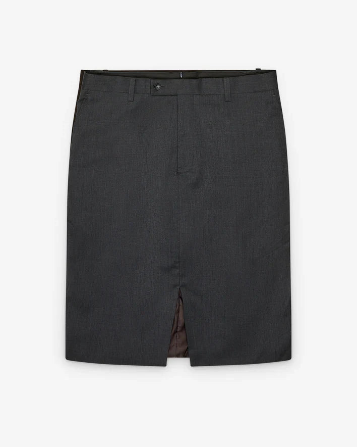 Two suit trousers converted to a midi skirt Hanging front and back detail CB back zip closure Side pockets
