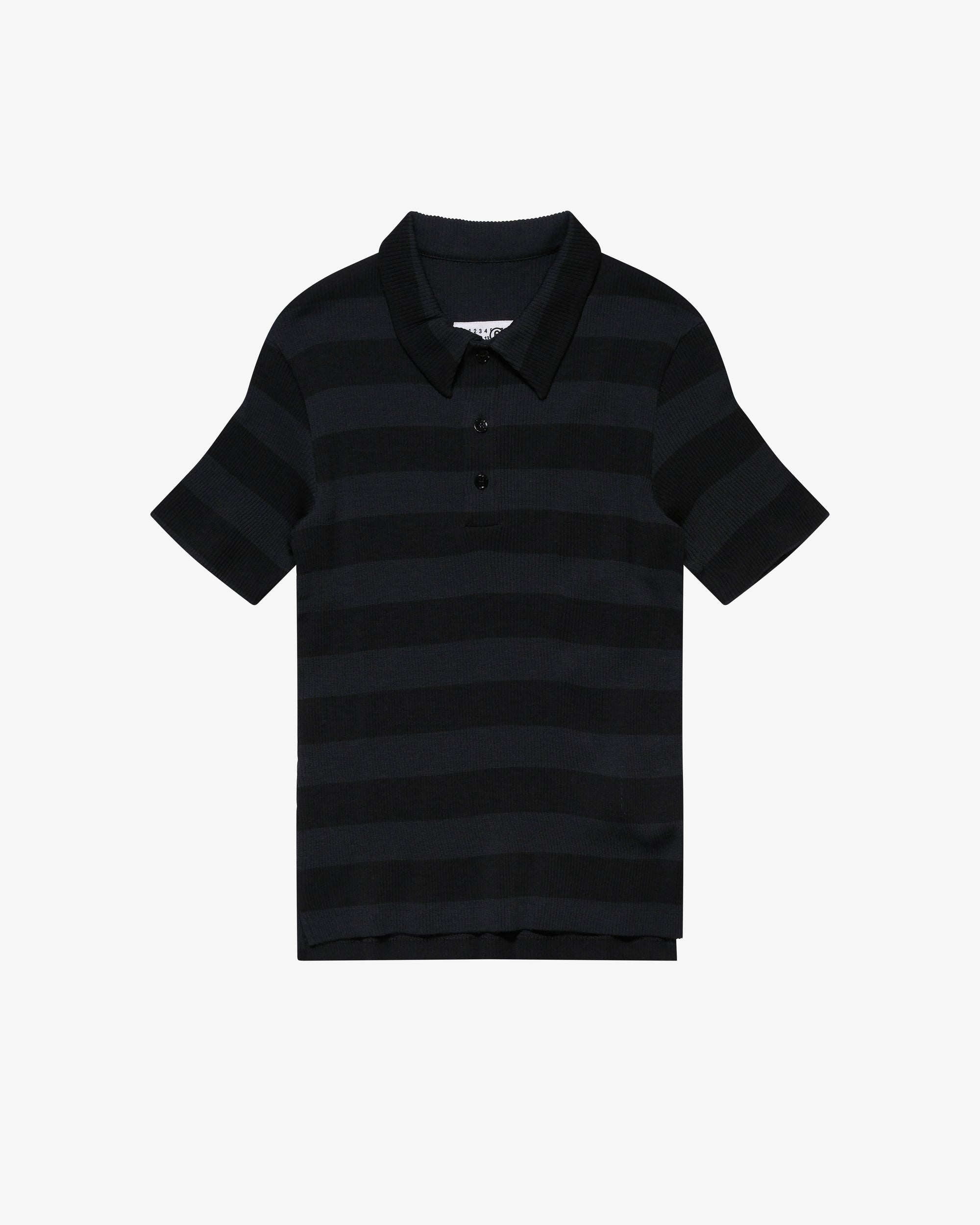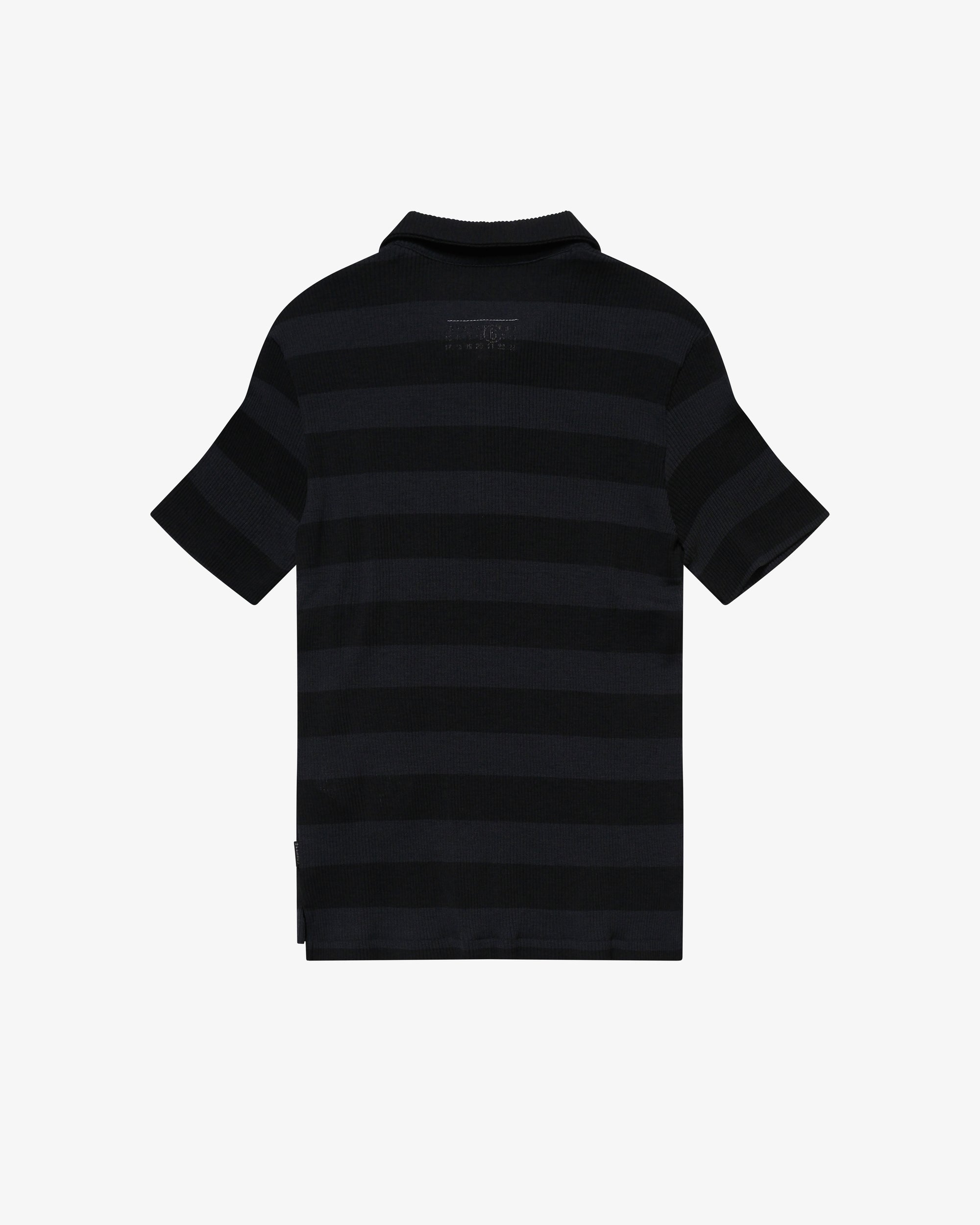 Short-sleeve polo shirt in ribbed knit Horizontal stripe pattern Three-button placket Numeric artwork and white stitch line at the back