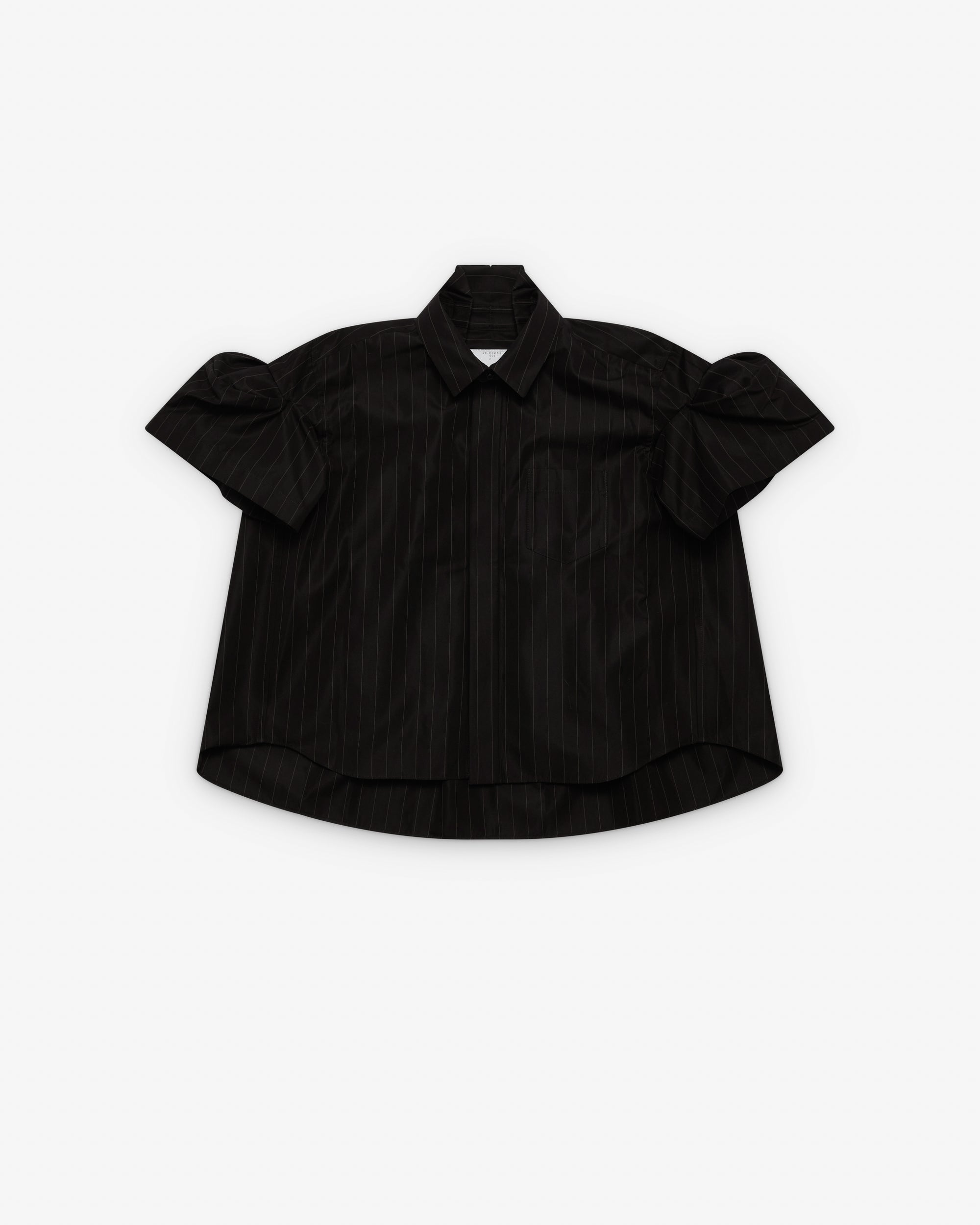 Classic collarShort puff sleevesPin stripe fabricBoxy fitDrop rear hem