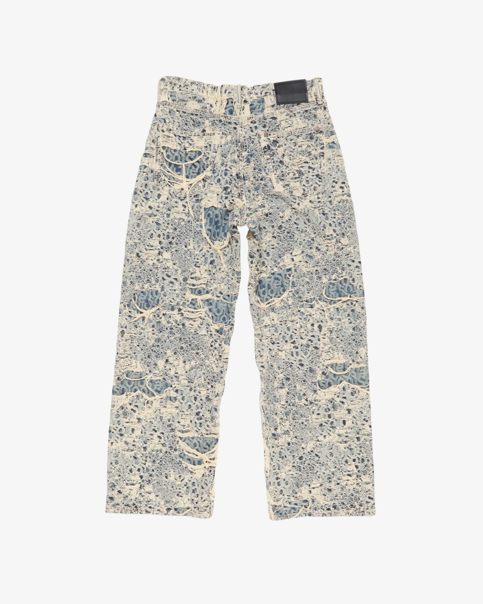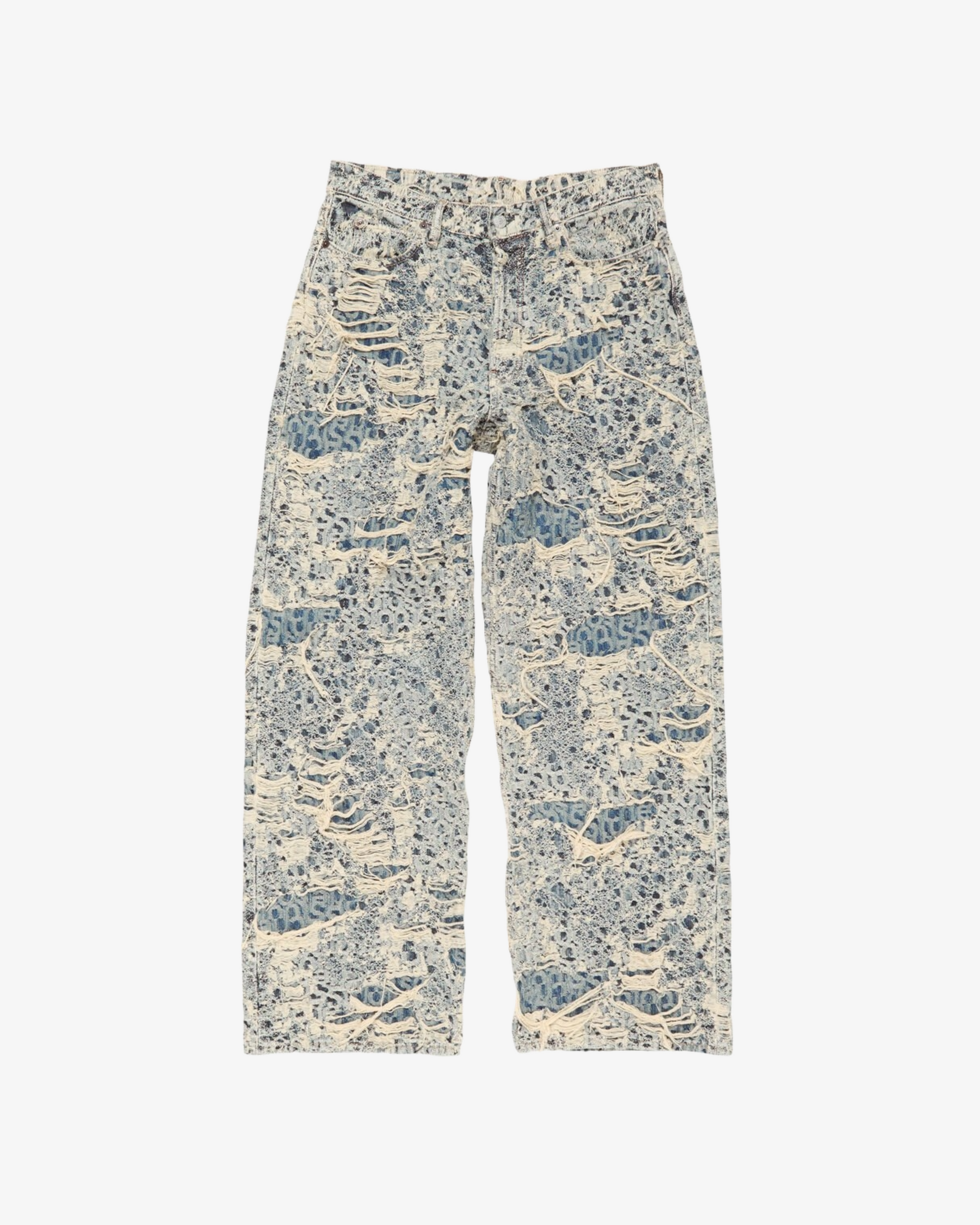 Baggy fit Low waist Wide leg Long length Distressed monogram Back leather logo patch 5-Pocket construction Button fly
