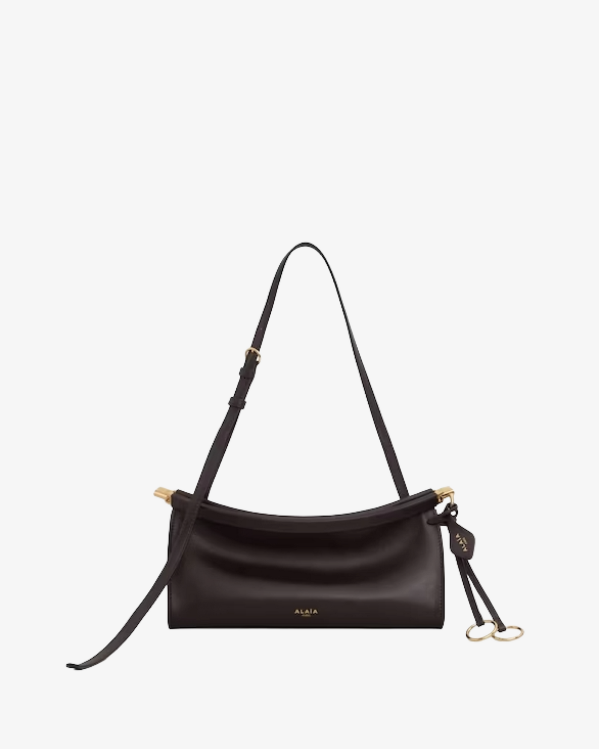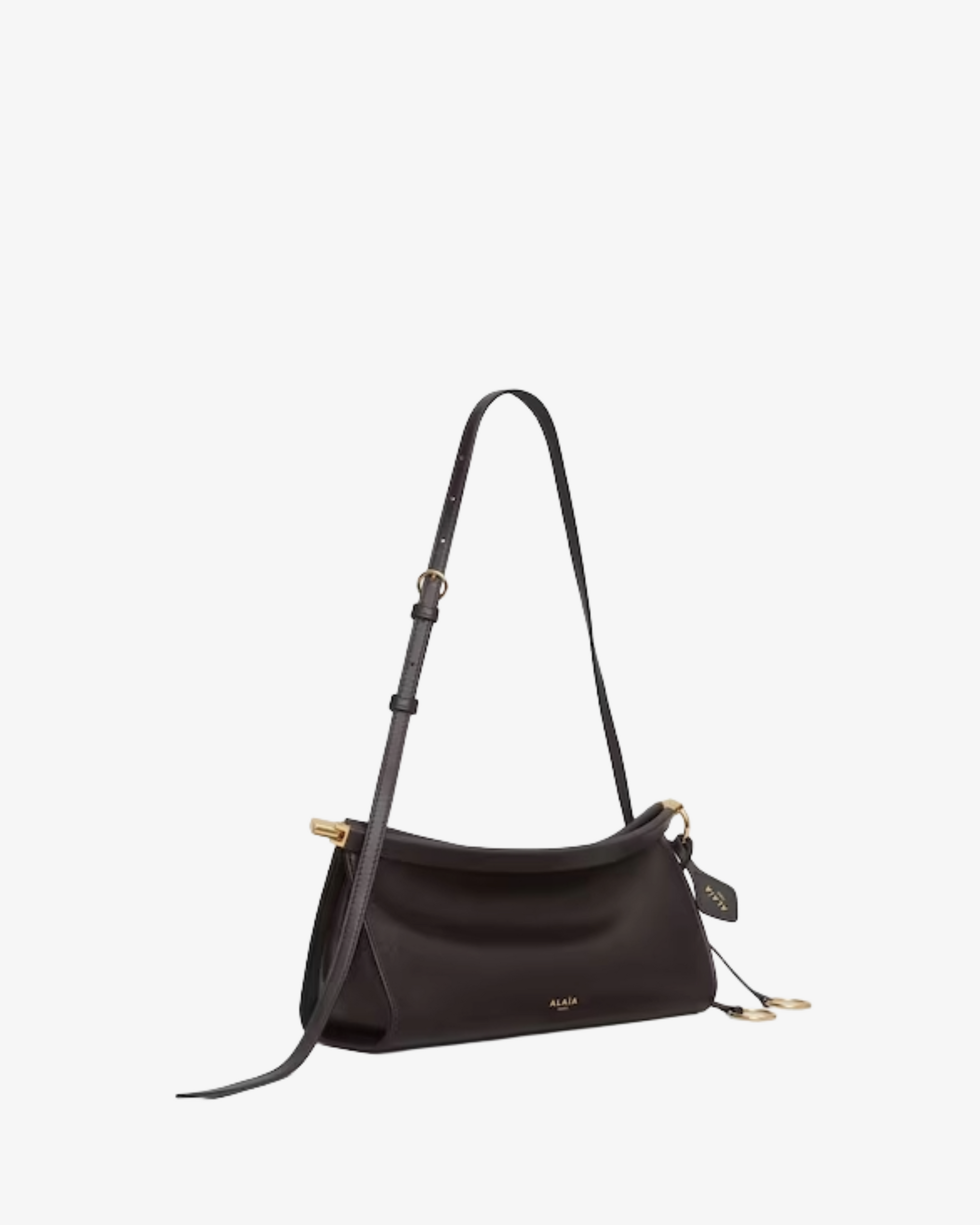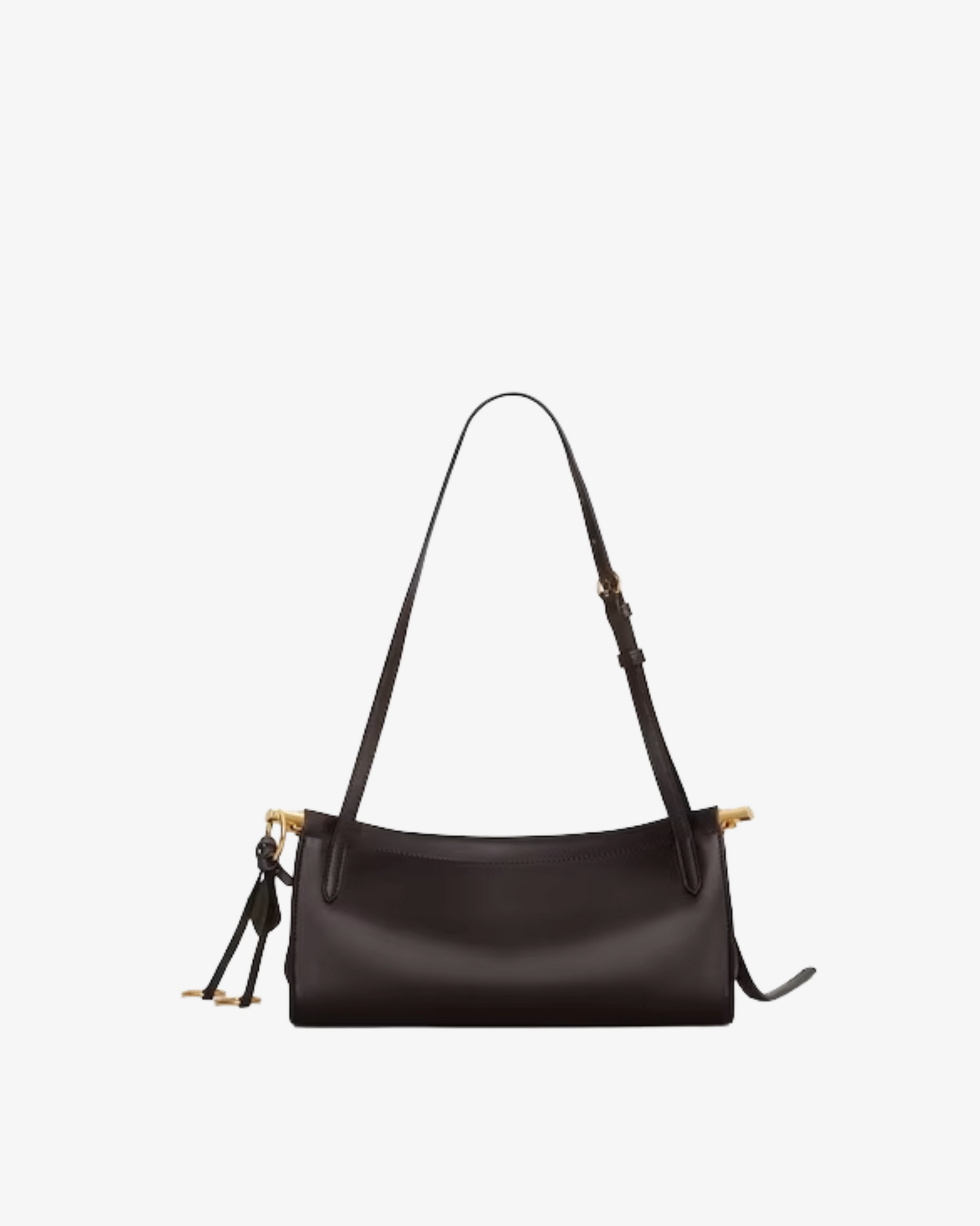 Small East West curved bag that hugs the body Hinge opening system wrapped with leather Signature folding detail on the bottom ofthe bag Decorative ties with metallic rings Shoulder or waist carry thanks to an adjustable strap Glossy calfskin leather Dimensions (cm) : L 25 X H 12,5 X D 7 Made in Italy