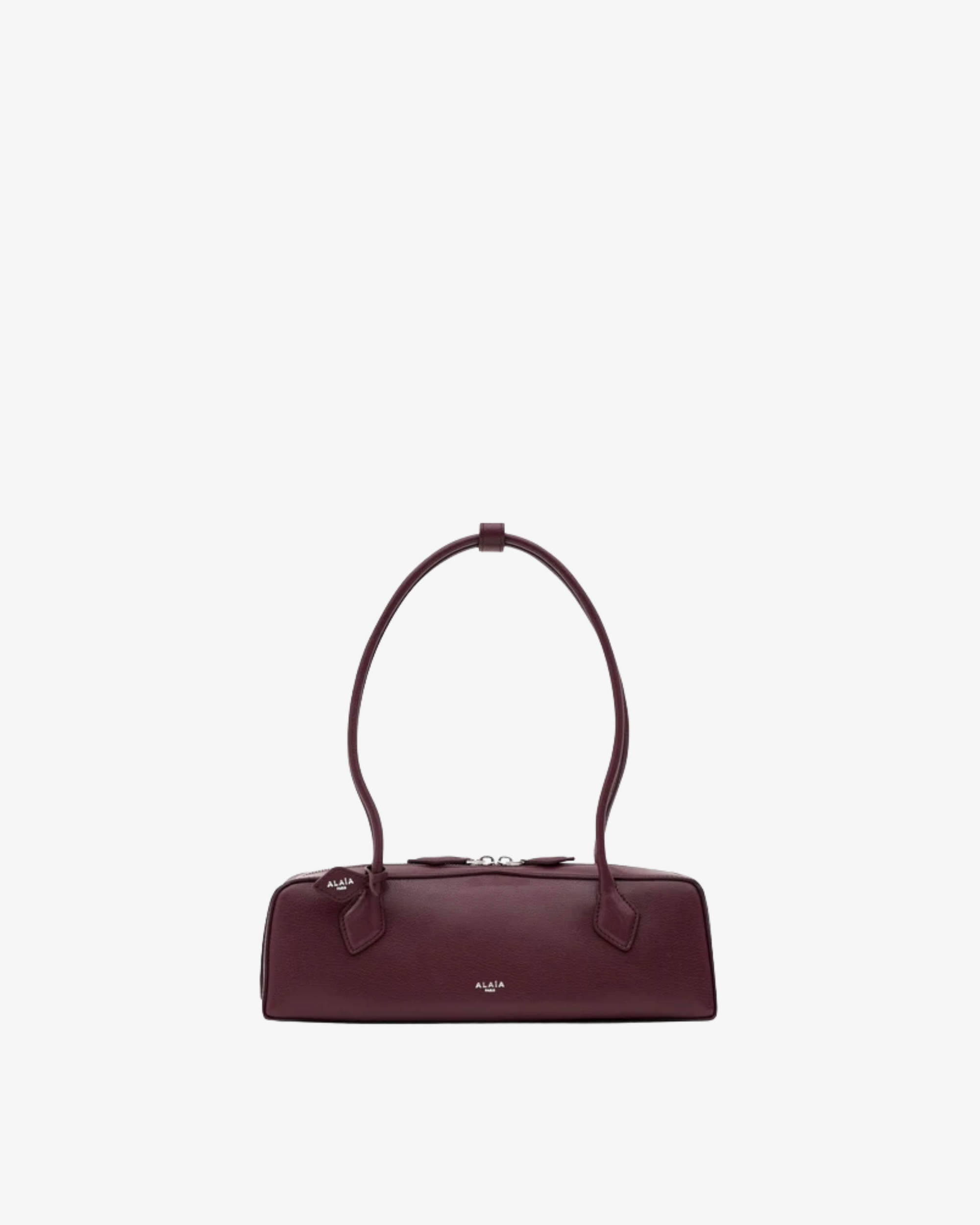 Elongated shapeTubular handles with two decorative tiesDouble zip fasteningSmall removable mirror in the inside pocketDimensions (cm): l 33 x h 11 x d 10