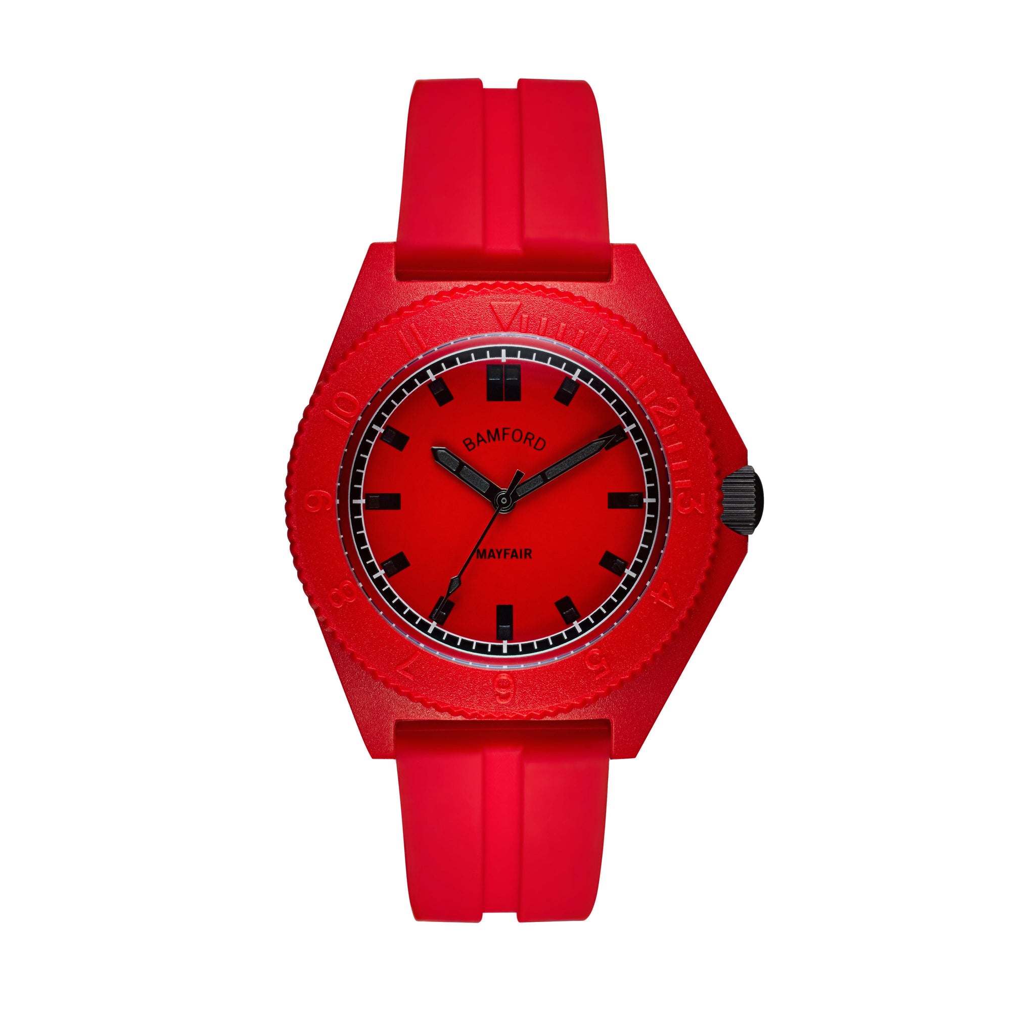 The third timepiece in Bamford London’s signature Mayfair collection, the Mayfair Sport comes in an array of brightly coloured designs, making it a picture-perfect accessory for any occasion. Red with black accents.