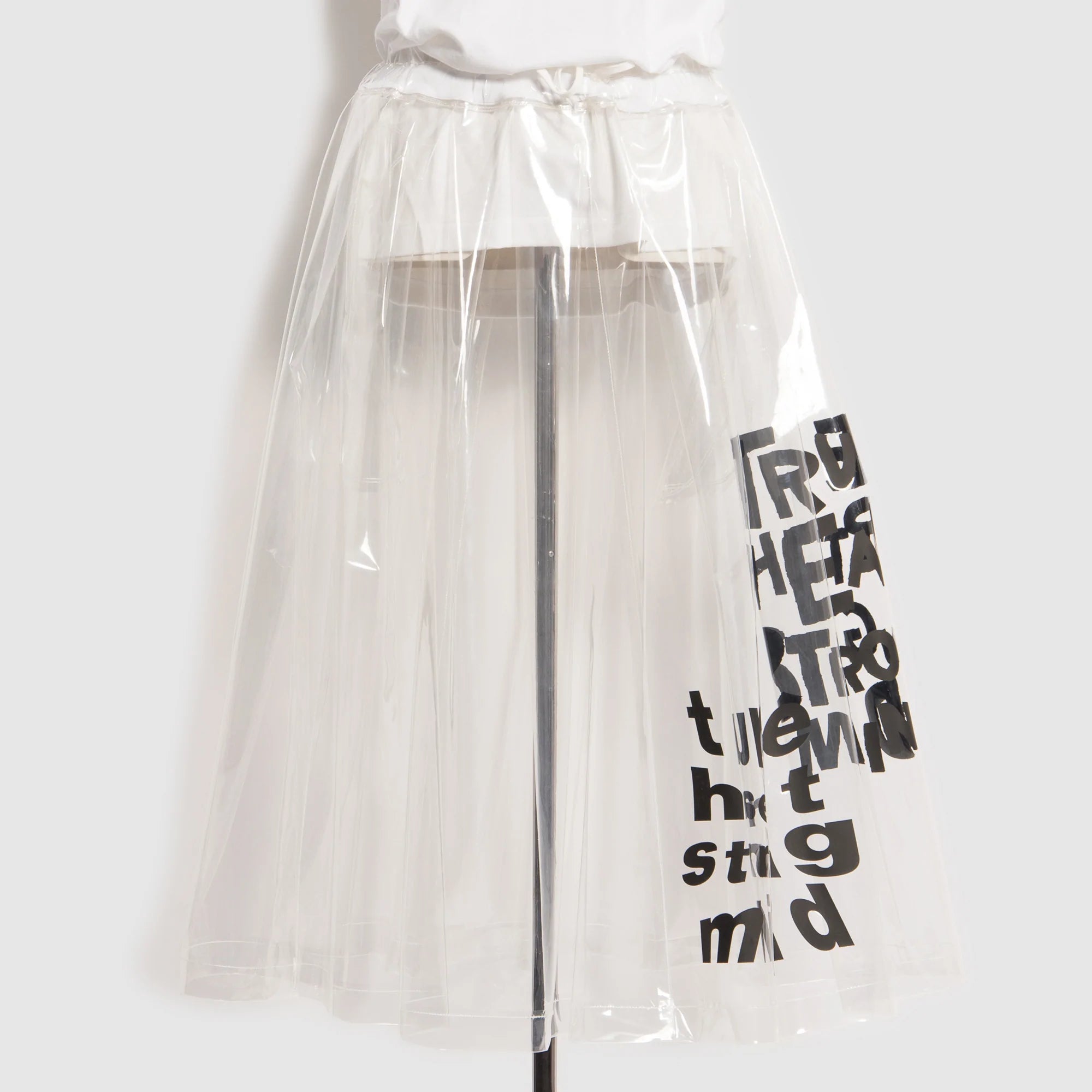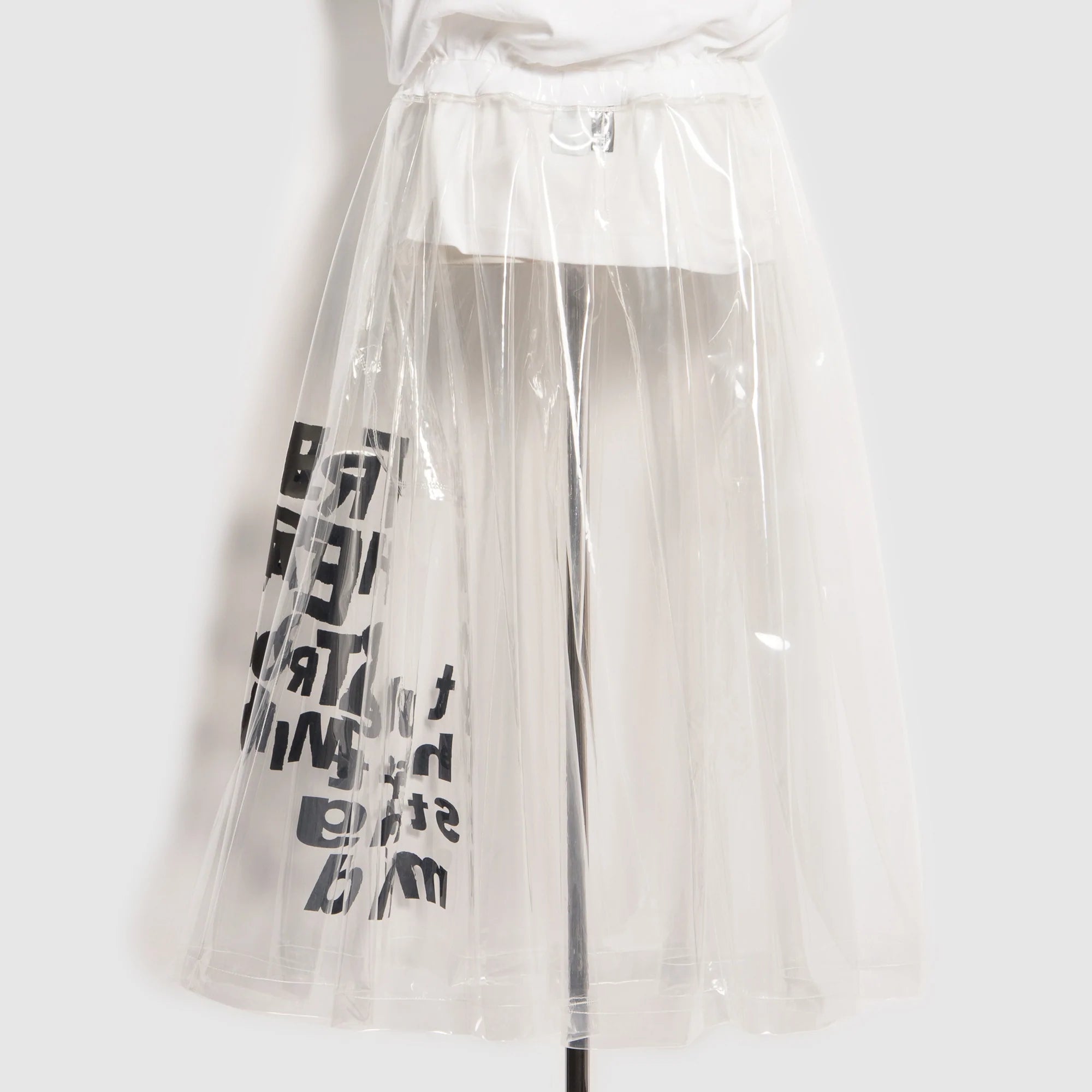 BLACK Comme des Garçons transparent message skirt, featuring an adjustable waist.