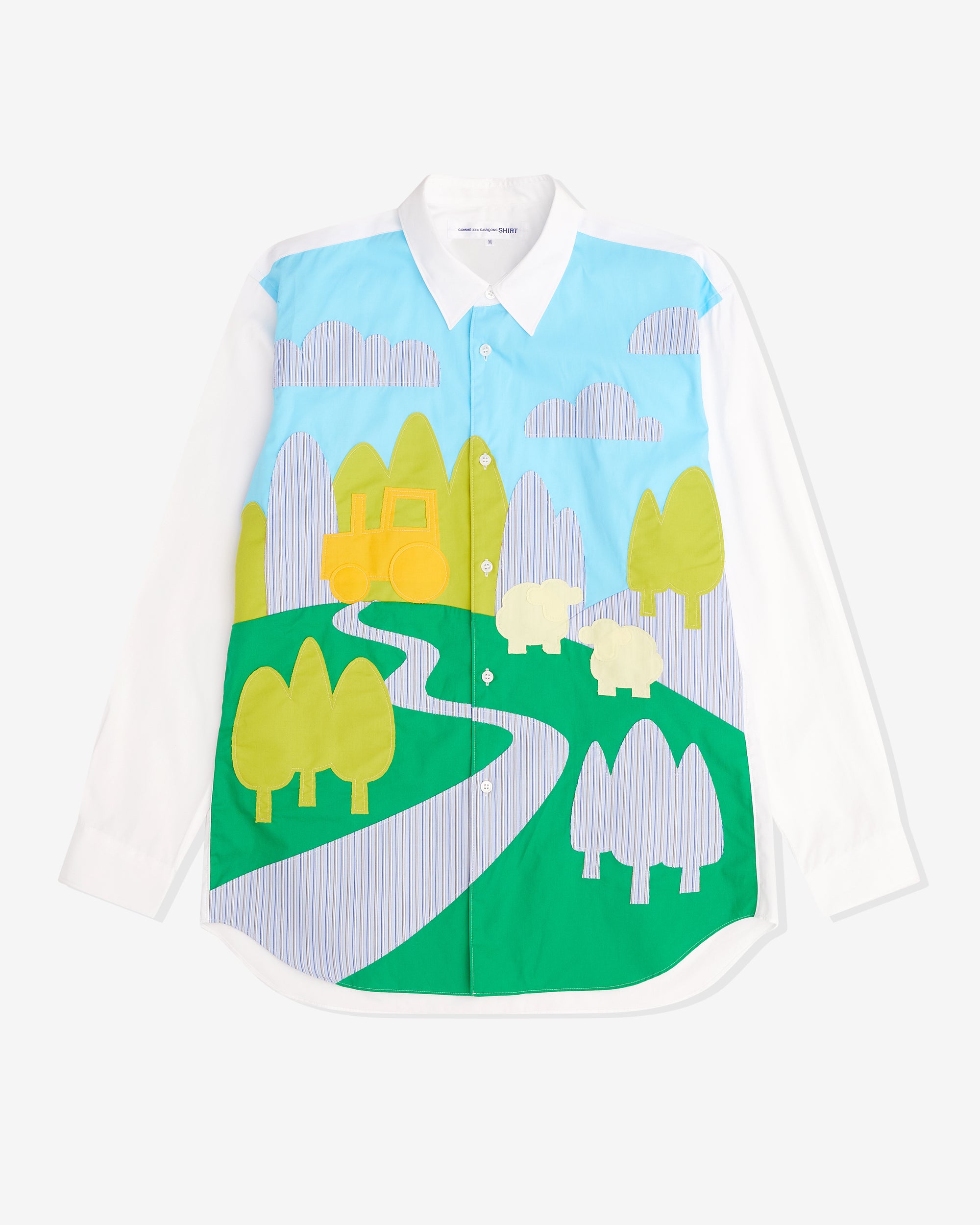 Point collarCurved hemPatch chest pocketButton placketButton cuffsSewn-on farmyard scene