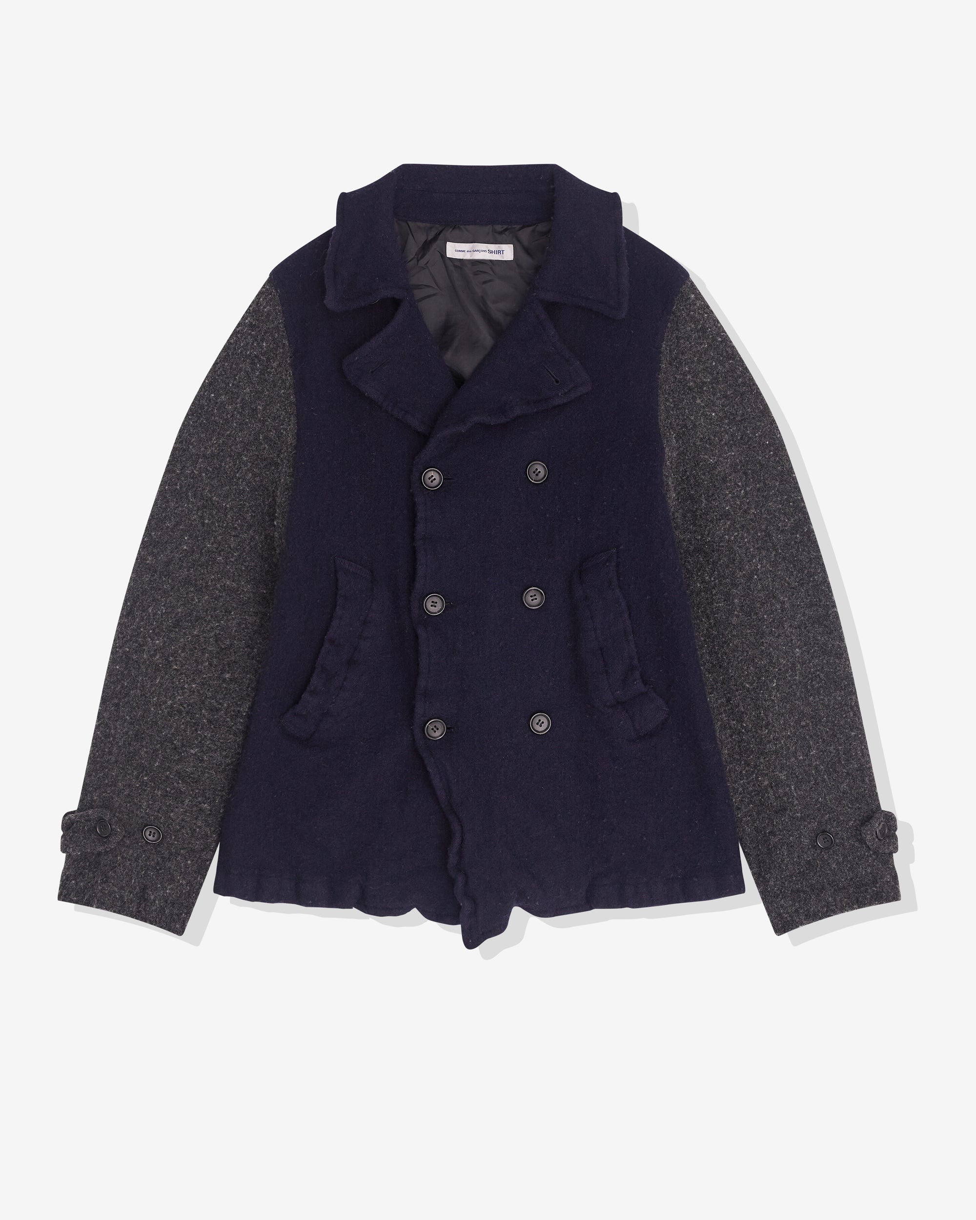 Wide collarDouble breastedSide welt pocketsButton adjusters at cuffsLinedContrast sleevesWashed finish90% Wool, 10% WoolMade in France