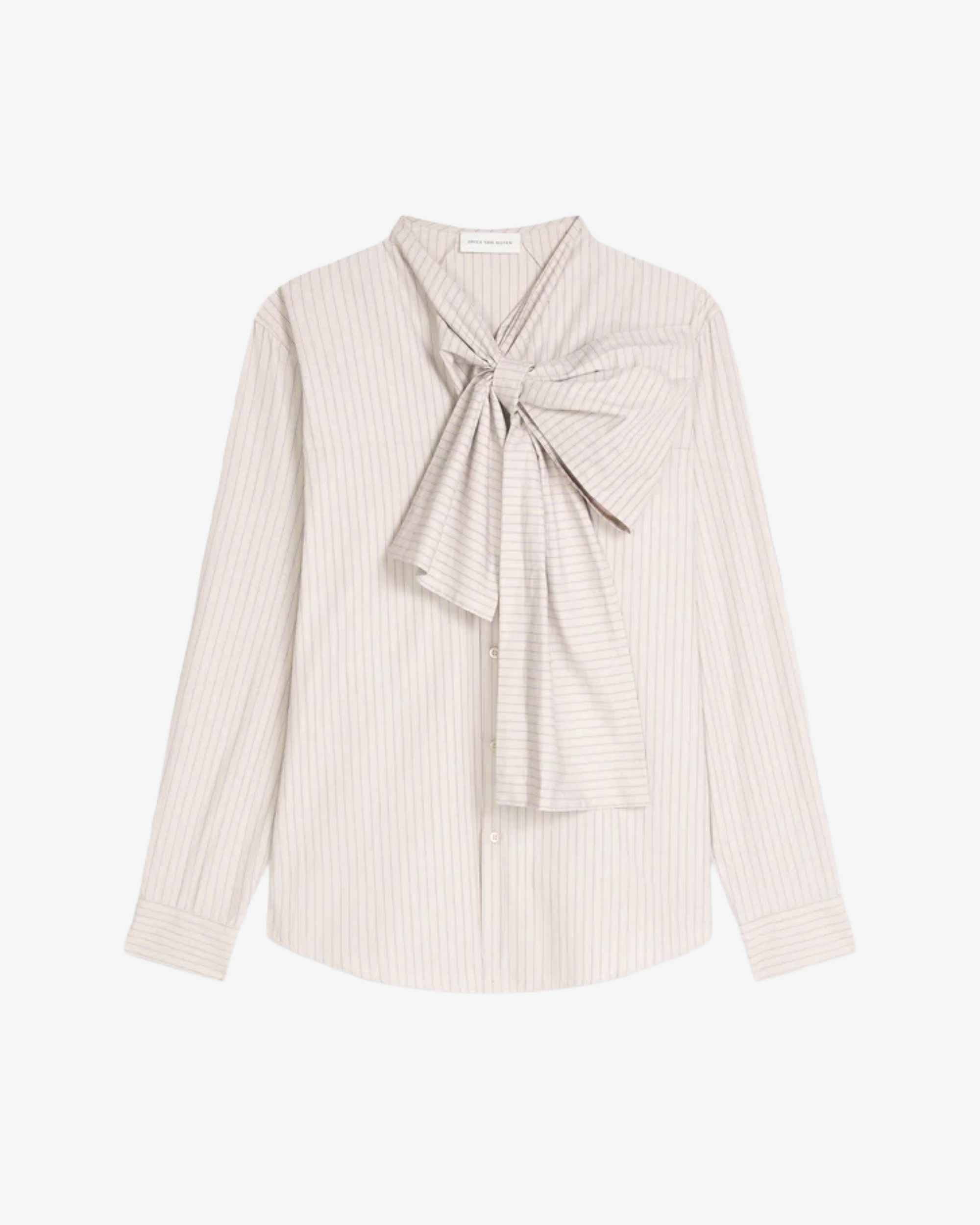 Bow collarStriped patternTight fitButtoned cuffsFront button closure100% Cotton