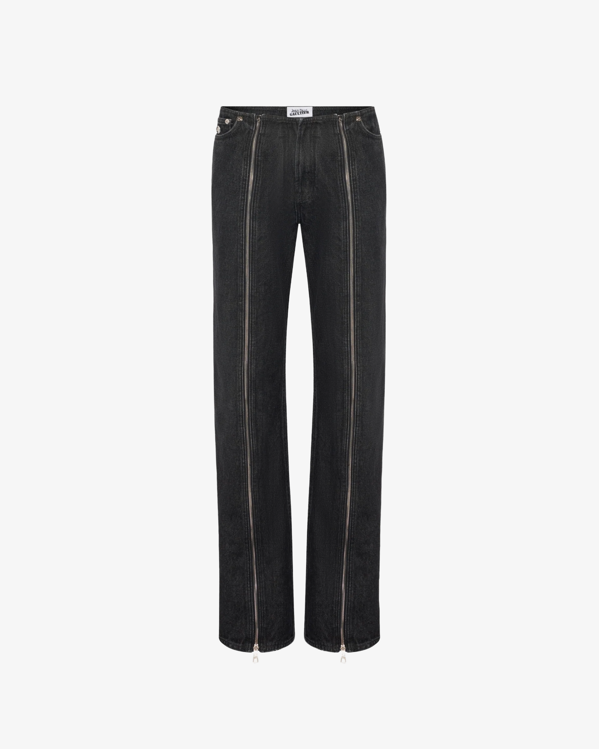 - Straight fit- Low waist- Five pockets- Engraved Jean Paul Gaultier zip fastening details in front of legs- Engraved Jean Paul Gaultier metal plate on right pocket- Engraved Jean Paul Gaultier rivets- Material: 100% cotton- Made in Italy