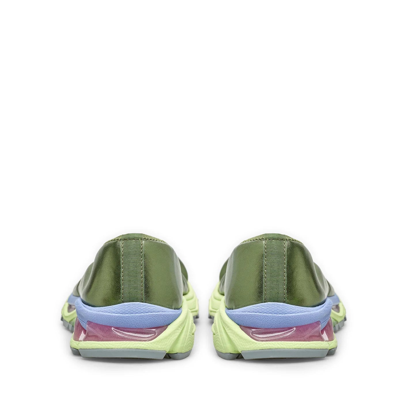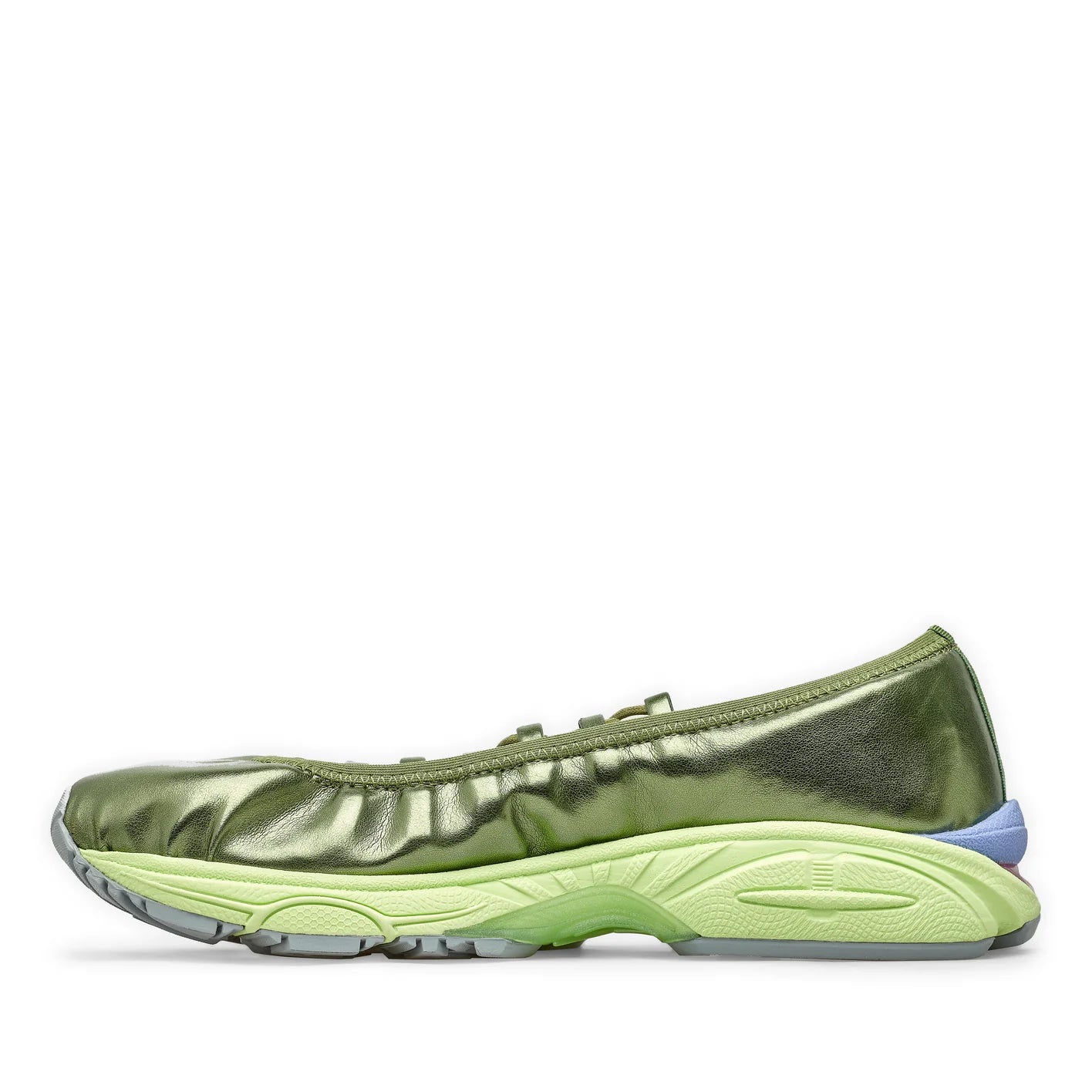 Hybrid sneaker styleLacing system at frontLong multi wear lacesGel cushioning systemGlitter detail in arch construction and gelElastic finishGrosgrain detail on back