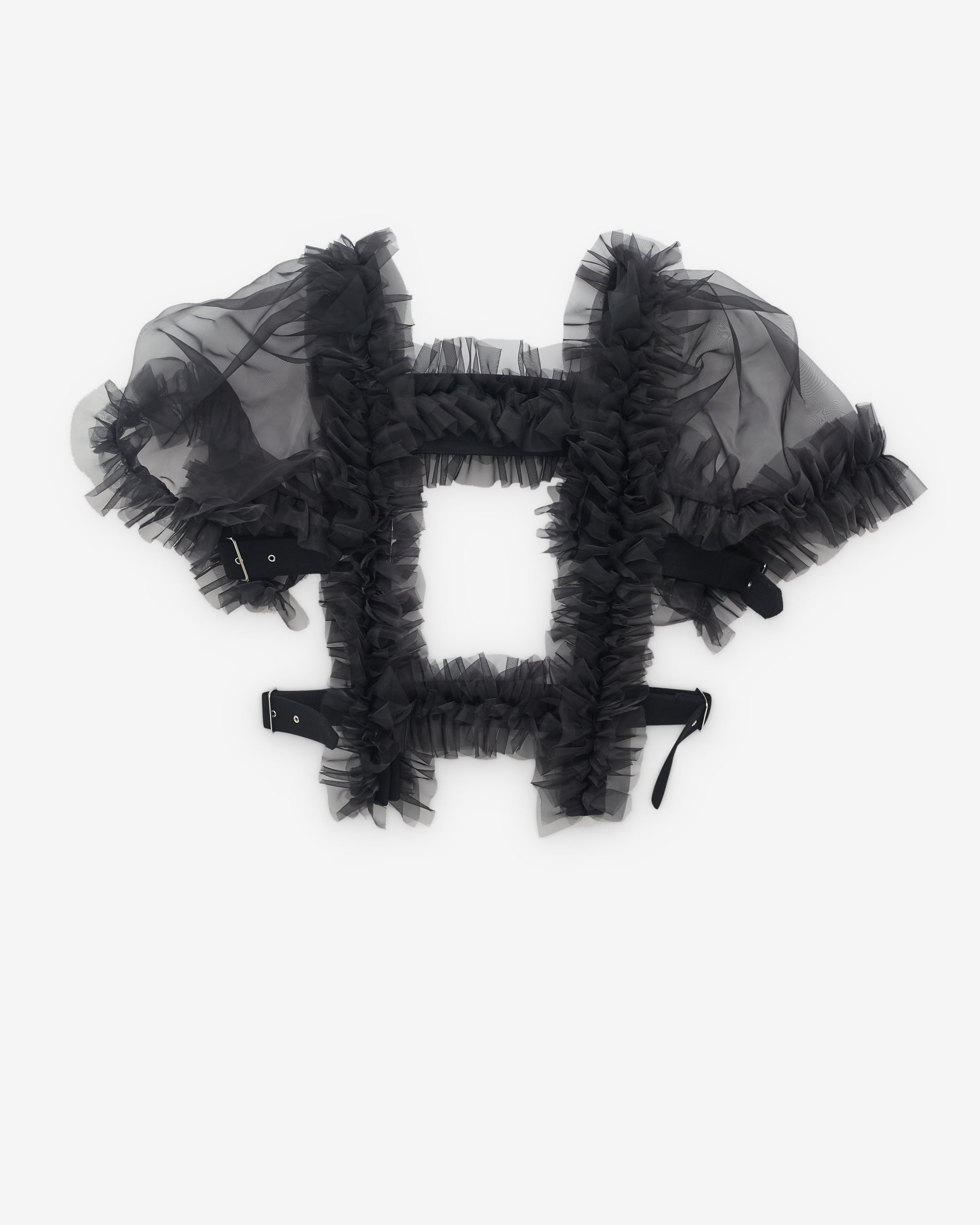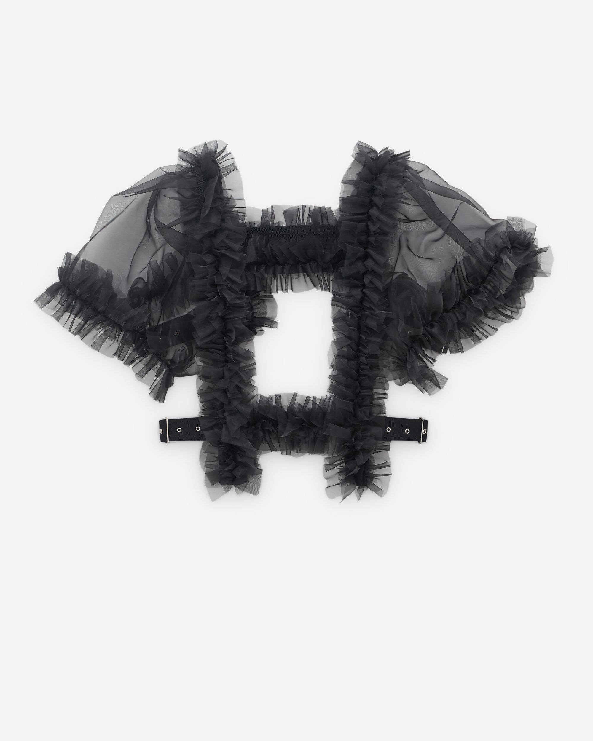 Double faced wool structureRuffle detailShort tulle sleevesSide buckle fastening