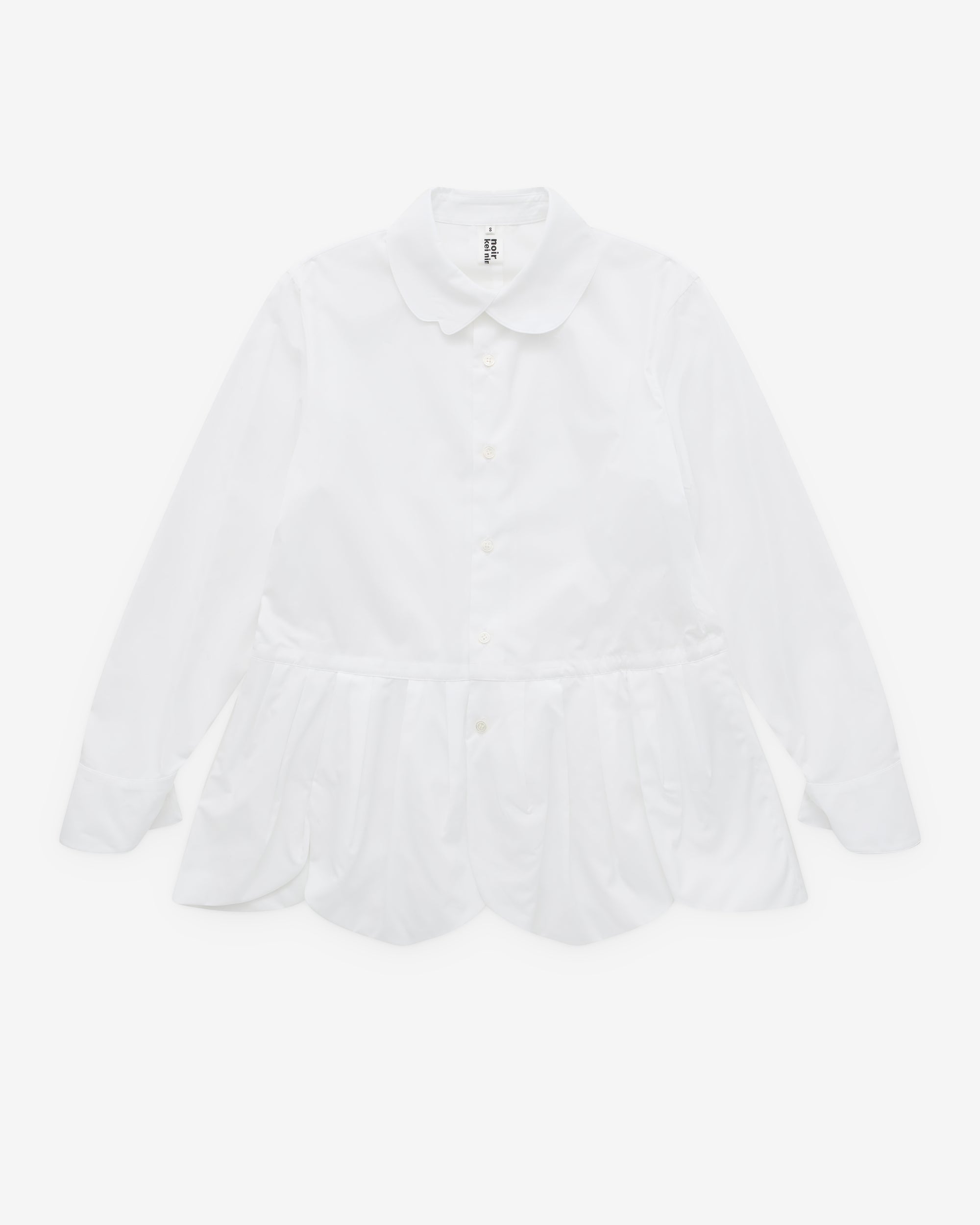 Curved petal collarButton placketCurved cuffsPetal peplum hem at waist