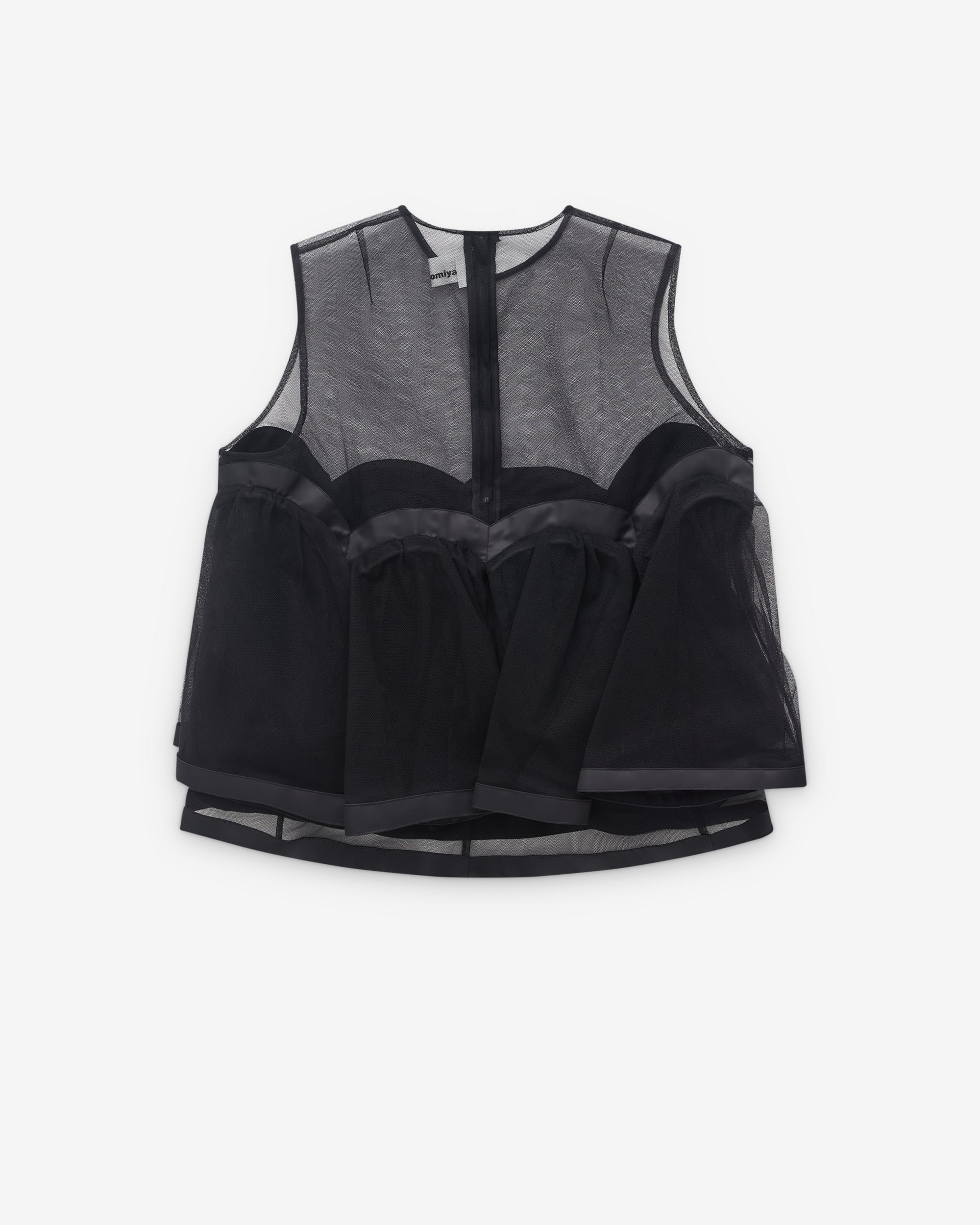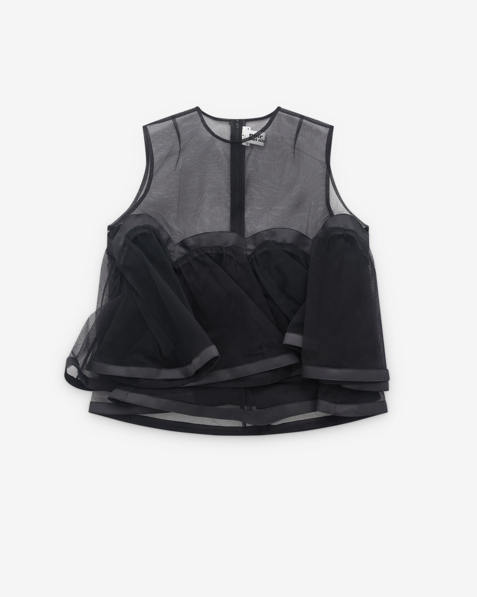Round neckSleevelessVoluminous attachments throughout SheerRear zip fasteningA-line silhouette