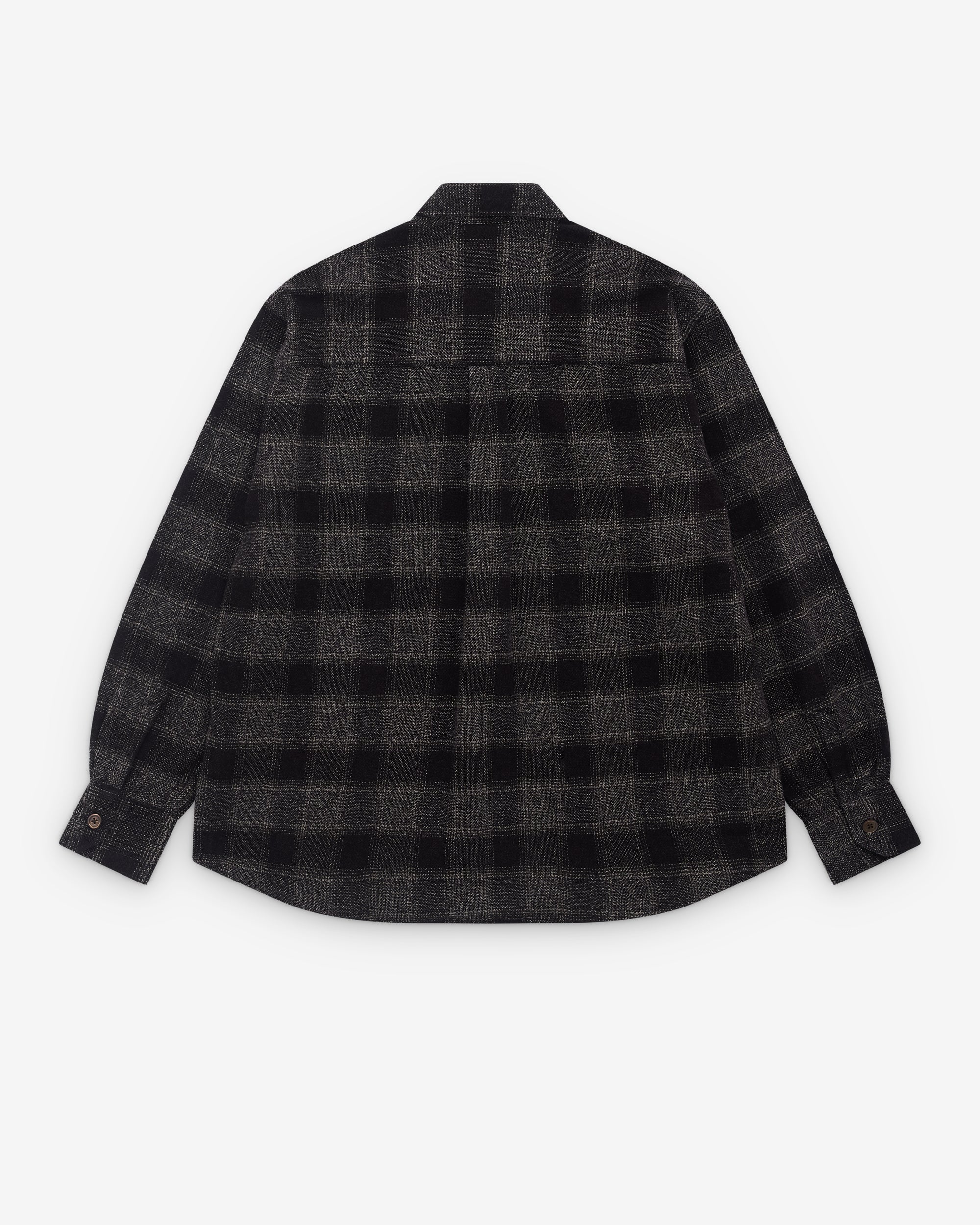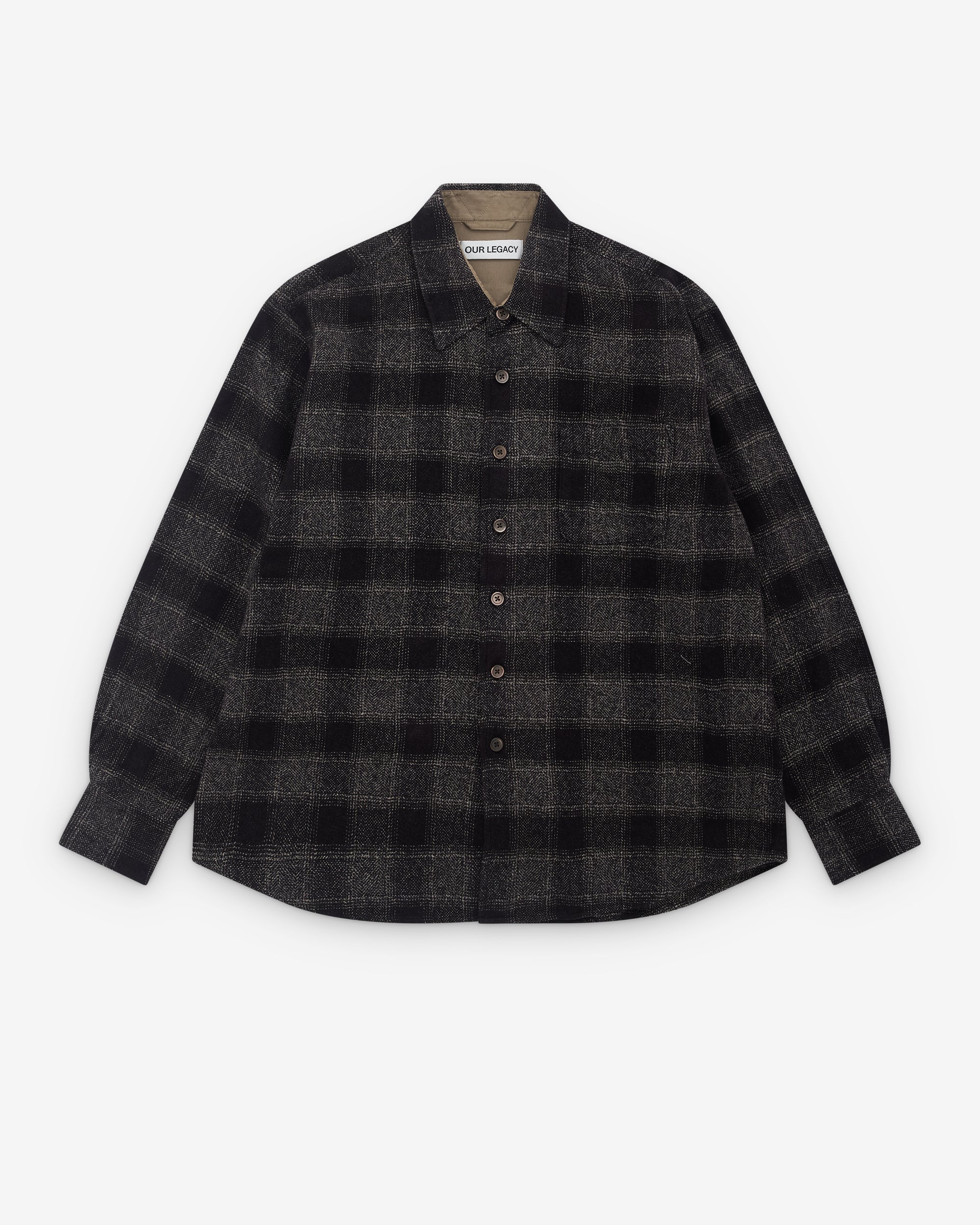 Check patternSingle chest pocketMother of pearl buttonsCurved hemMitered cuffsSlightly oversized fit