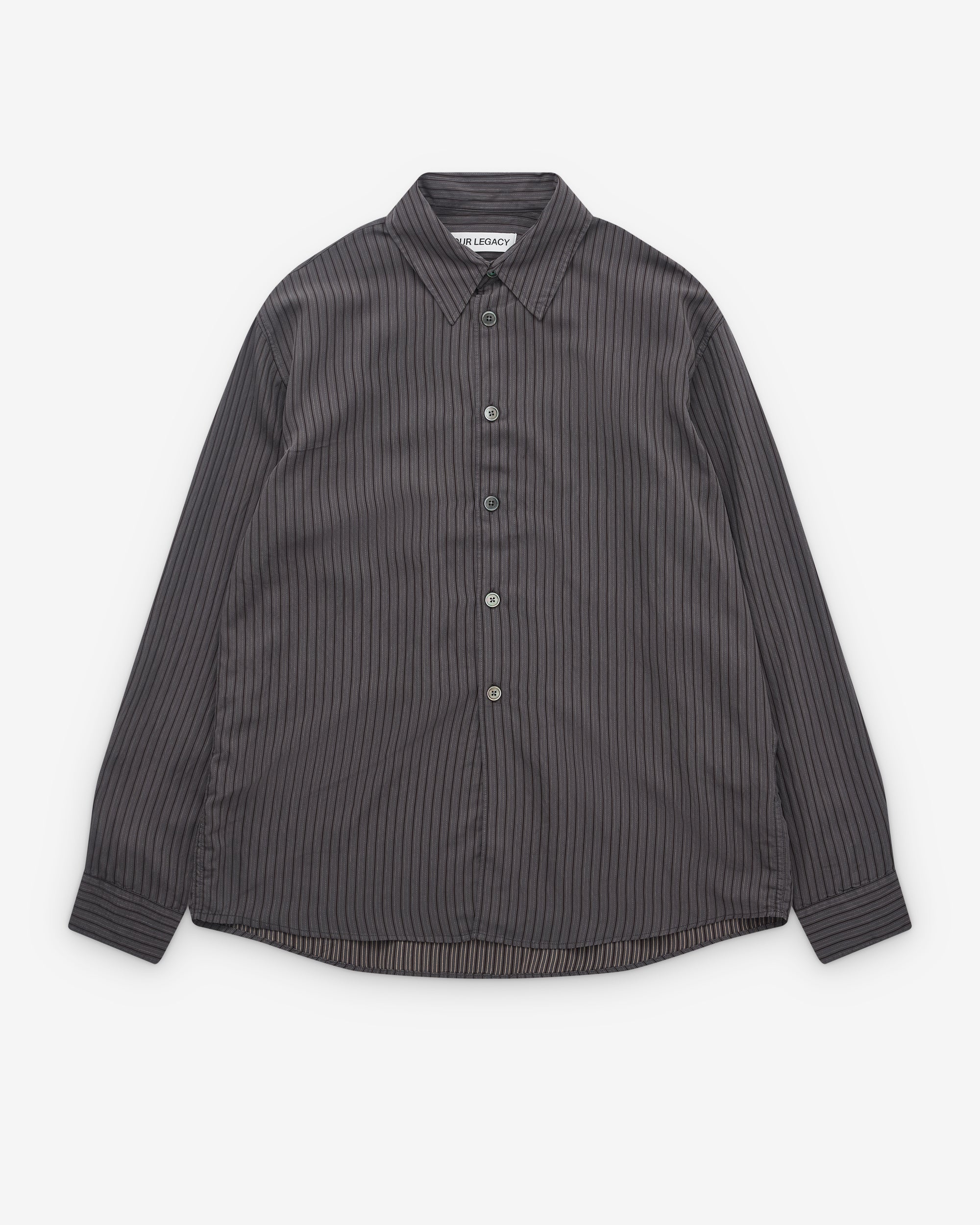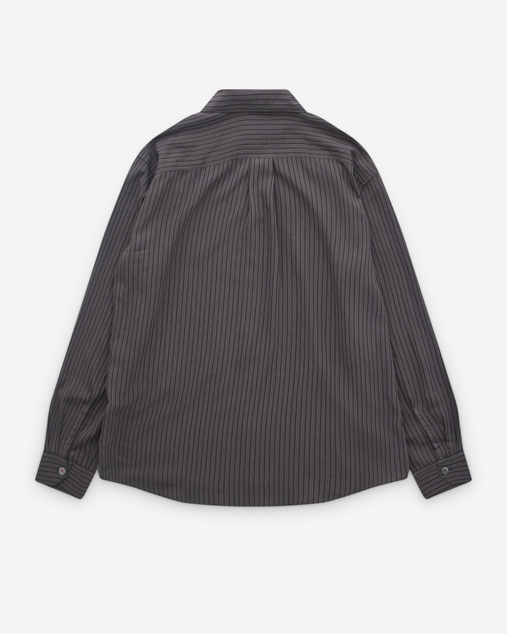 Classic shirt collarFront button closureCurved drop hemRear box pleatButton close cuffs
