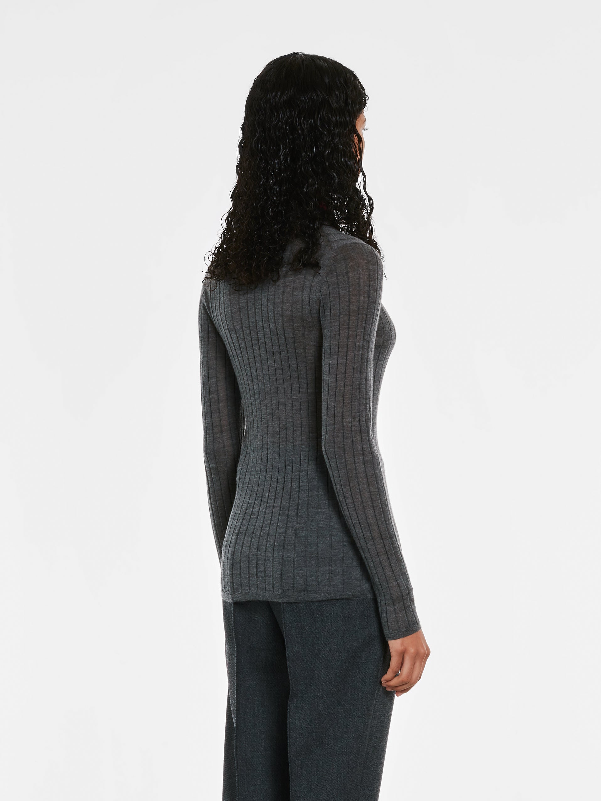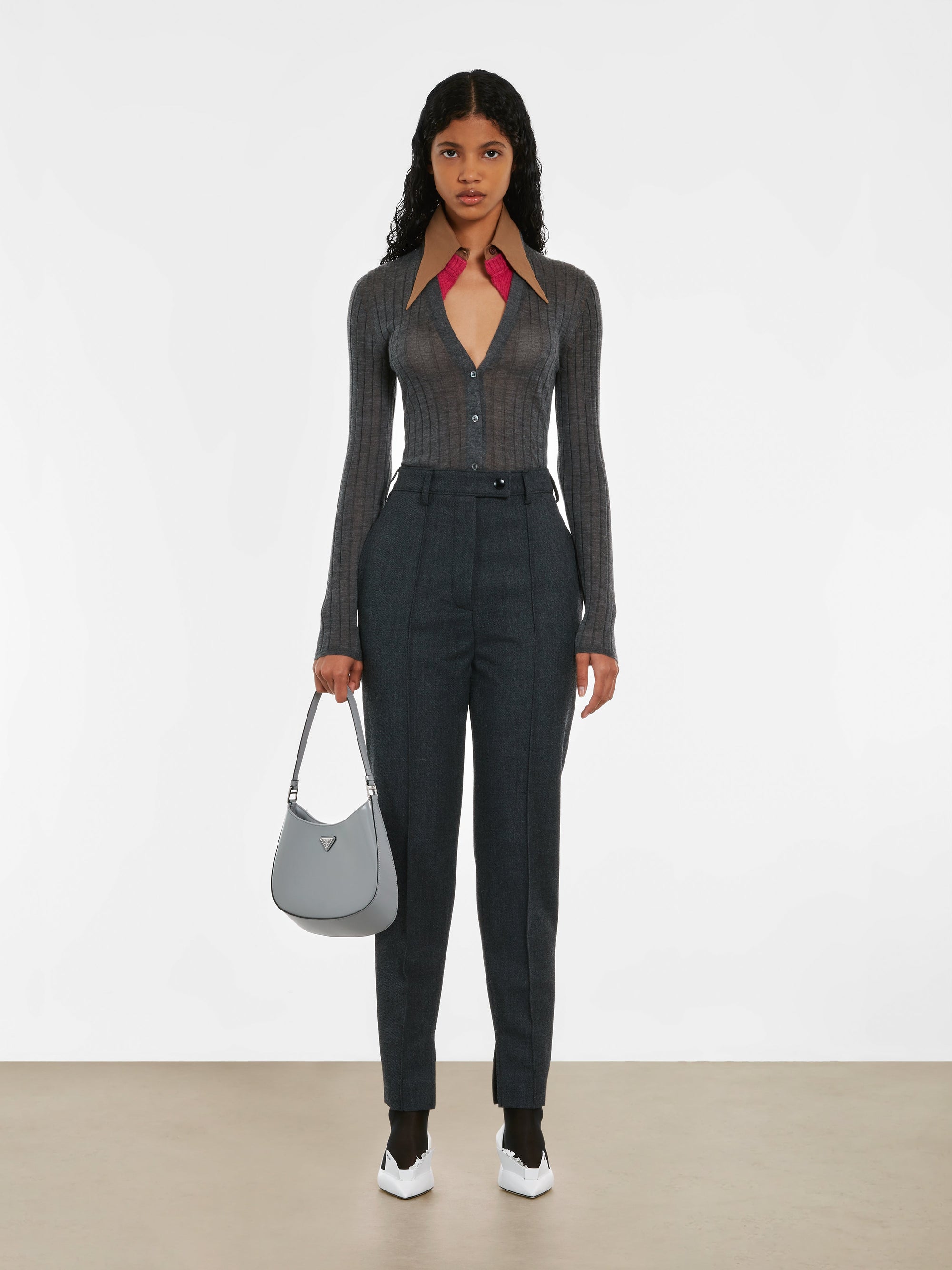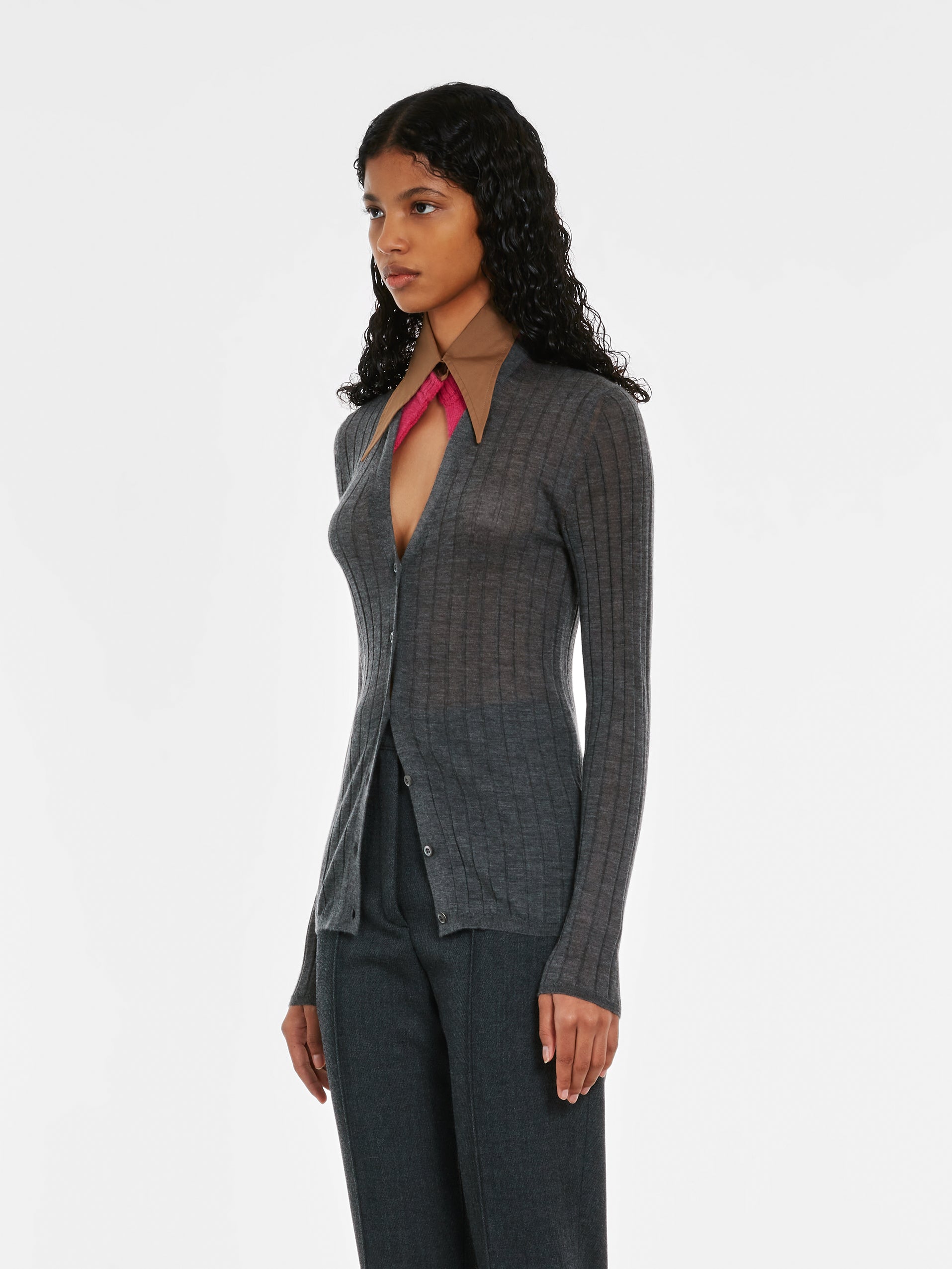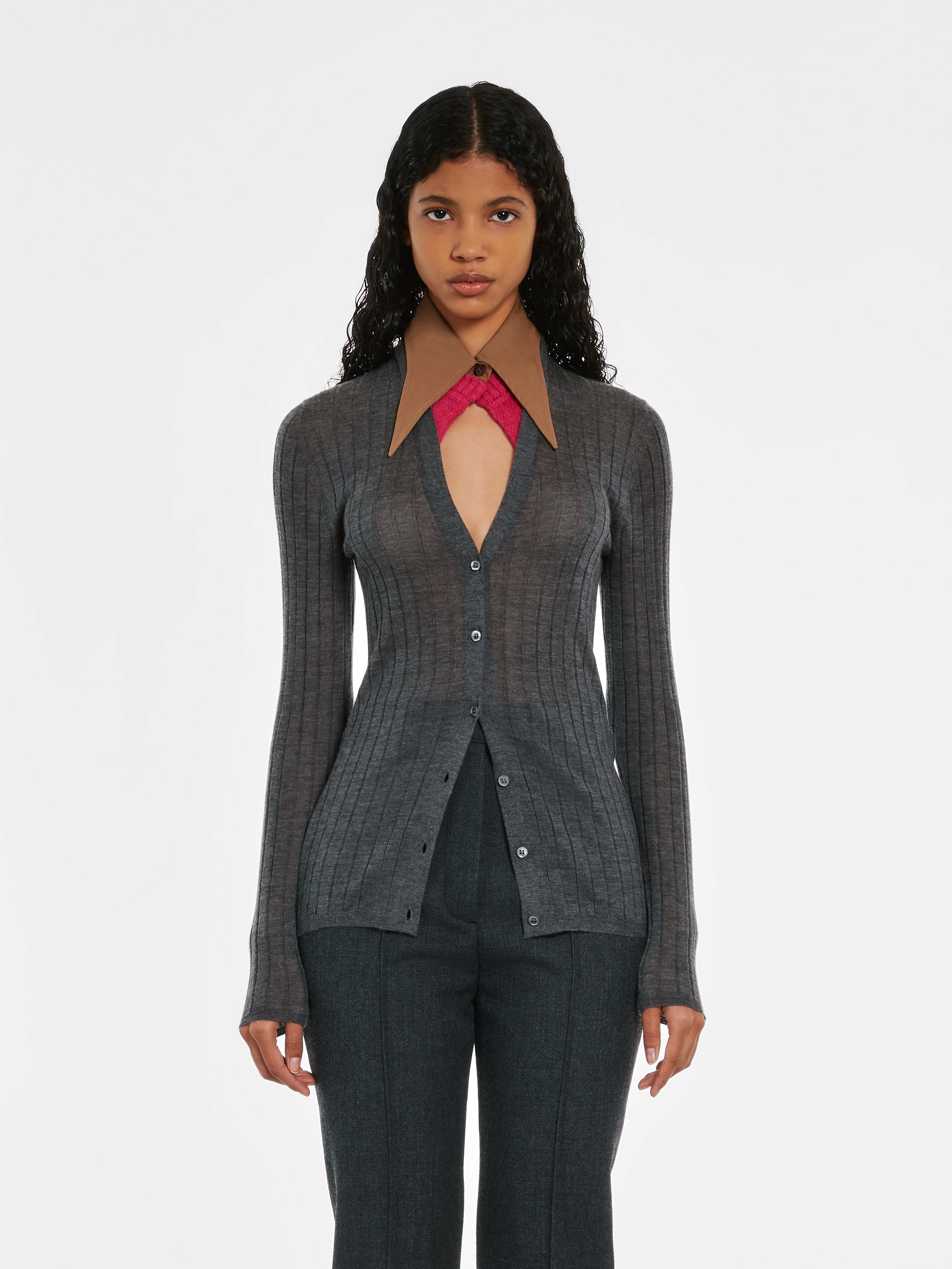 For the Fall Winter collection 2023, masculine silhouettes inspire new elements, in a combination of subtle contrasts and innovative details. The cashmere and silk cardigan, a classic design with sleek lines, is revolutionized by a wool and poplin collar symbolizing new sartorial sensibility.