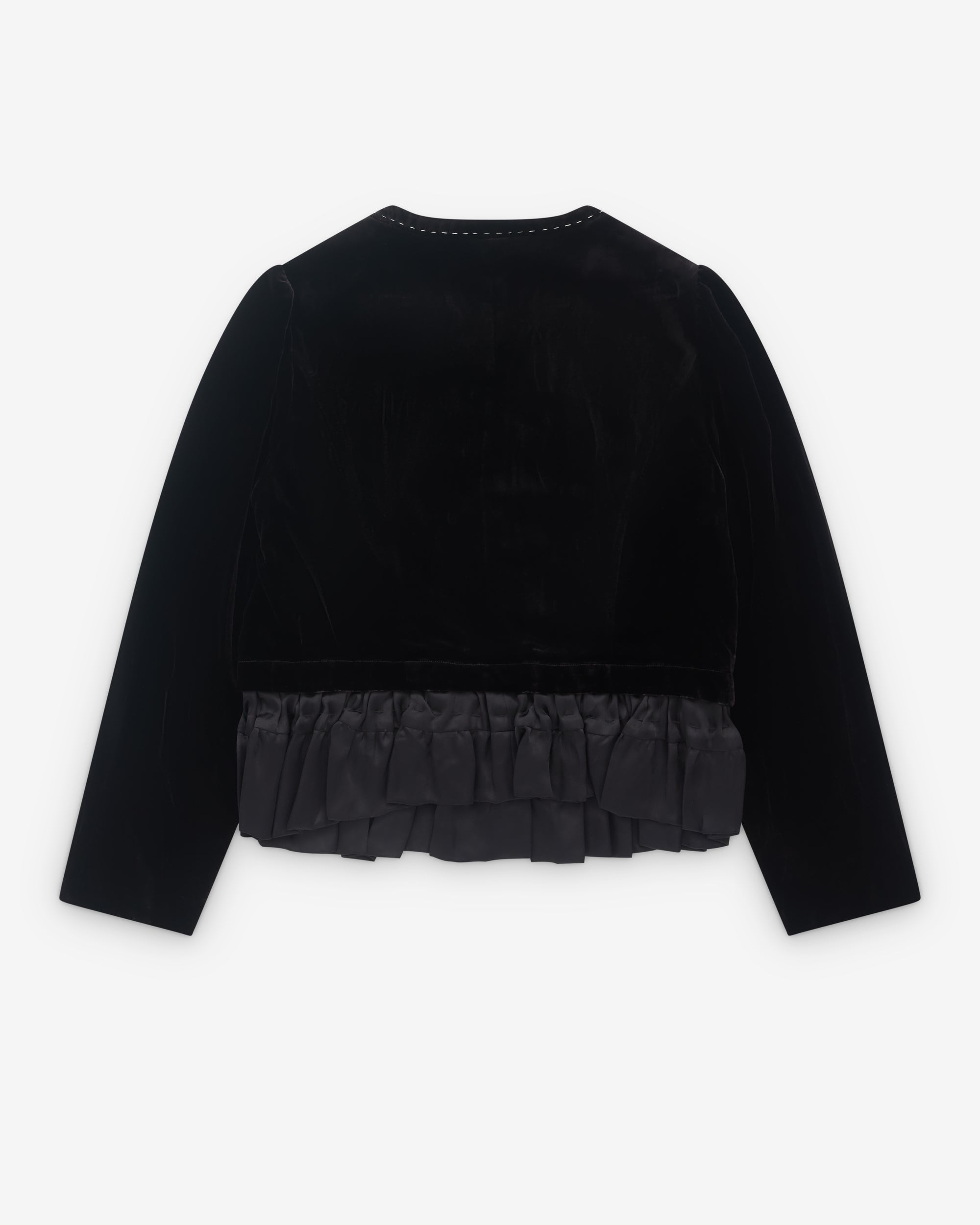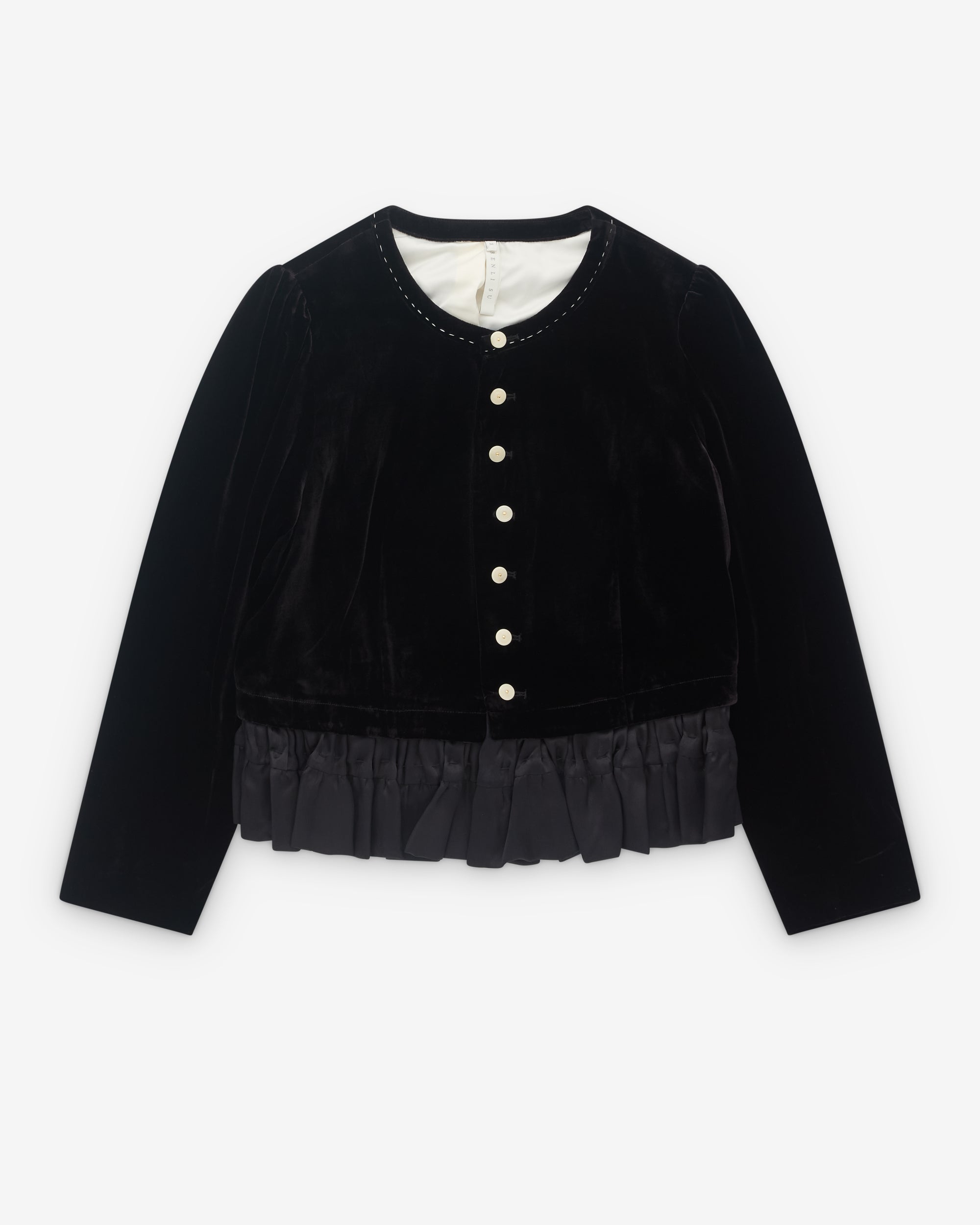 Round neckContrast peplum hemLong sleevesButton fasteningCropped fitLined