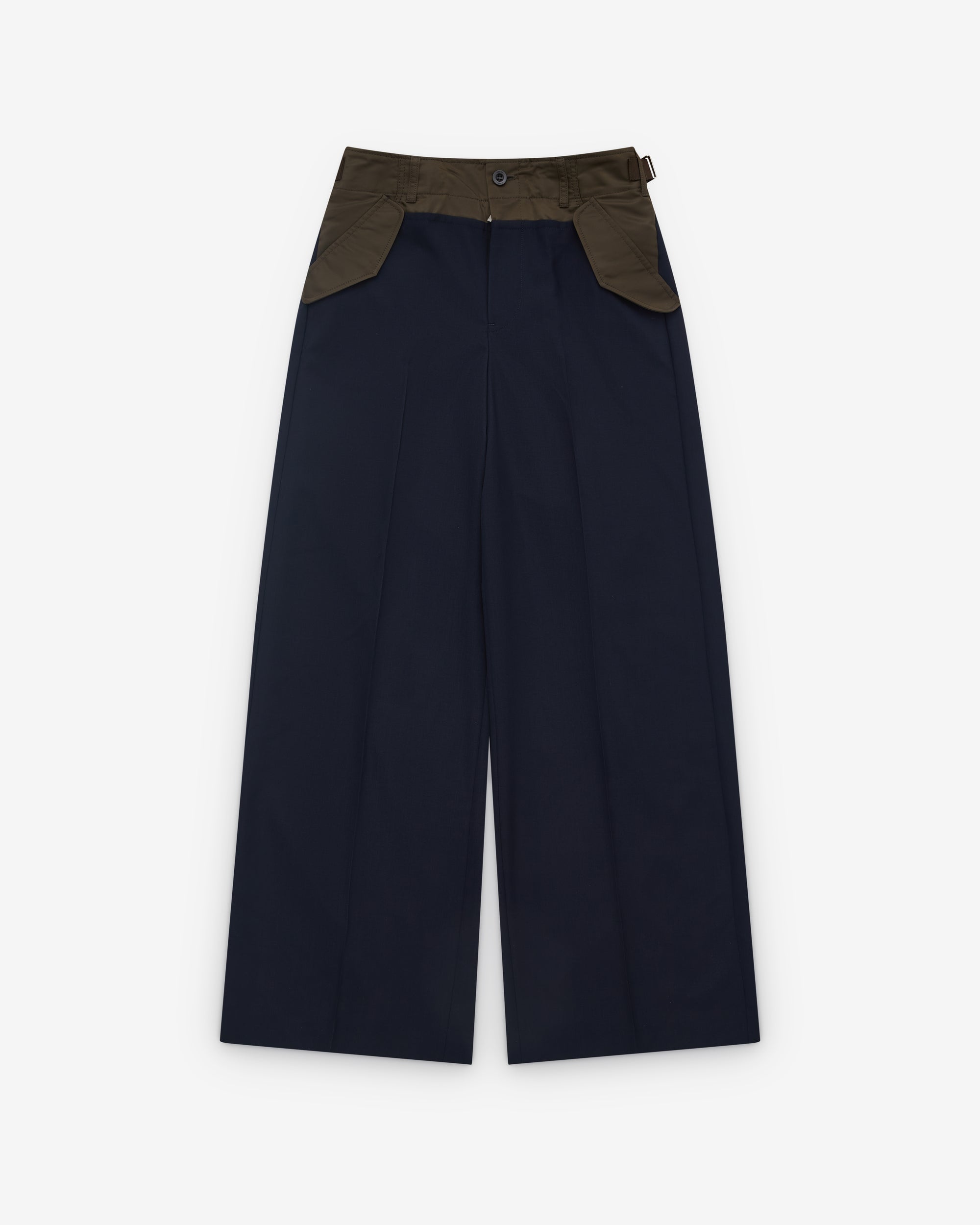 High waistWide legPleatedContrast waistband and pockets Side buckle adjustersBelt loops